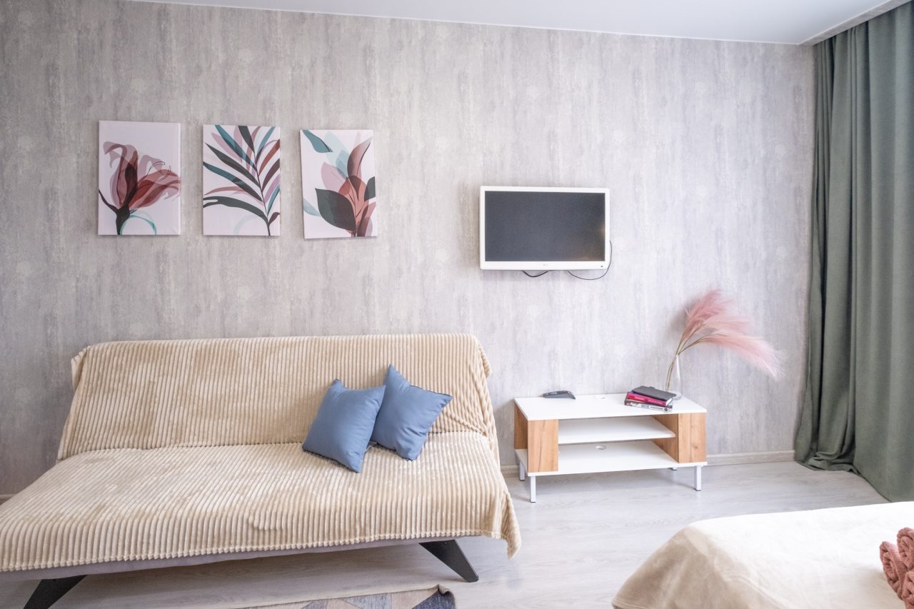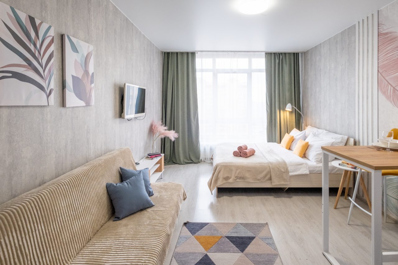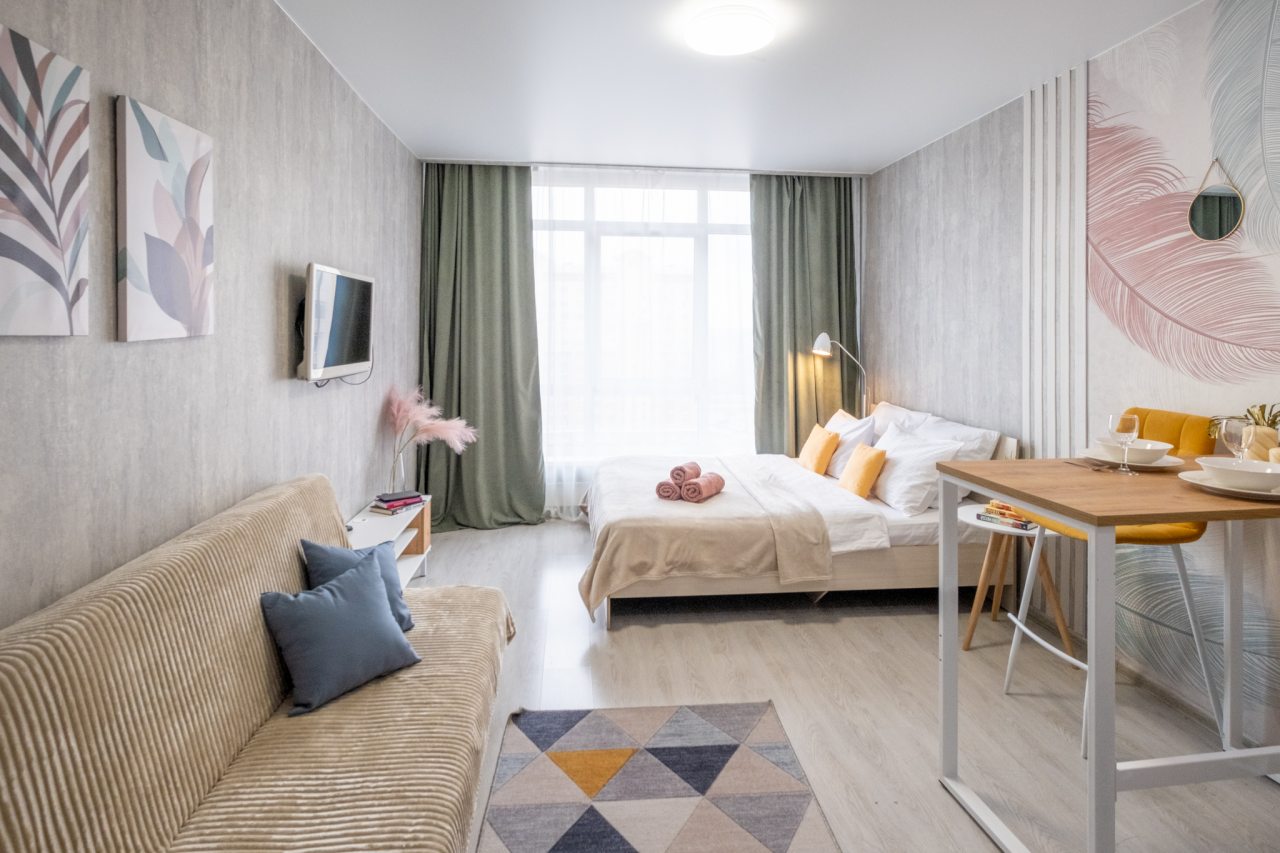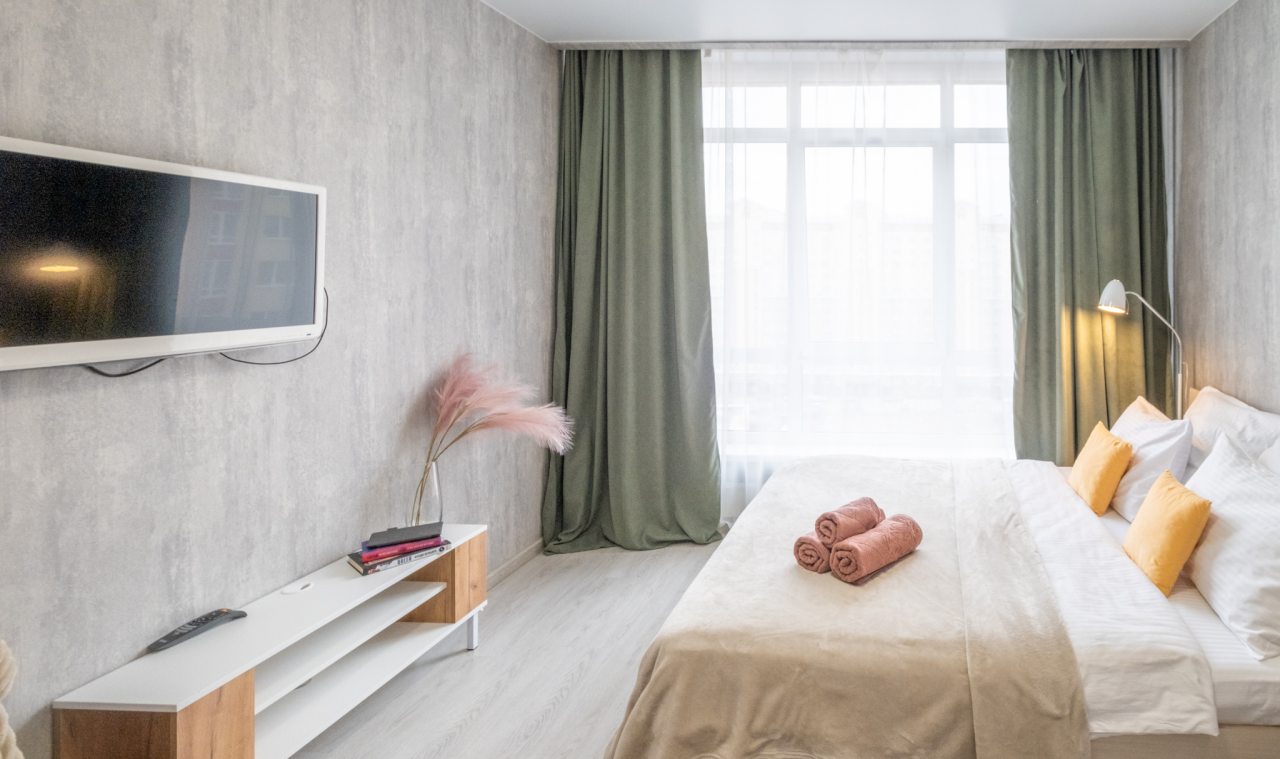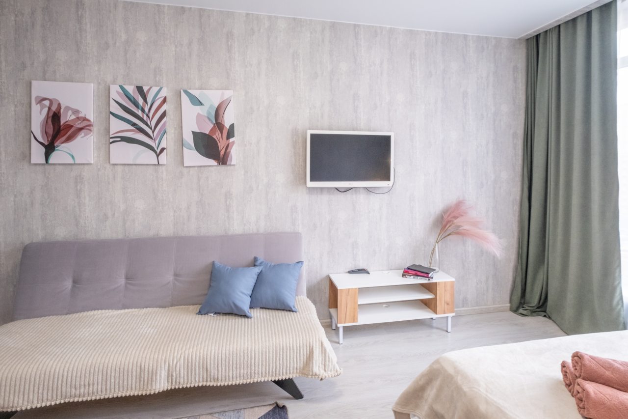 Для пребывания гостей подготовлены современные апартаменты, оформленные в пастельных цветах интерьера. Они укомплектованы мебелью и техникой: двуспальная кровать с комплектом белоснежного постельного белья, мягкий диван, телевизор. В санузле установлена стиральная машинка, есть средства гигиены и набор полотенец.