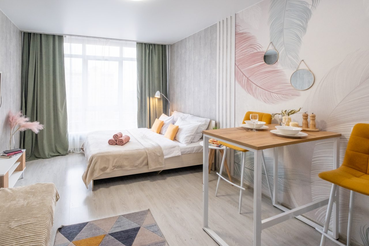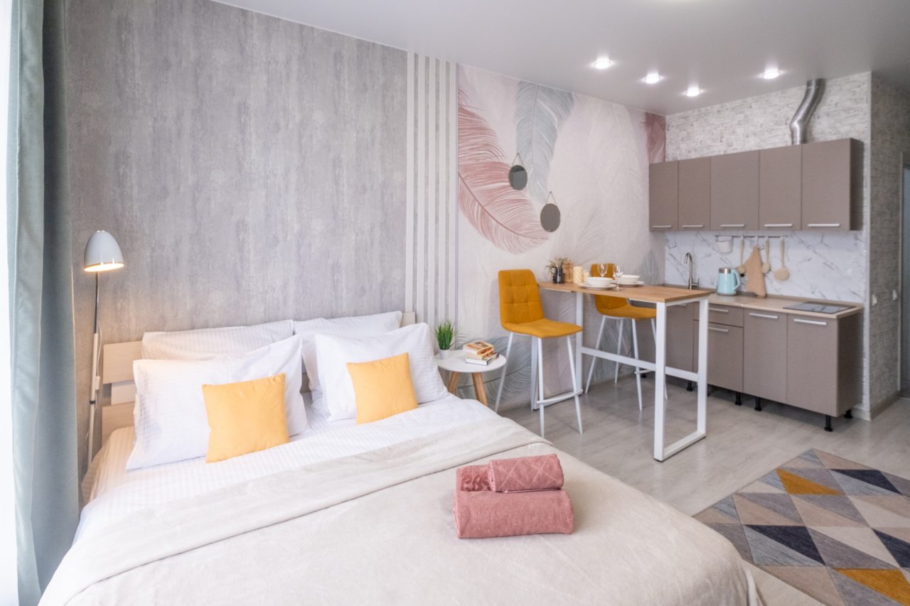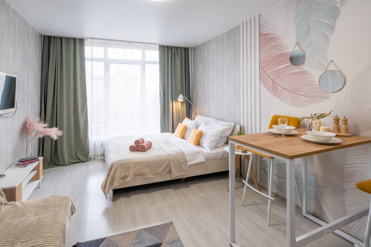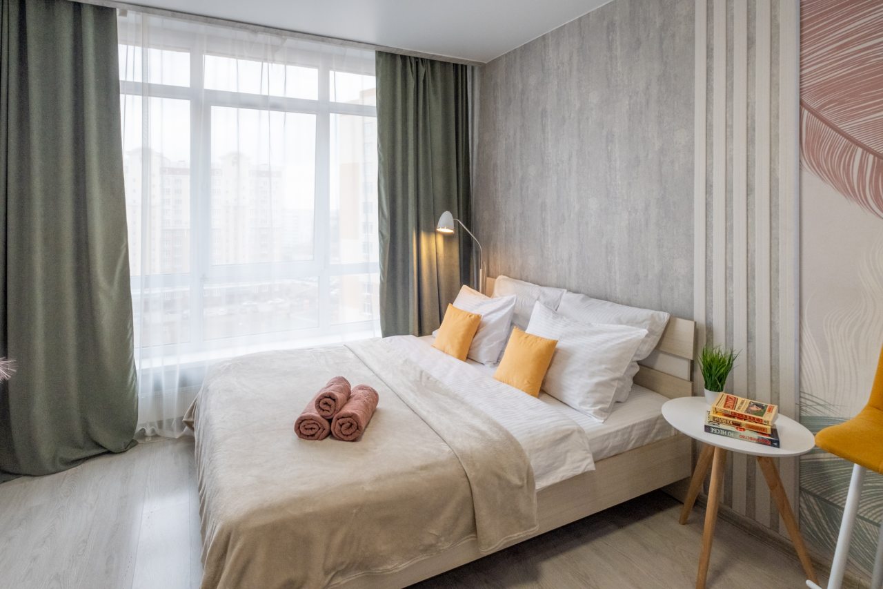 Для пребывания гостей подготовлены современные апартаменты, оформленные в пастельных цветах интерьера. Они укомплектованы мебелью и техникой: двуспальная кровать с комплектом белоснежного постельного белья, мягкий диван, телевизор. В санузле установлена стиральная машинка, есть средства гигиены и набор полотенец.