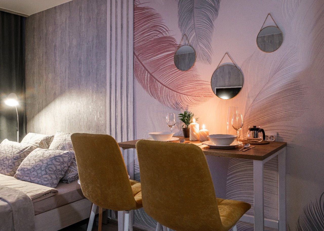 Кухонная зона оснащена барной стойкой, посудой и бытовой техникой для организации питания: варочная панель, электрический чайник. Неподалеку работает кондитерская и сеть быстрого питания, где можно перекусить.