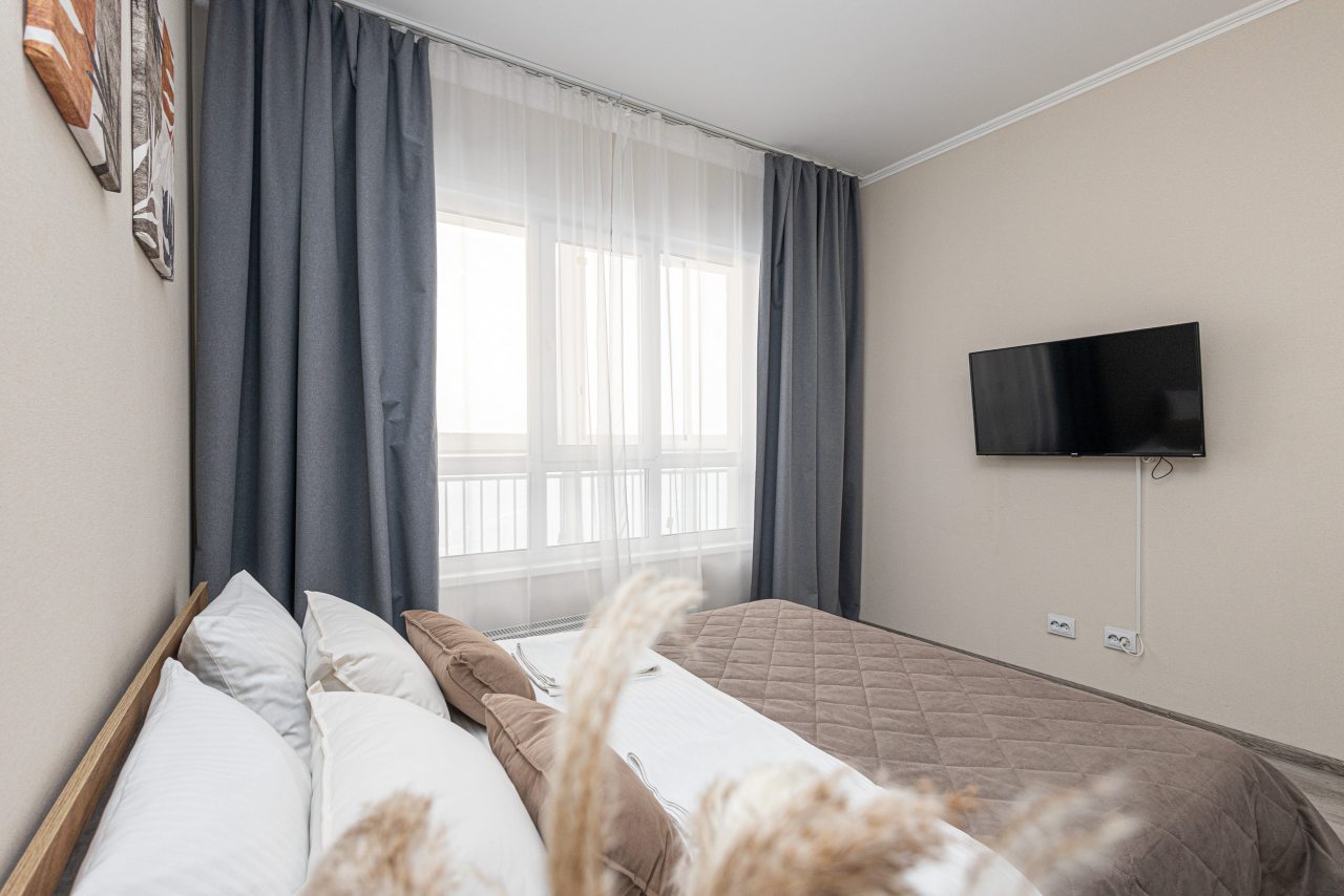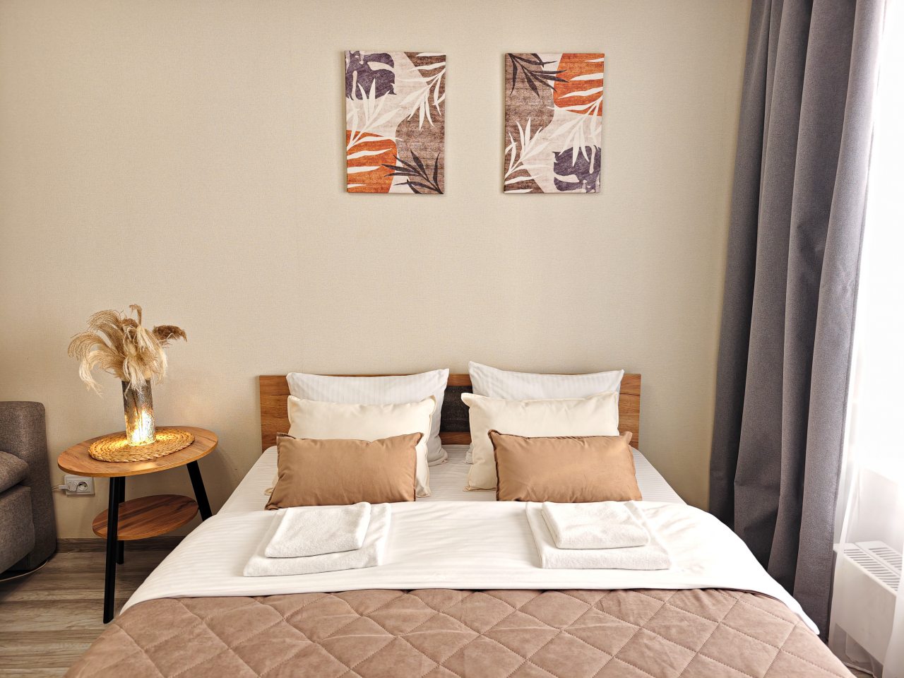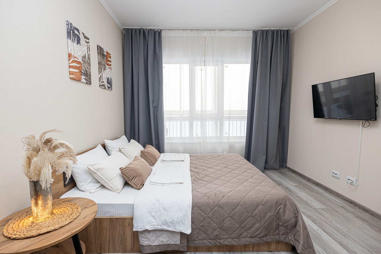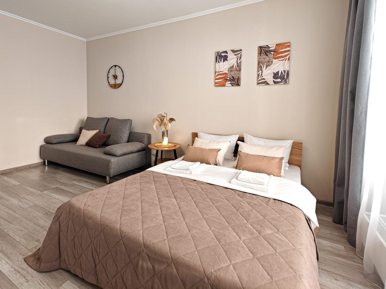 Среди основных удобств, которые ожидают вас внутри: двуспальная кровать с качественным матрасом, затемненные шторы, телевизор, шкаф с зеркалом, мягкий диван, полноценная ванна.