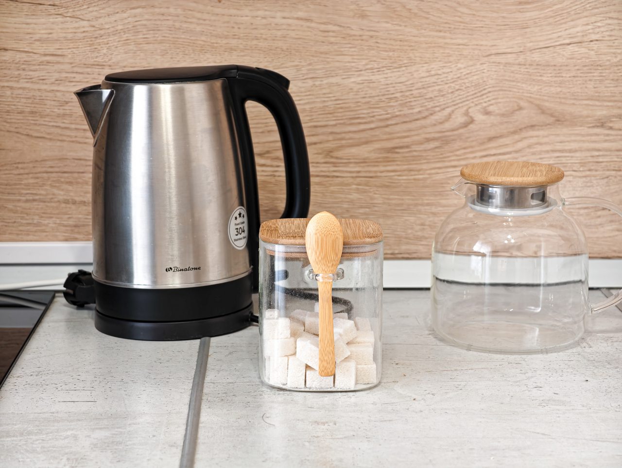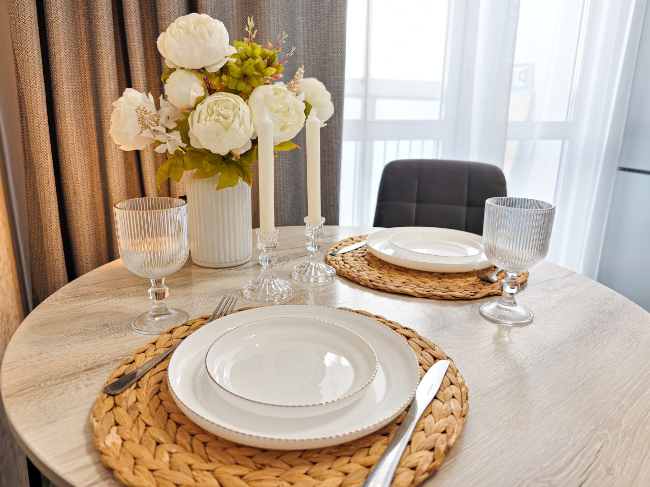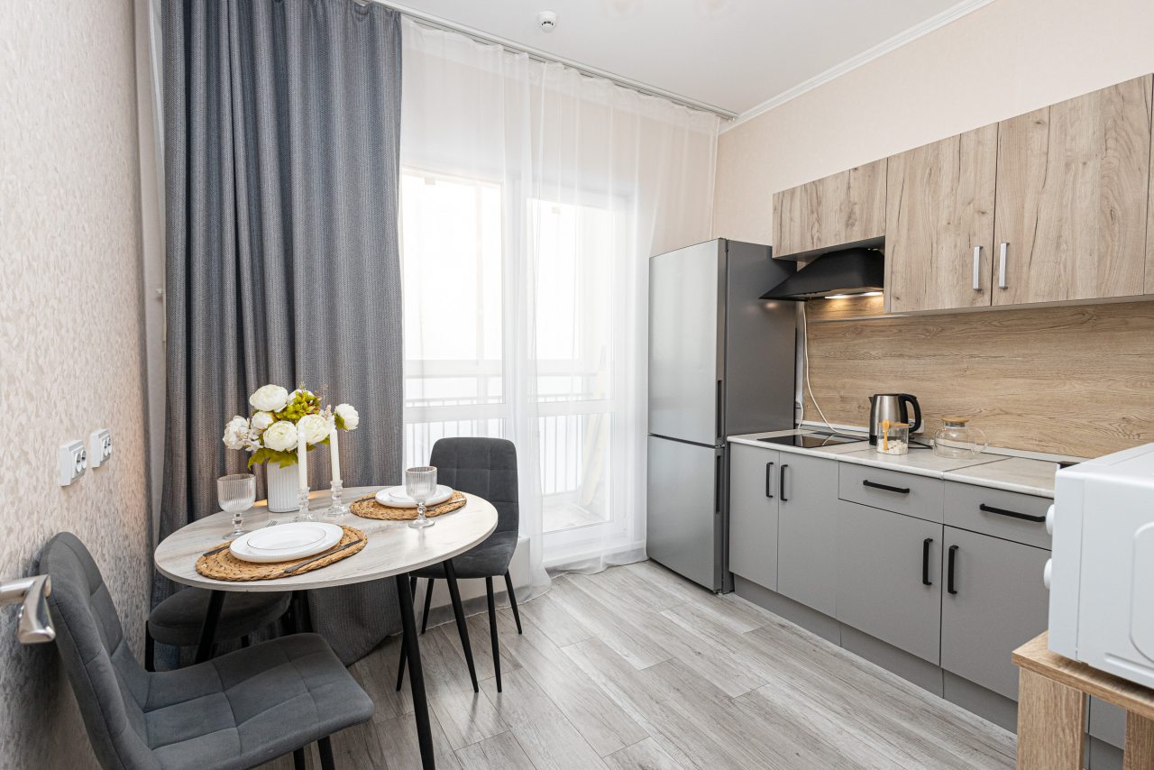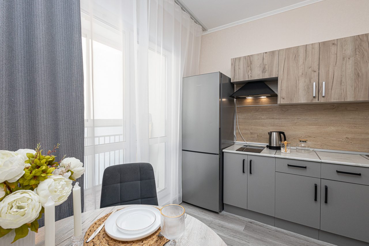 На уютной кухне будет приятно готовить. Из бытовой техники предусмотрены индукционная плита с вытяжкой, СВЧ, чайник, холодильник.