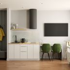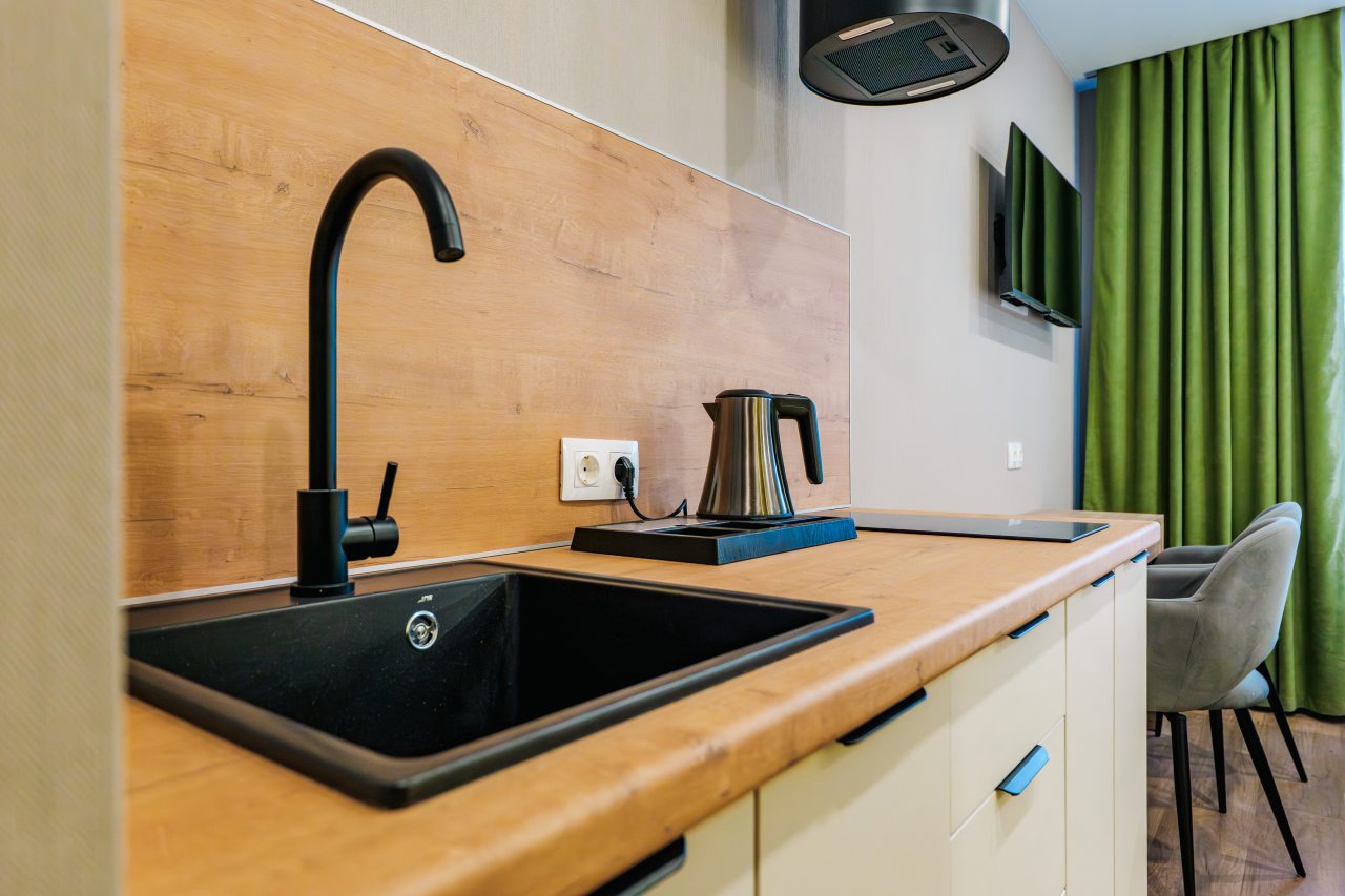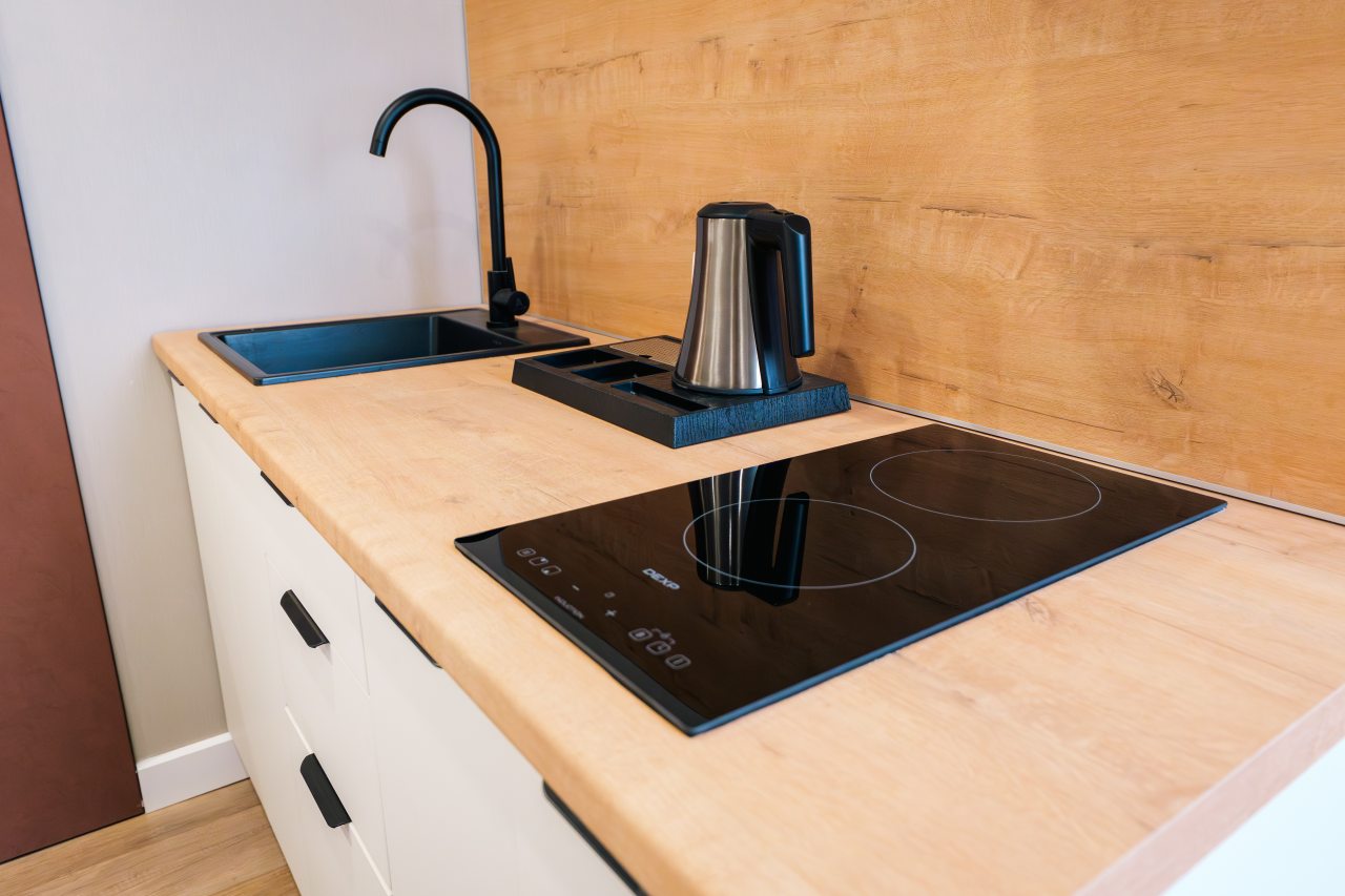 В номерах предусмотрена кухонная зона. где находится варочная панель, электрочайник, холодильник и посуда для самостоятельно организации питания.