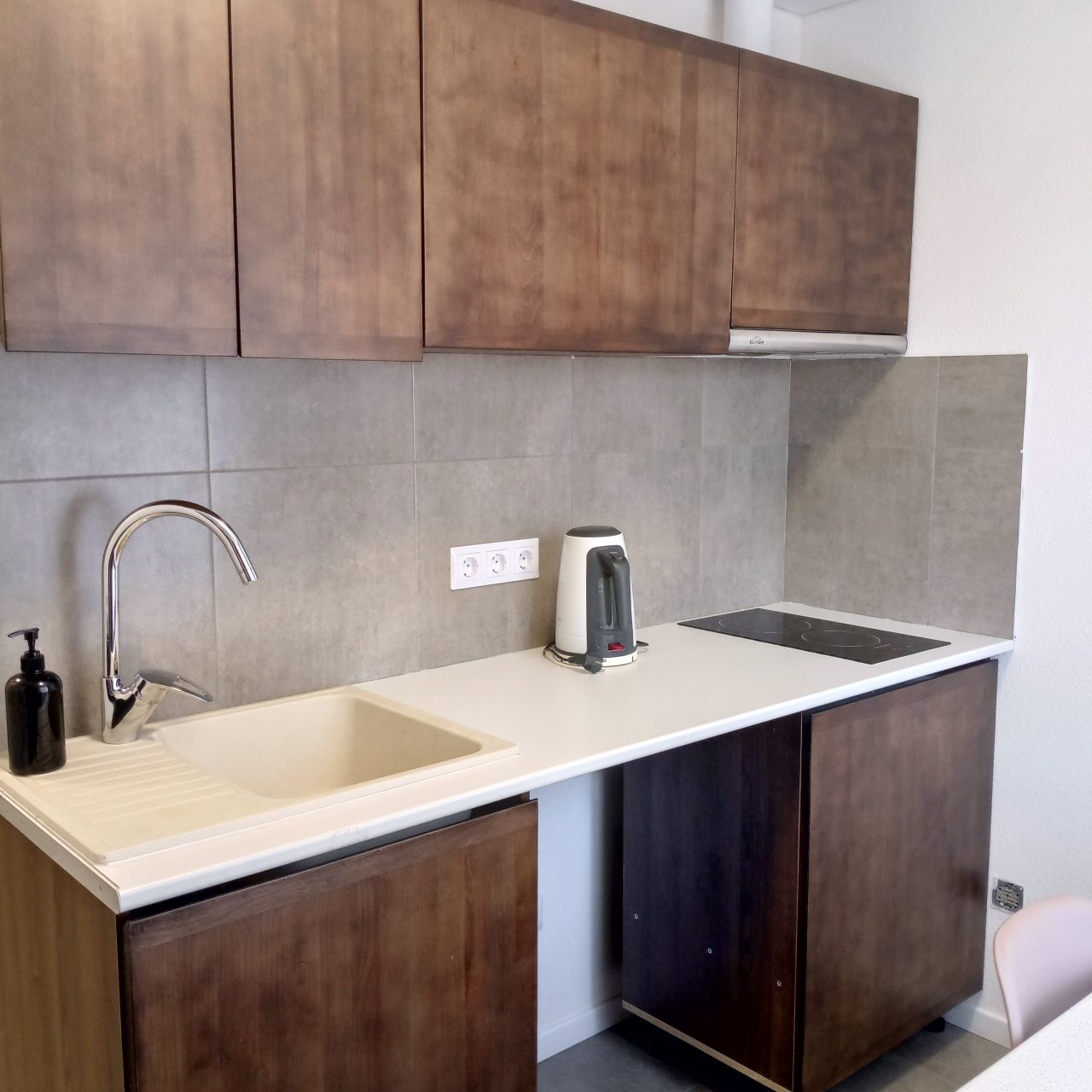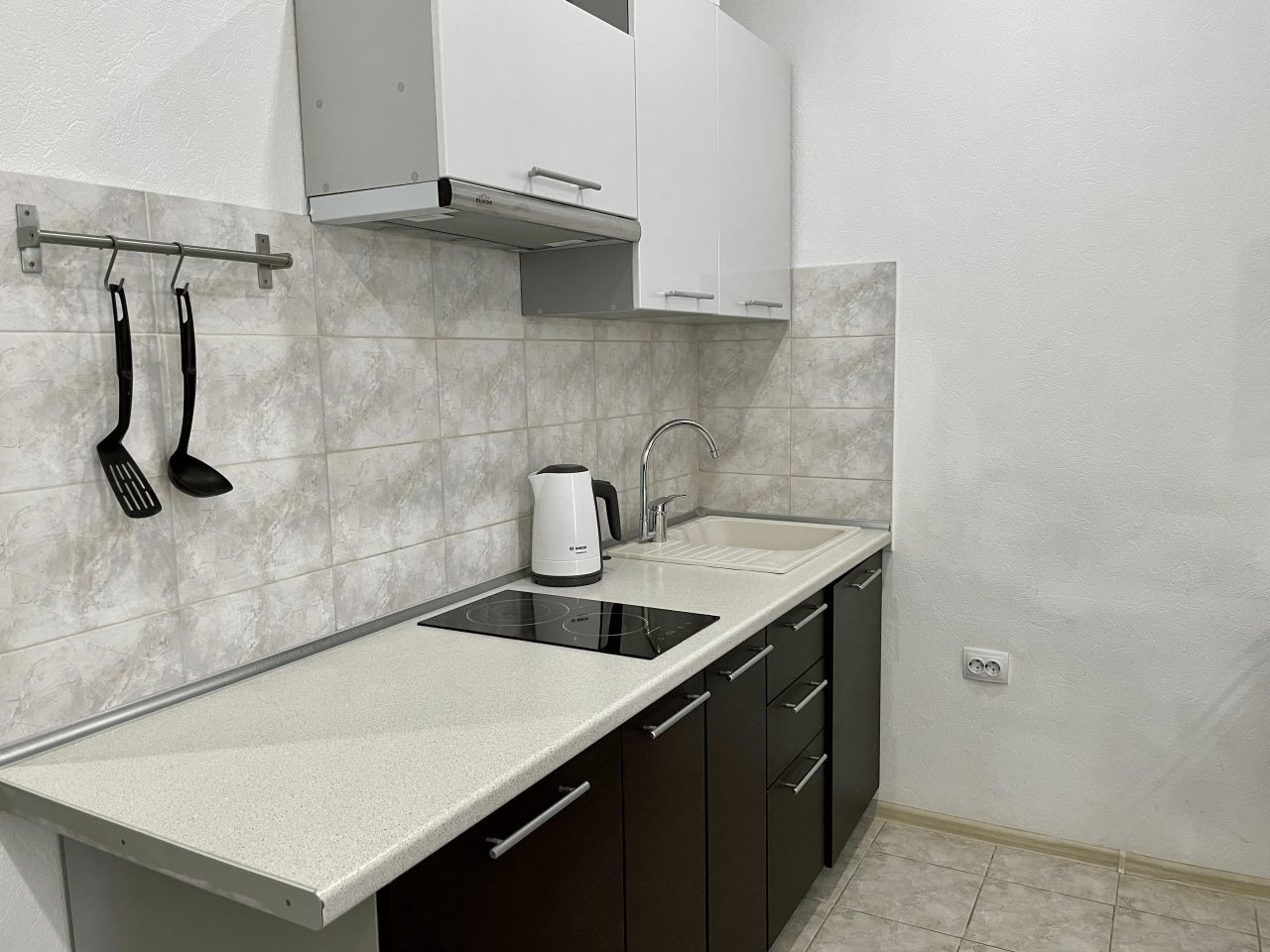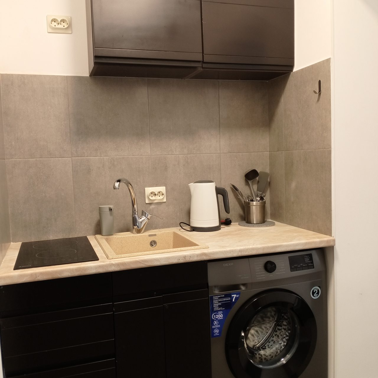 В кухонной зоне размещён гарнитур, необходимая бытовая техника и обеденный уголок. В пешей доступности располагается кафе, продуктовые магазины.