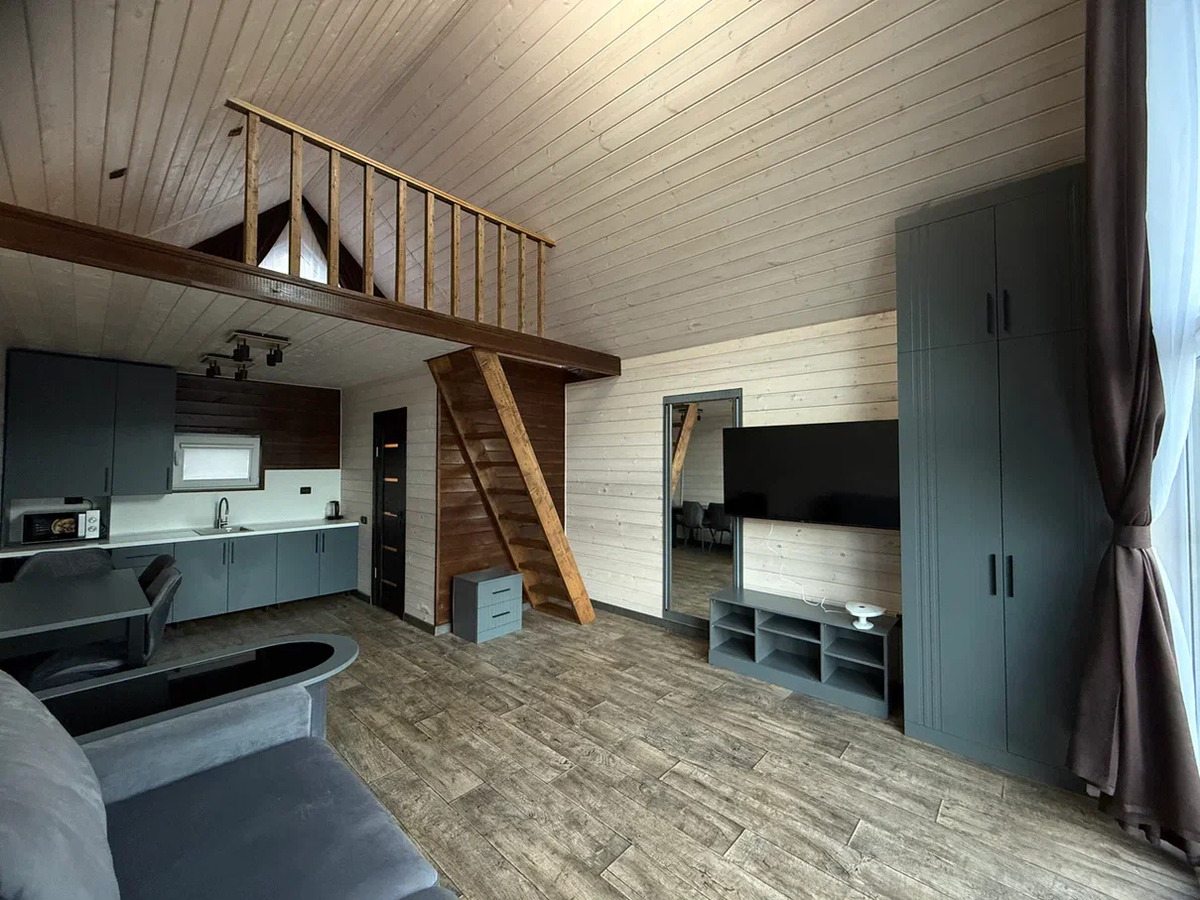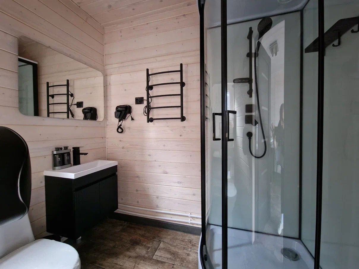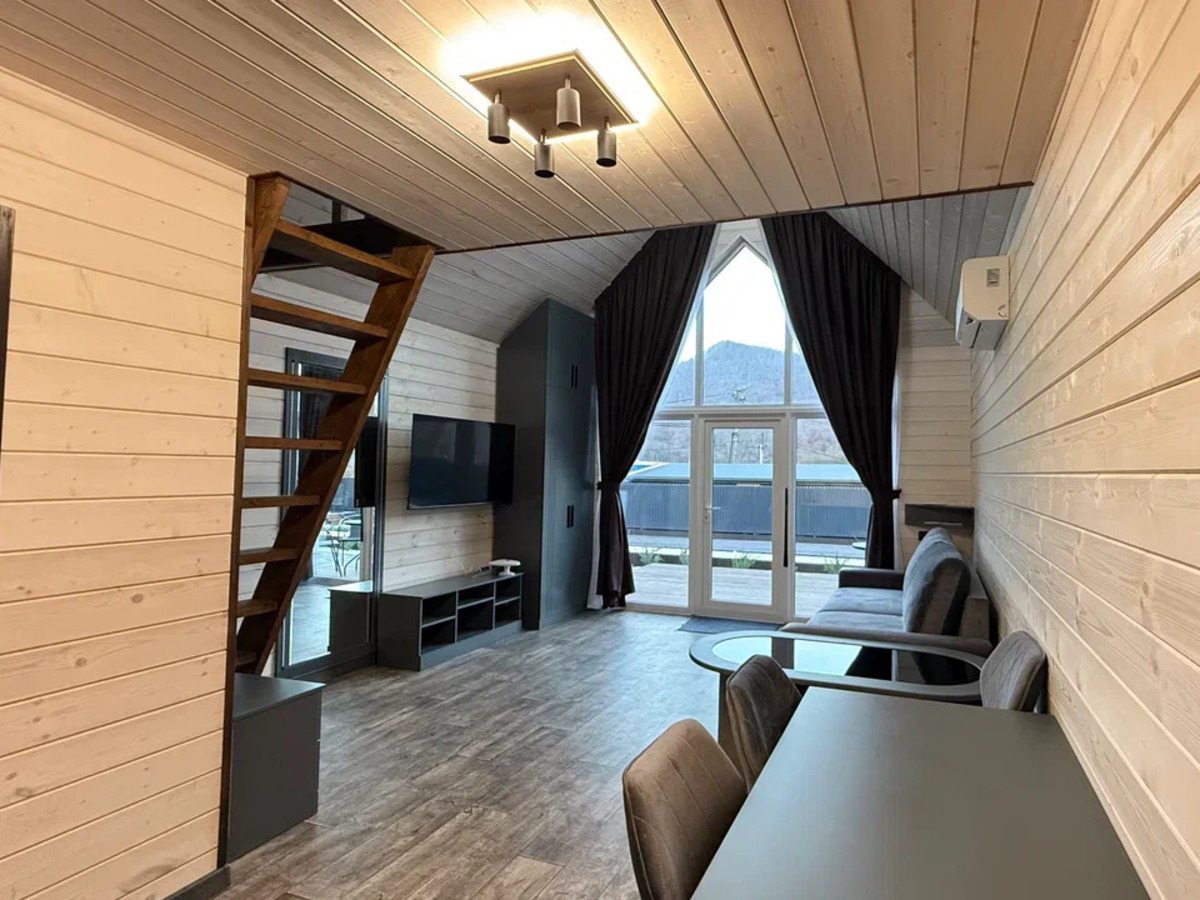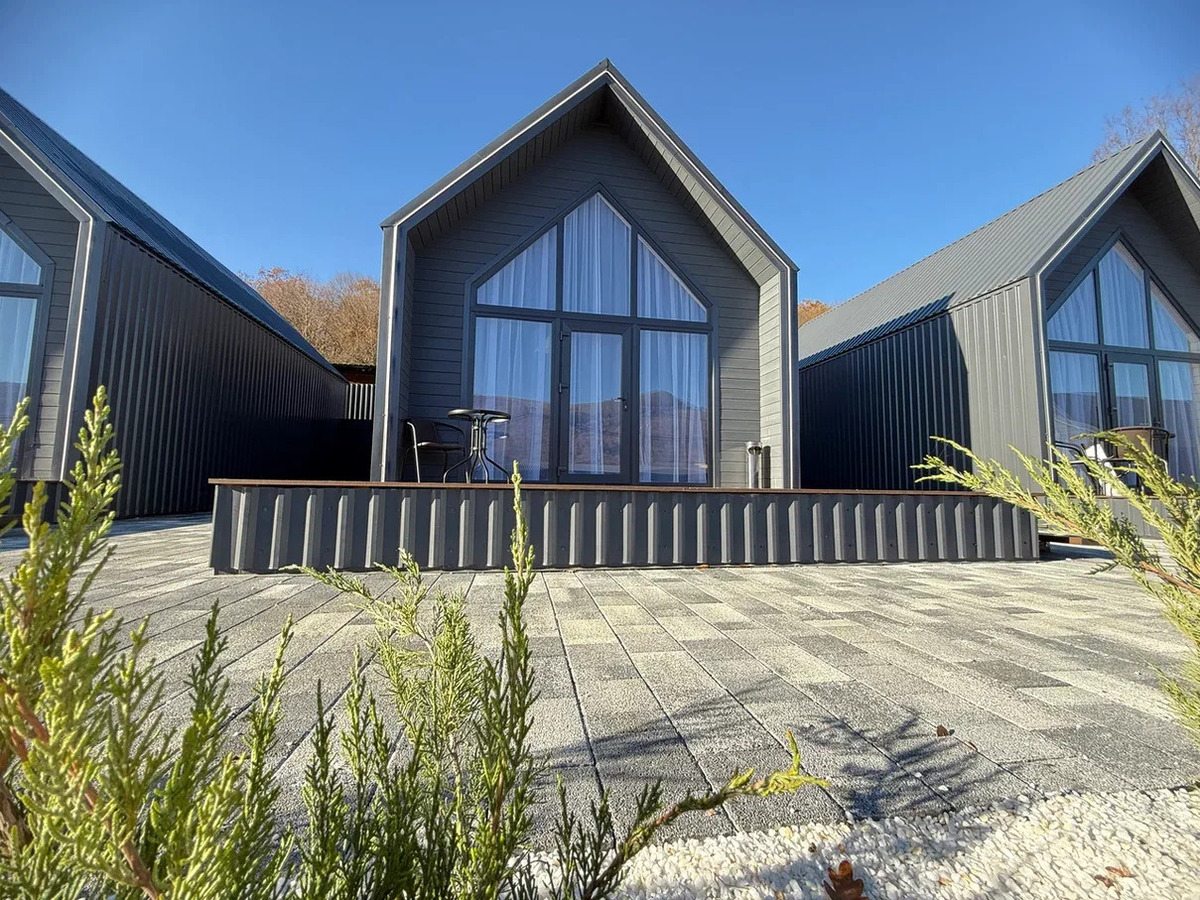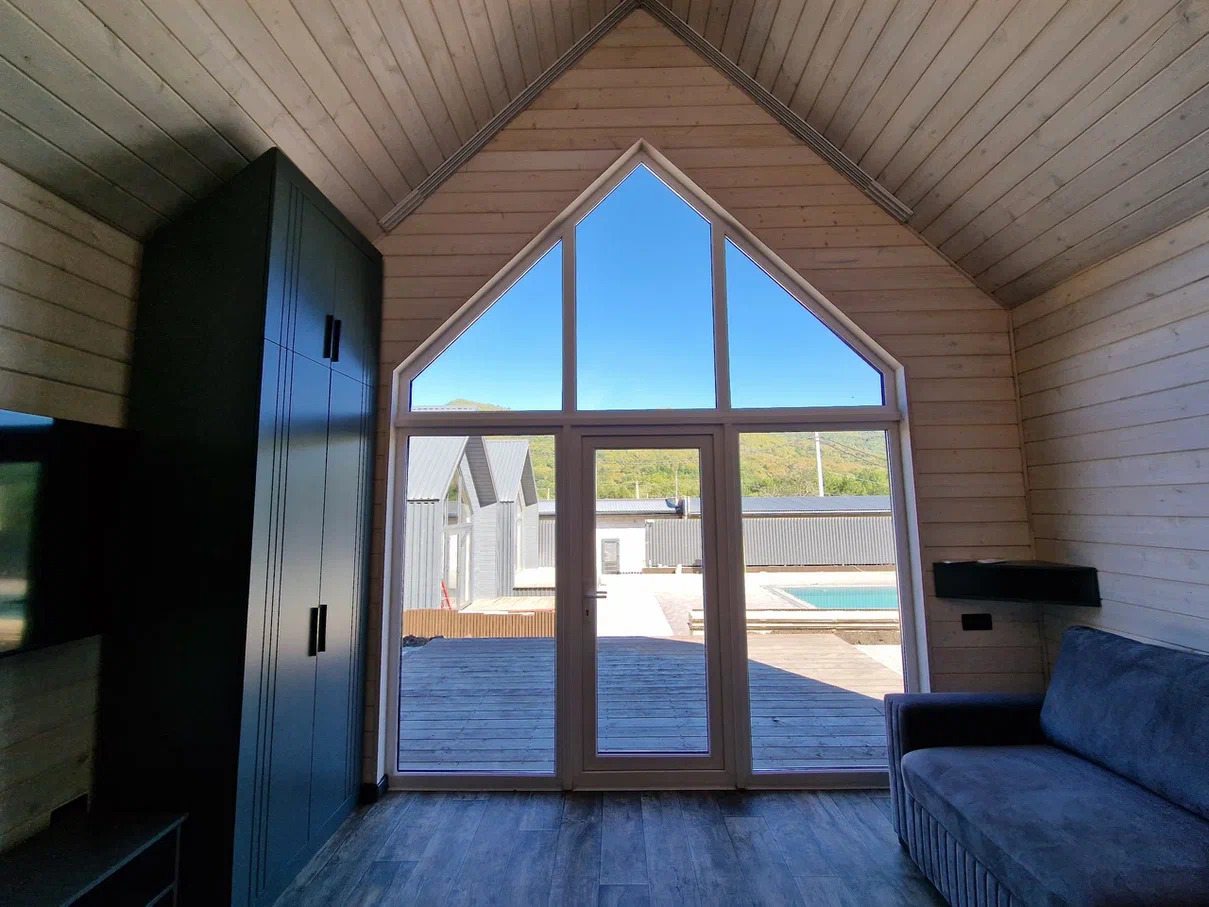 Для проживания предлагаются стильные и комфортабельные а-фрейм дома с панорамными окнами. Внутри предусмотрены удобные спальные места, телевизор, сплит-система, большой шкаф, индивидуальный санузел с душем и феном.