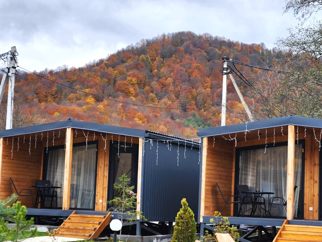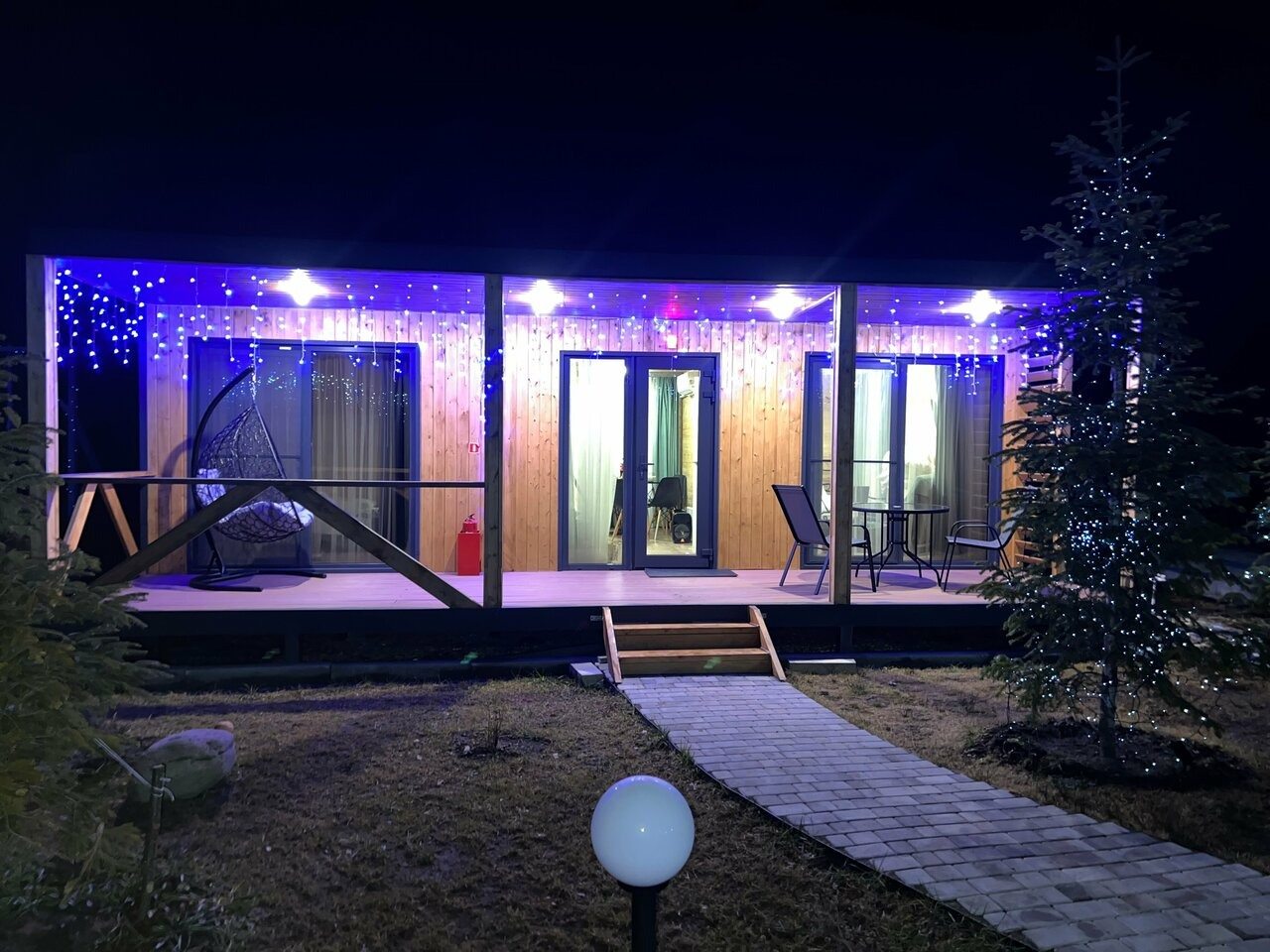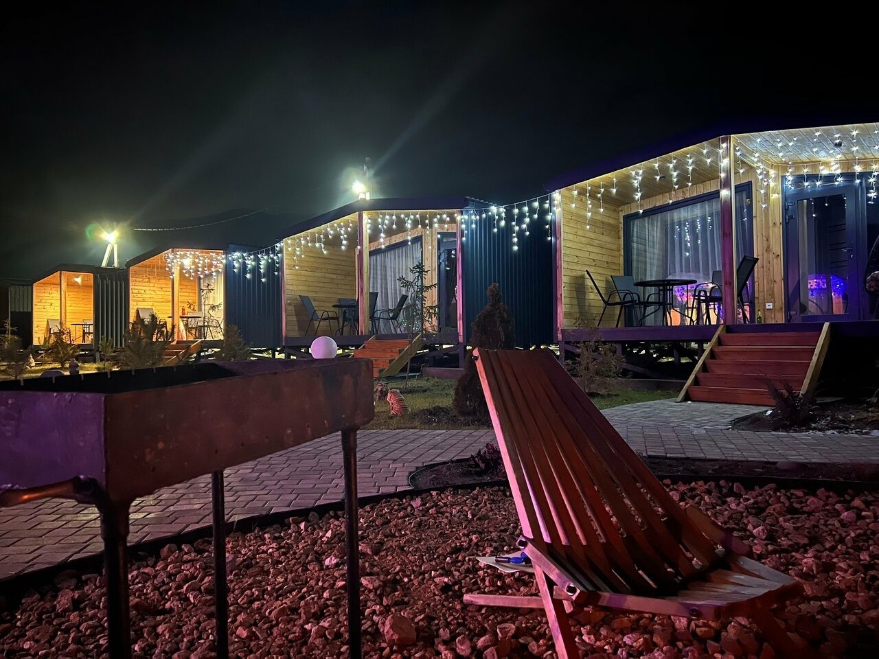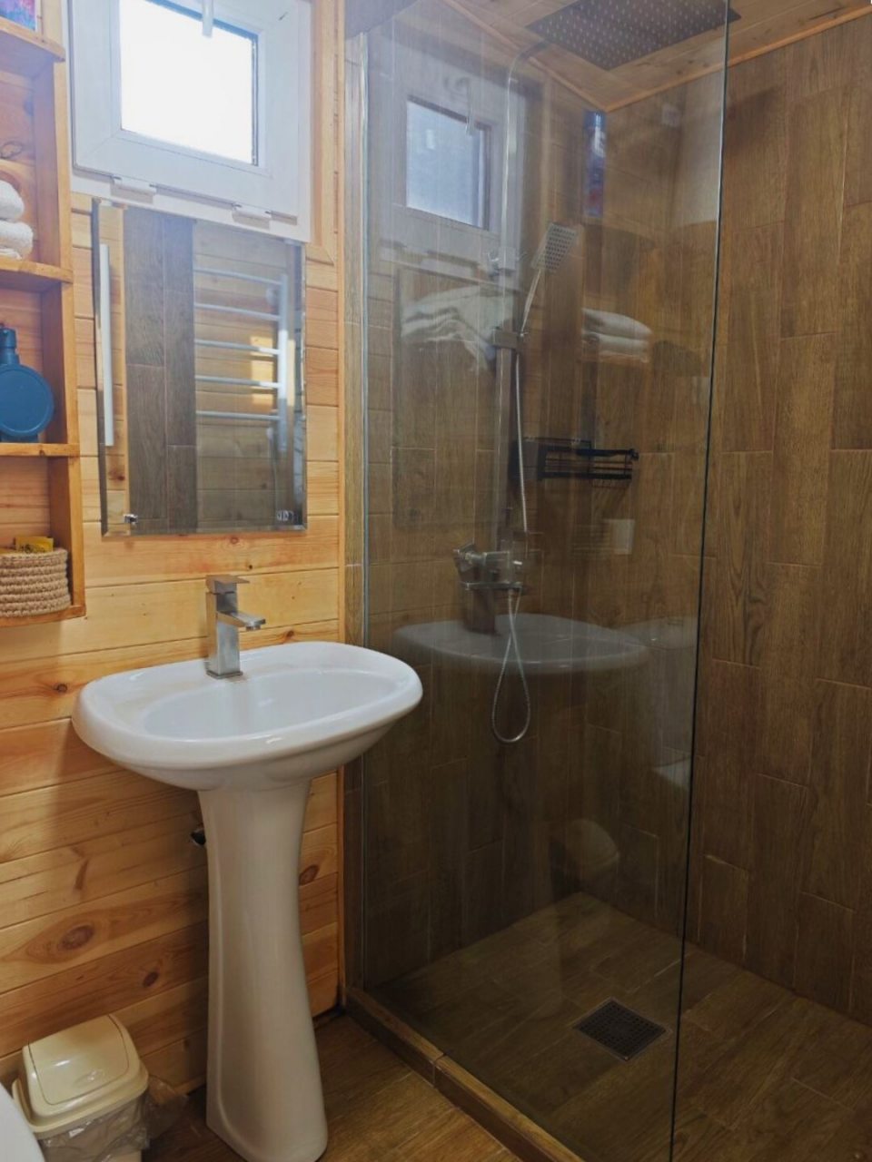 Каждый имеет разную степень вместимости, вы выбираете в зависимости от вашего запроса. Внутри домики оснащены всем необходимым: большой кроватью со свежим бельём, вместительным диваном, креслом, телевизором, тумбочкой. Чтобы быть на связи работает высокоскоростной интернет. В ванной комнате установлена сантехника, есть набор полотенец.