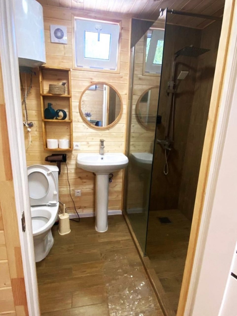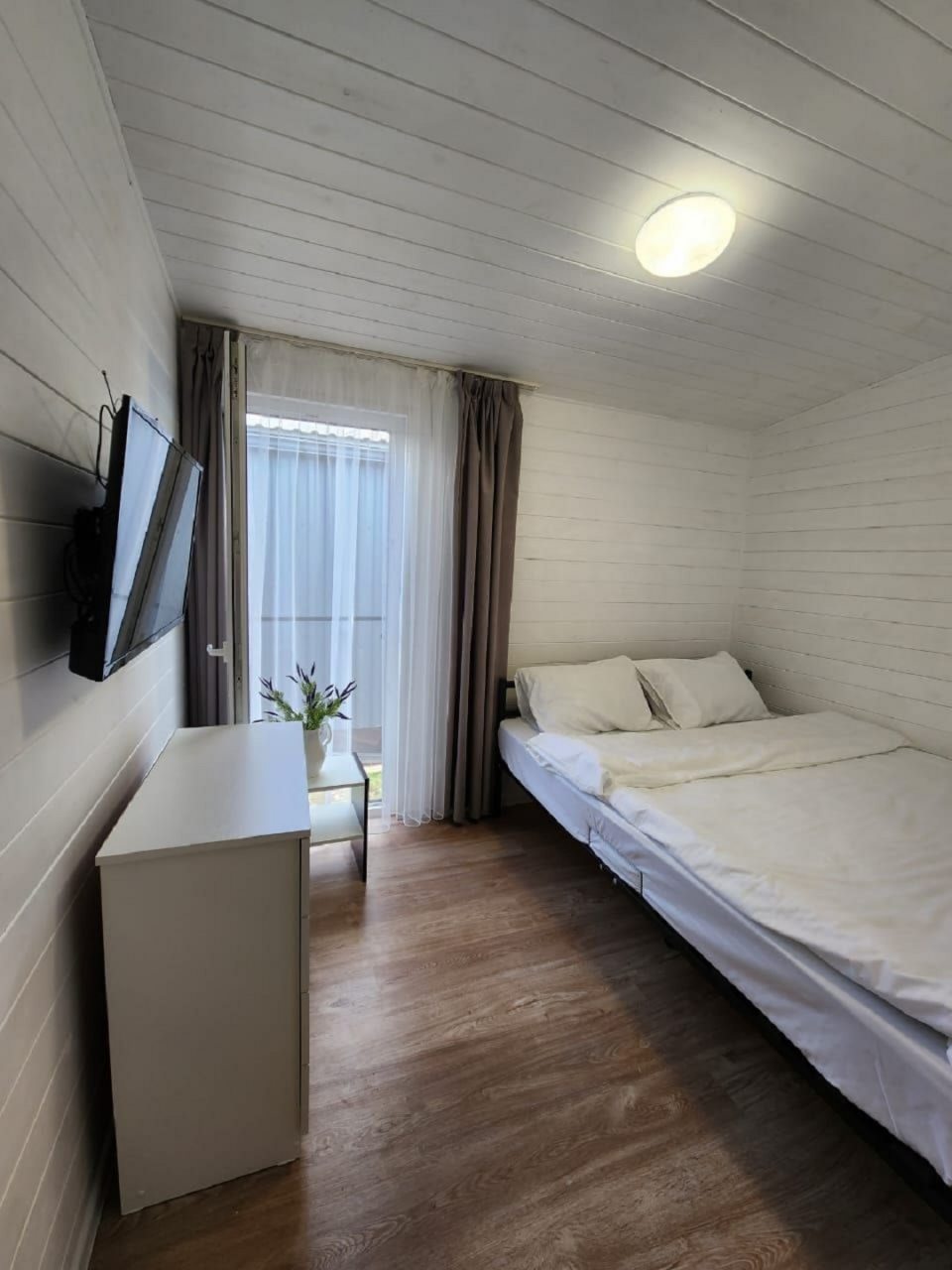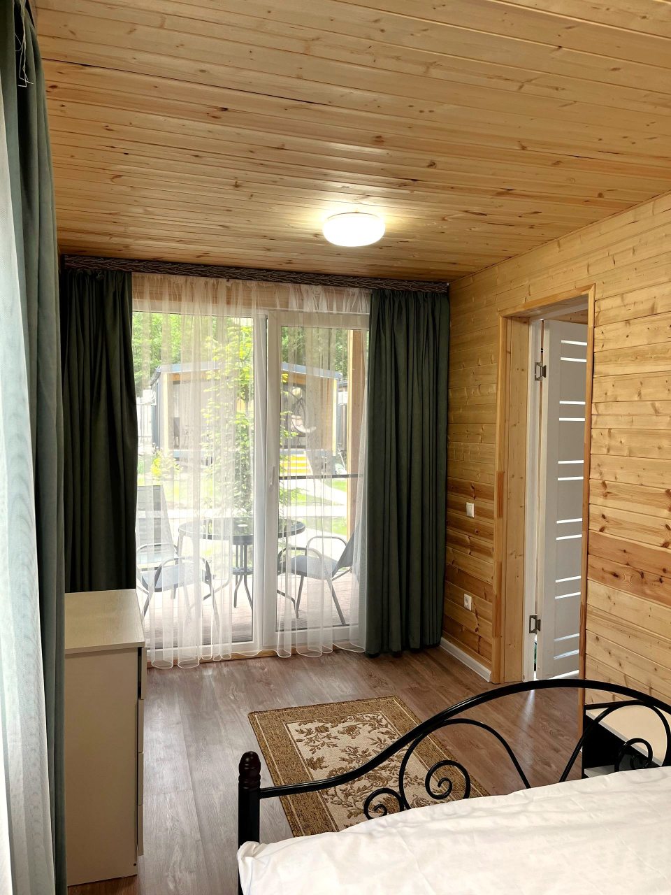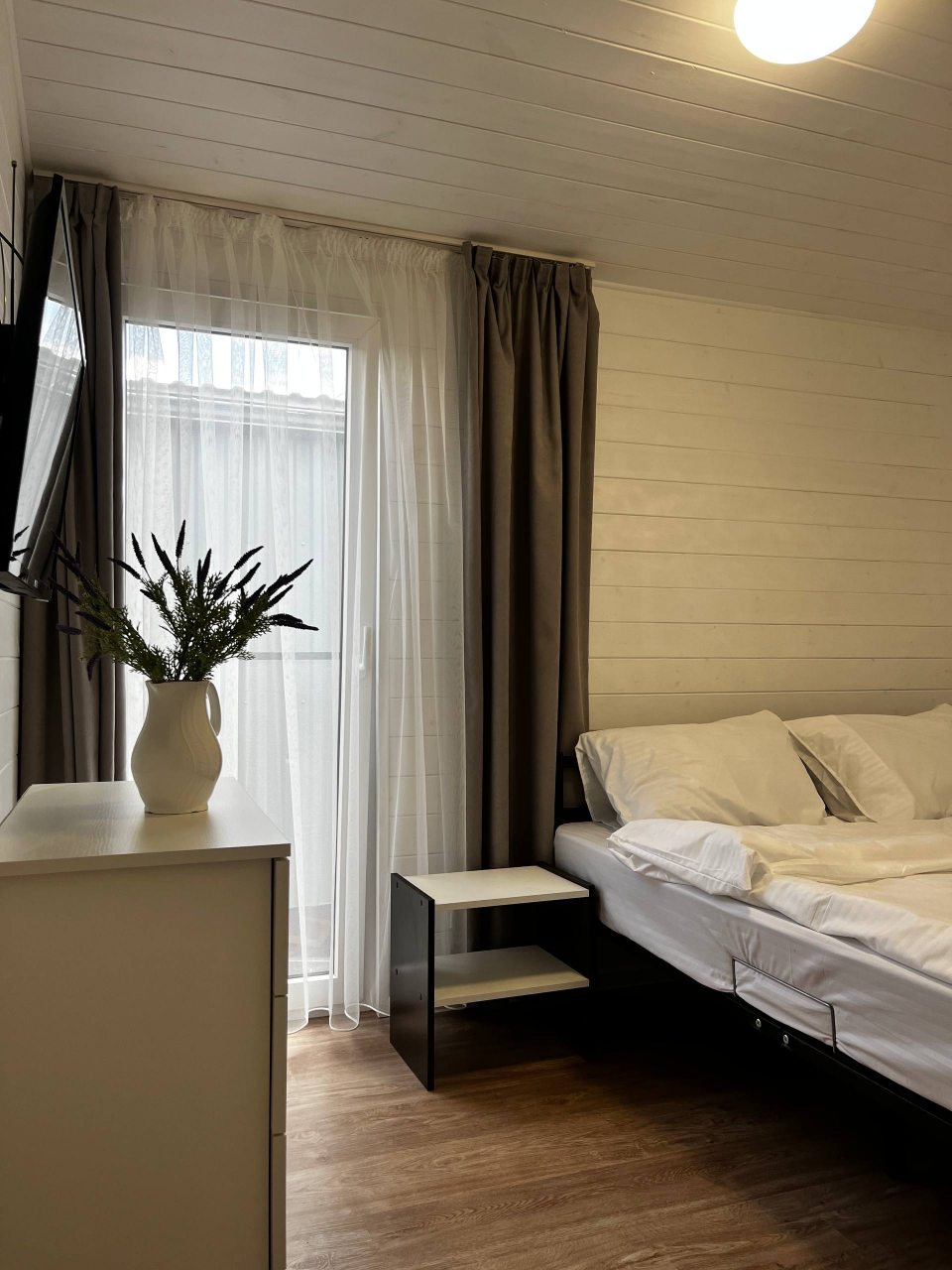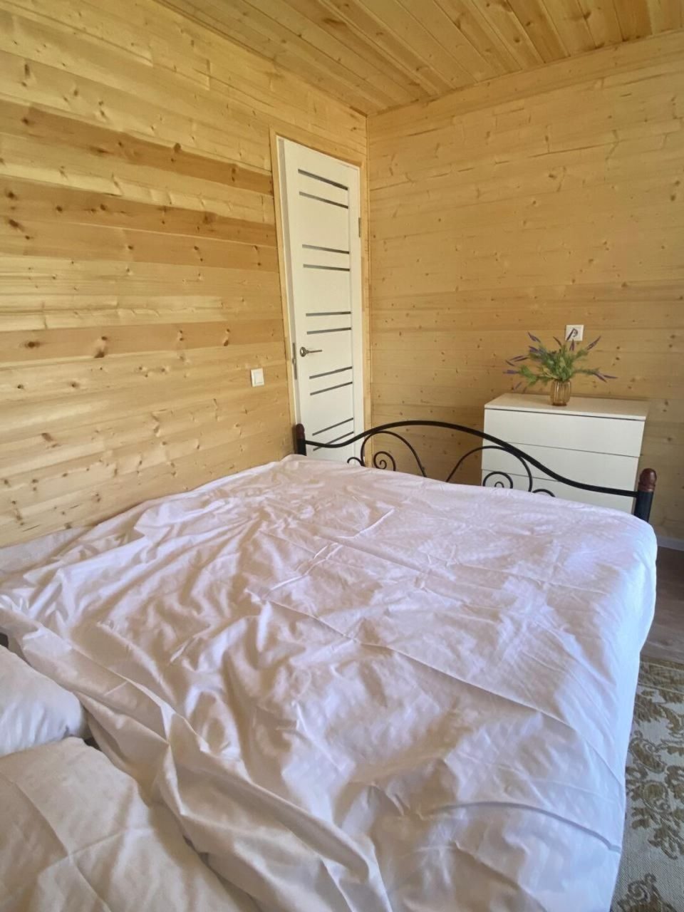 Каждый имеет разную степень вместимости, вы выбираете в зависимости от вашего запроса. Внутри домики оснащены всем необходимым: большой кроватью со свежим бельём, вместительным диваном, креслом, телевизором, тумбочкой. Чтобы быть на связи работает высокоскоростной интернет. В ванной комнате установлена сантехника, есть набор полотенец.