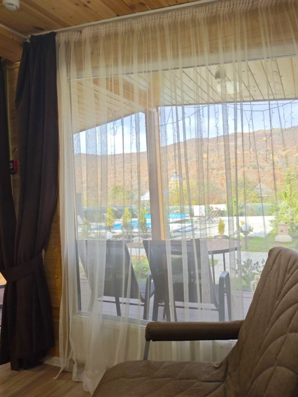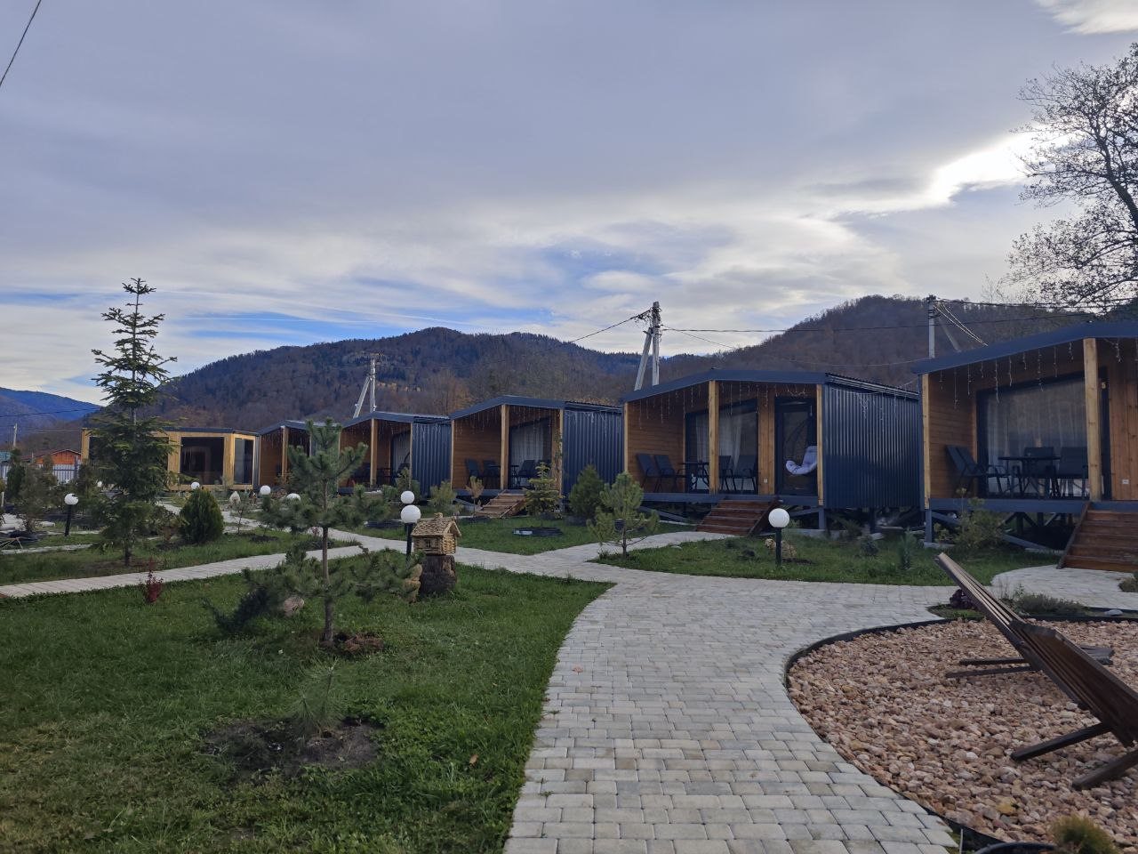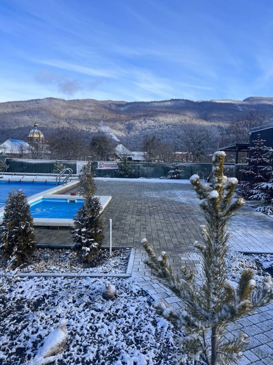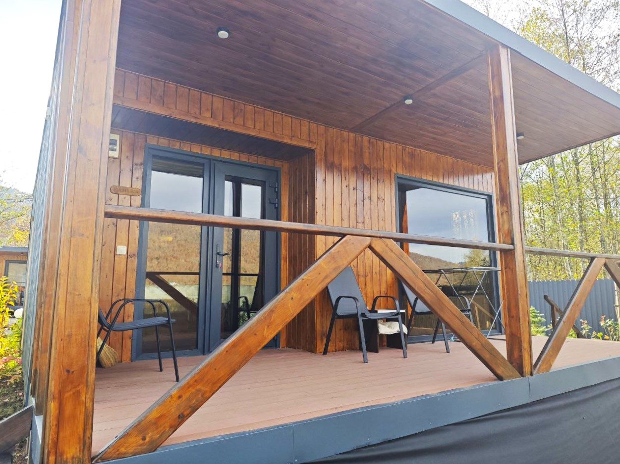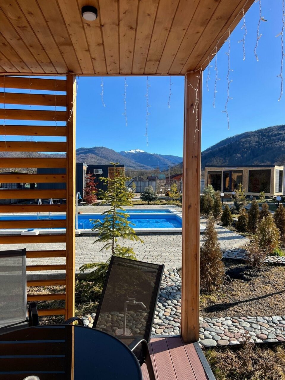 Отдыхали с 28-30 марта 2025 г. Хотелось подальше от суеты и шума уехать.И мы не прогадали!!! Отель находится в стороне от дороги, с видом на горы и небольшую церквушку. На территории отеля чисто и ухожено, с парковочными местами проблем нет. Есть мангальная зона, где имеются все принадлежности для приготовления мяса, овощей, и т. д, бассейн с теплой водой ( 40 гр.), и сауна с купелью на улице. Для маленьких гостей есть небольшая игровая зона). Мы арендовали 5-местный домик, в котором имеется всё необходимое для комфортного проживания (холодильник, микроволновая печь, электрическая плита, посуда, столовые приборы). В домике оооочень уютно, а как замечательно сидеть по утрам на террасе с чашкой кофе, слушая звуки природы и вдыхая чистый горный воздух. Персонал доброжелательный и всегда подскажет, если возникнут вопросы.