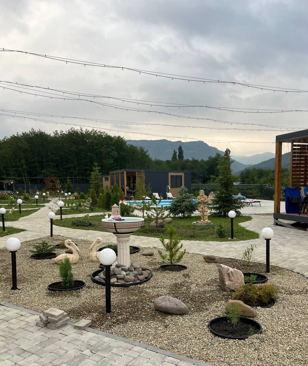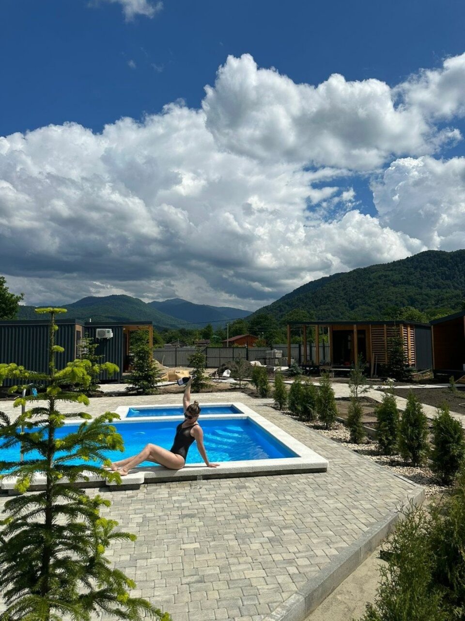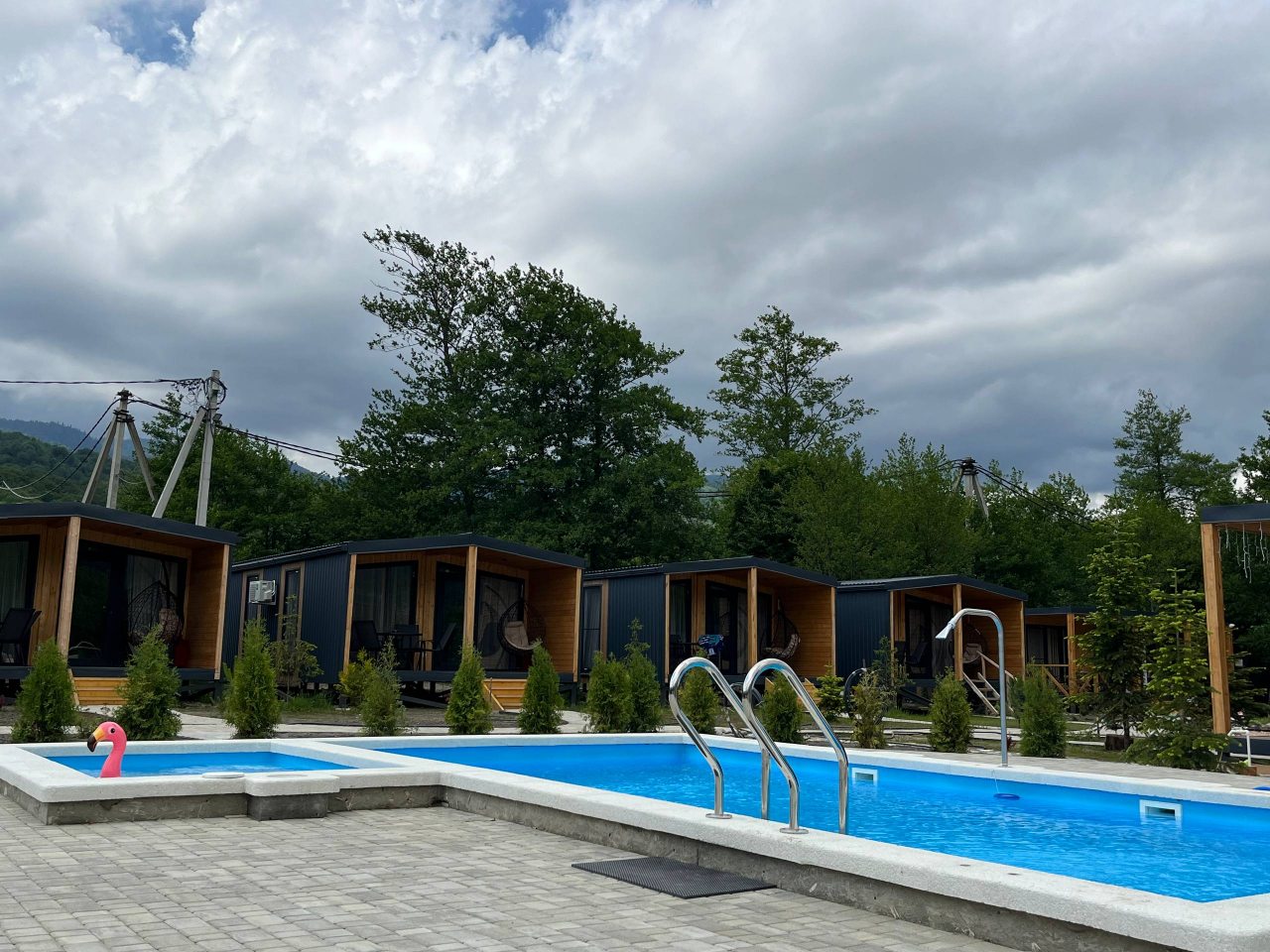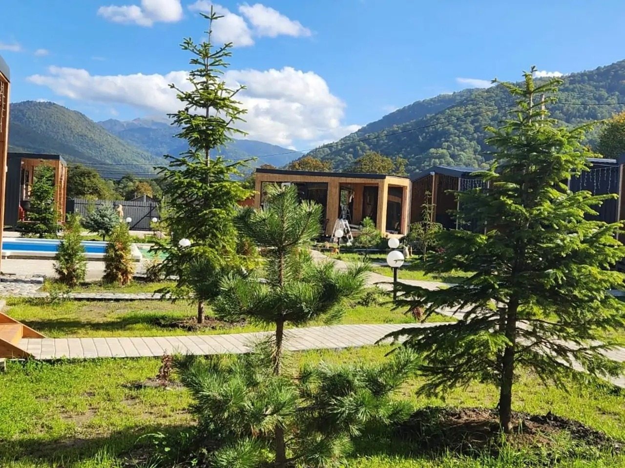 Прекрасное место для спокойного отдыха. На территории находится всего 9 домиков. Шикарный вид на горы. Мангальную зону чистят, дорожки чистые, в домике было чисто, бассейн тёплый, чистят каждый день. Спасибо Ирине за чистоту и порядок.