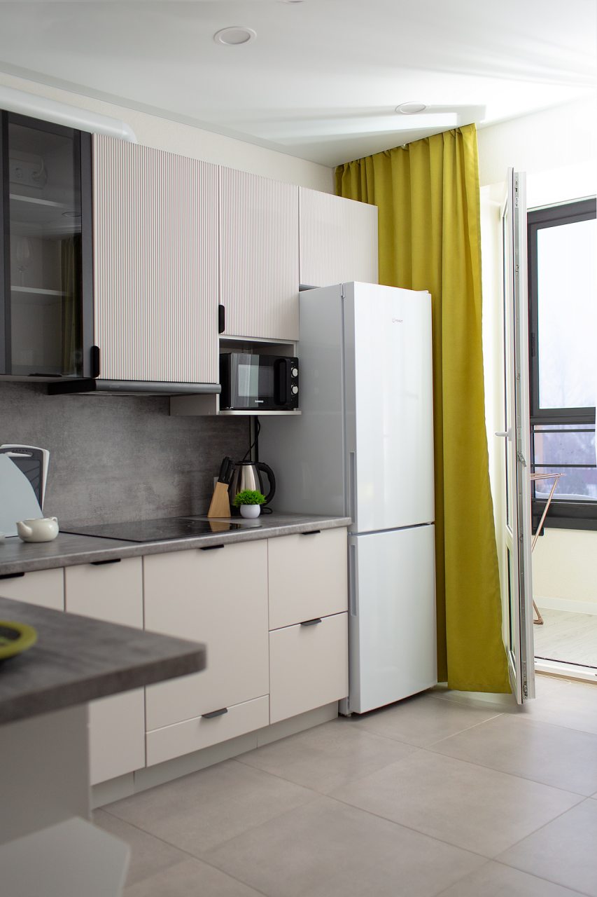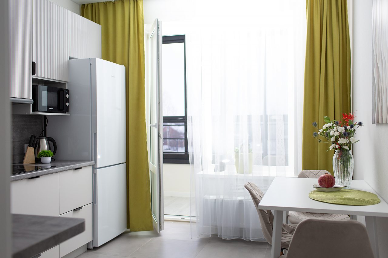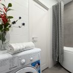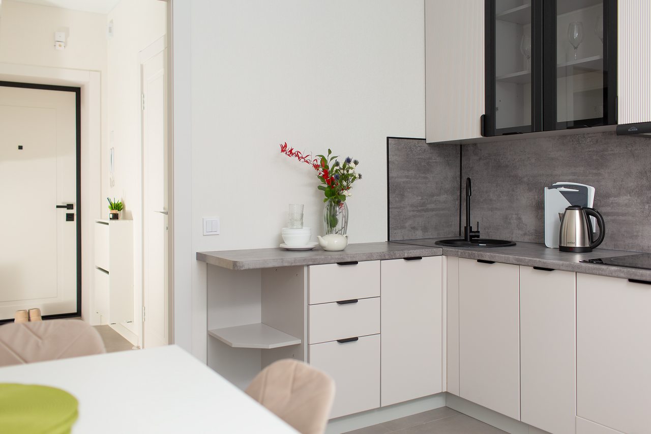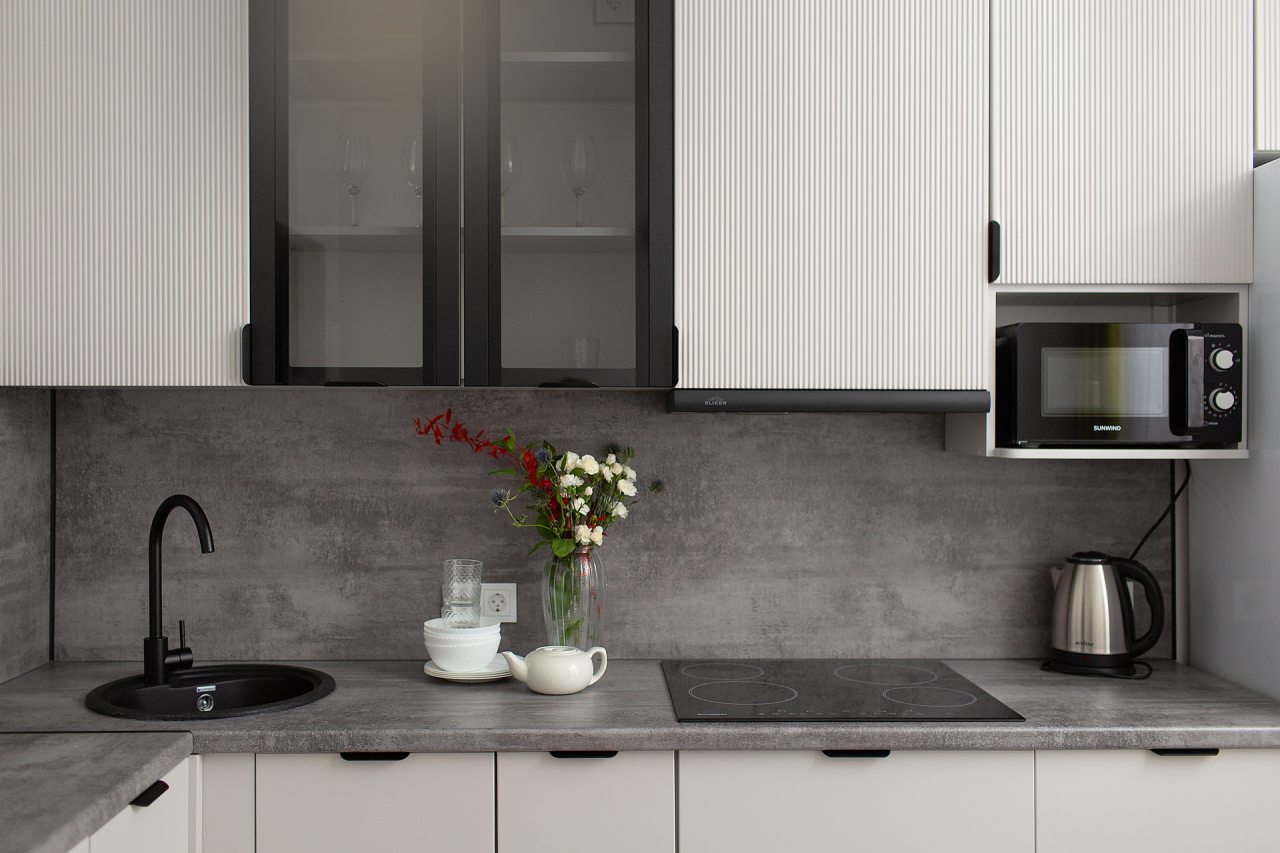 Кухня включает в себя посуду, индукционную плиту, холодильник, чайник, СВЧ, уютную обеденную зону, чтобы вы в любой момент могли порадовать себя приготовлением любимых блюд.