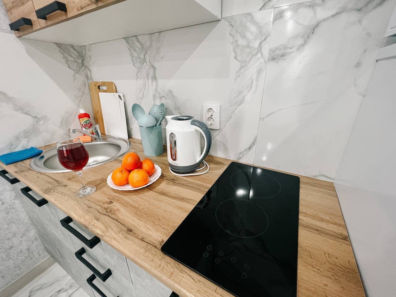 На кухонной зоне установлена бытовая техника для организации питания: варочная панель, холодильник, микроволновая печь, чайник, также есть посуда и кухонная утварь.