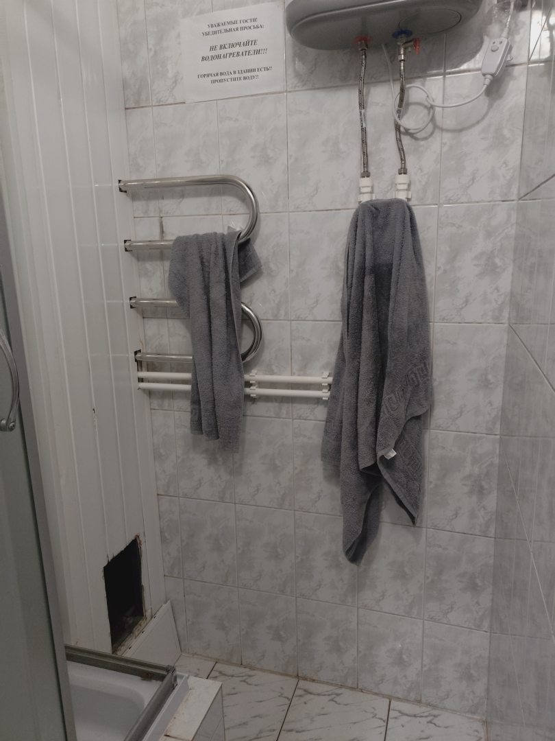 Из недостатков: было прохладно, показалось, что дует от балконной двери. Горячая вода полностью не нагревается, в душе бежит только, скажем так, тёплая.