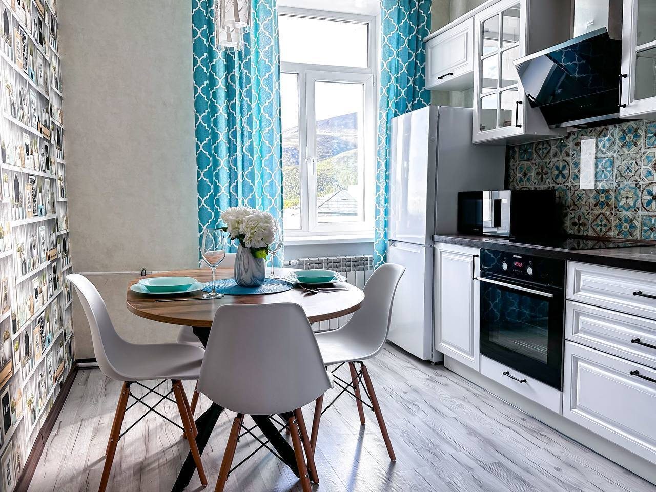 Просторная кухня оборудована белоснежным гарнитуром, обеденным столом, электроплитой, вытяжкой, микроволновой печью, духовым шкафом и холодильником. Пообедать можно в ближайшем кафе.