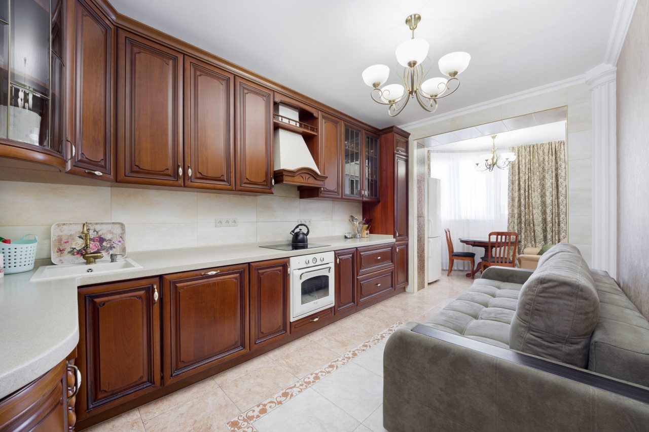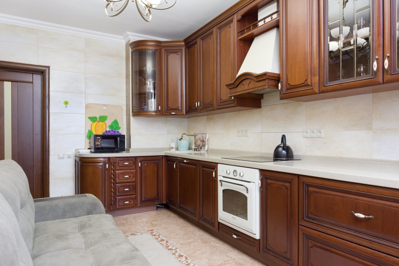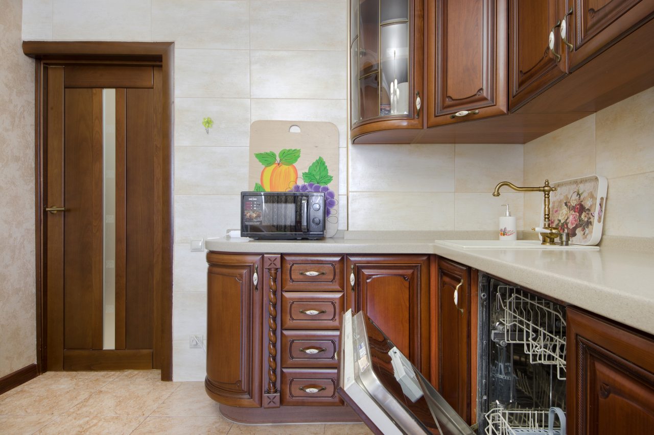 Кухня полностью подходит для готовки. Кухонный гарнитур, плита, микроволновая печь, холодильник, чайник — все это в распоряжении отдыхающих. Также выделен обеденный уголок.