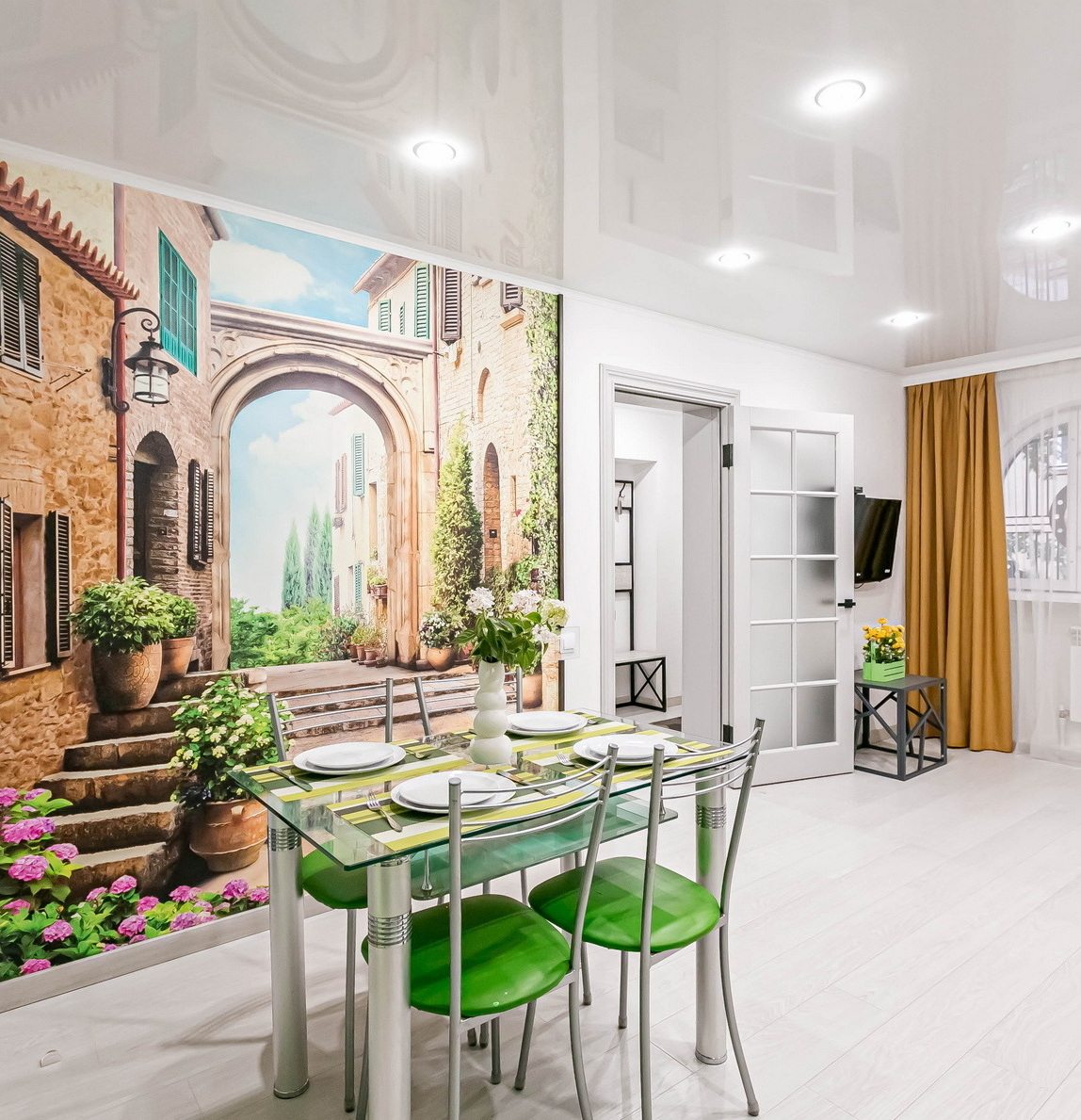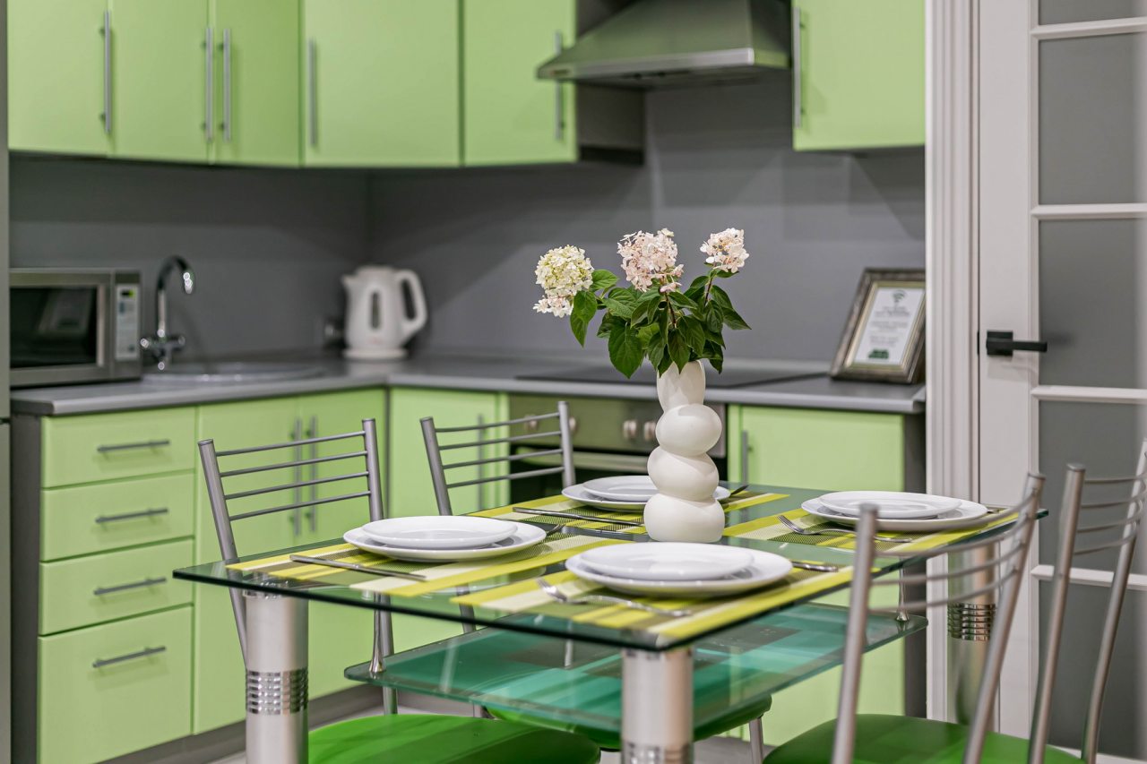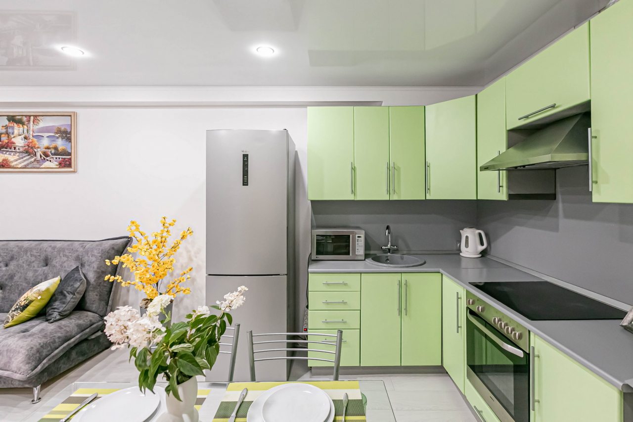 Кухня оснащена обеденным столом, посудой и необходимыми бытовыми приборами для самостоятельного приготовления любимых блюд: СВЧ-печь, двухкамерный холодильник, электрический чайник, варочная панель и духовой шкаф.