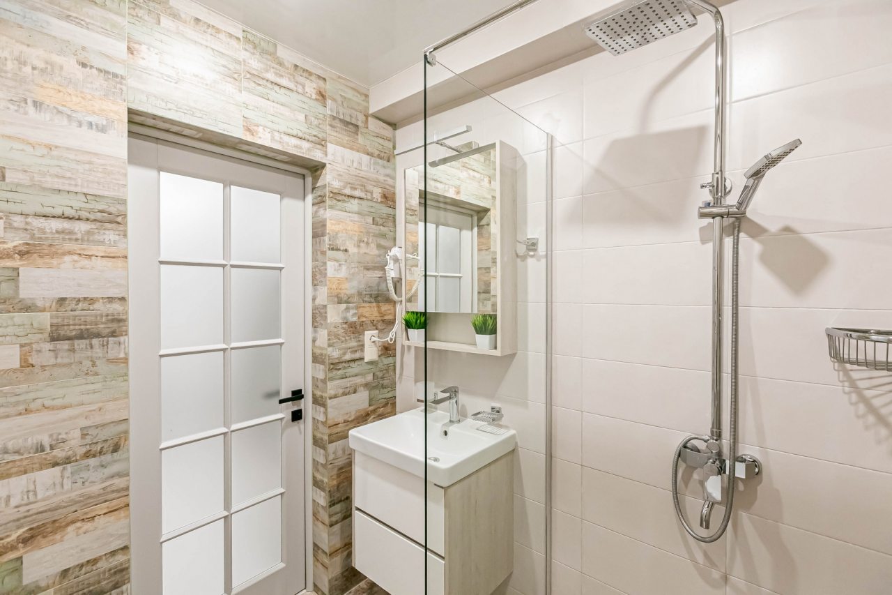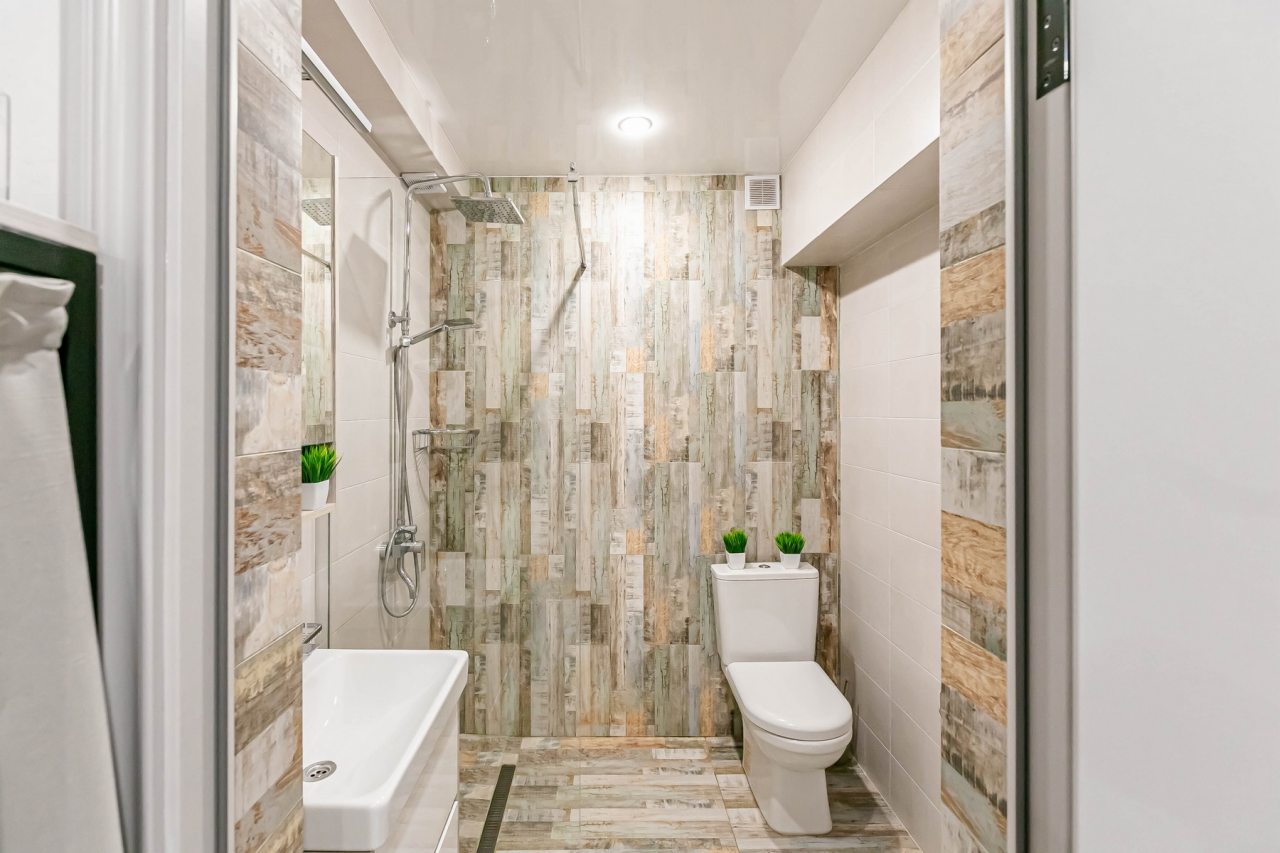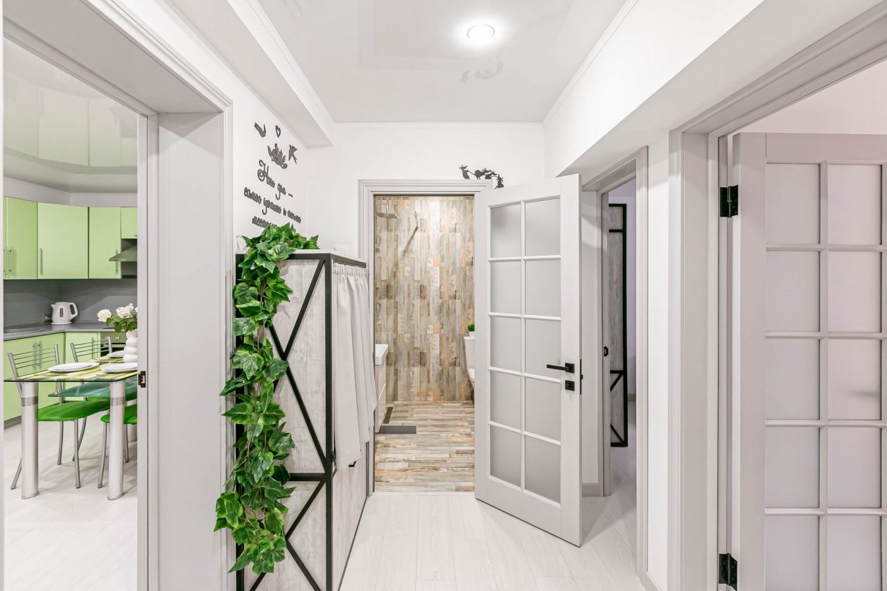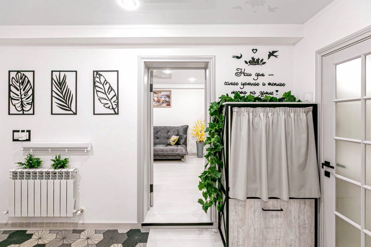 Кухня оснащена обеденным столом, посудой и необходимыми бытовыми приборами для самостоятельного приготовления любимых блюд: СВЧ-печь, двухкамерный холодильник, электрический чайник, варочная панель и духовой шкаф.