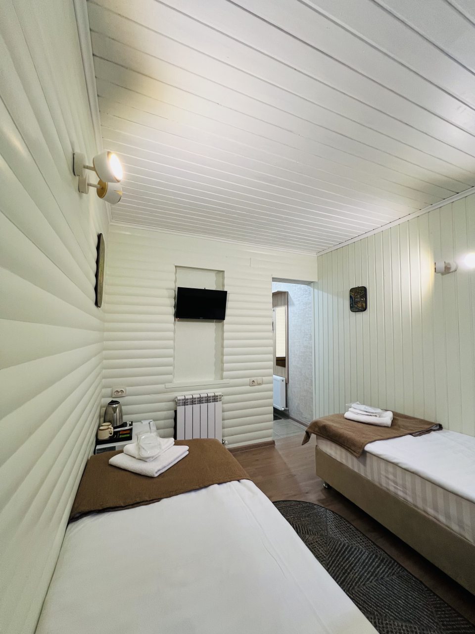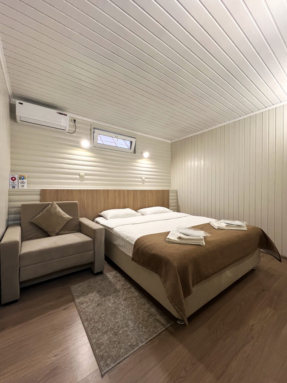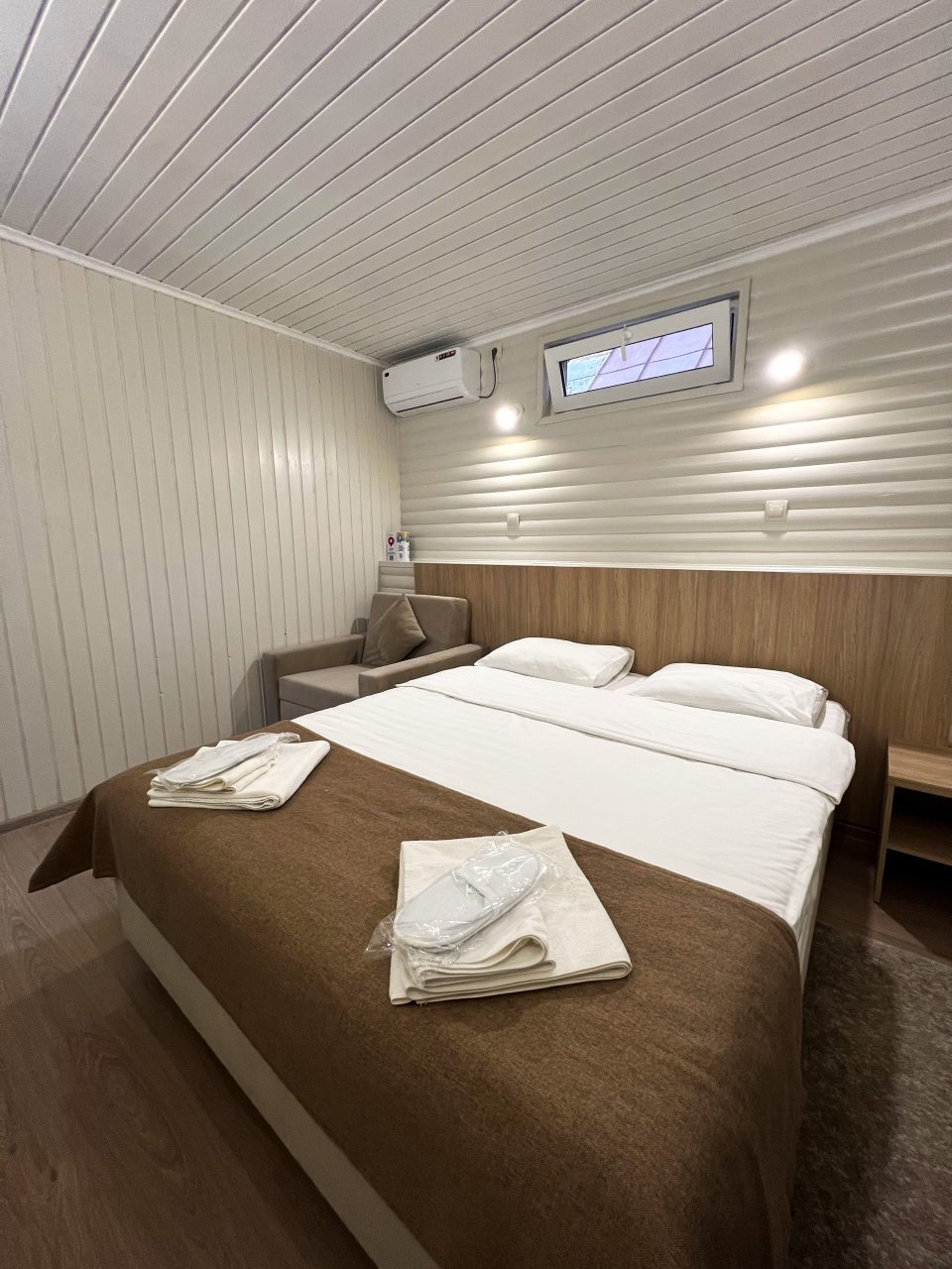 В наличии 6 номеров разнообразных категорий. В каждом предусмотрена качественная мебель и техника, в том числе удобные кровати, Wi-Fi, кондиционер, комплект полотенец, а также собственный санузел с душевой и гигиеническими средствами. Среди дополнительных услуг, которые предоставляются бесплатно при согласовании с администрацией, — стирка и глажка вещей.