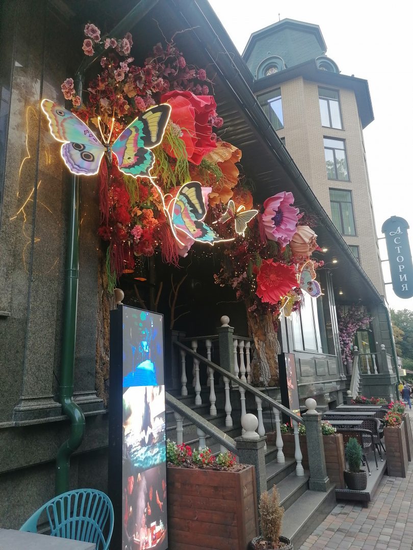 Живые бабочки в ресторане, и оформлен красиво вход в той же тематике. Вечером смотрится волшебно