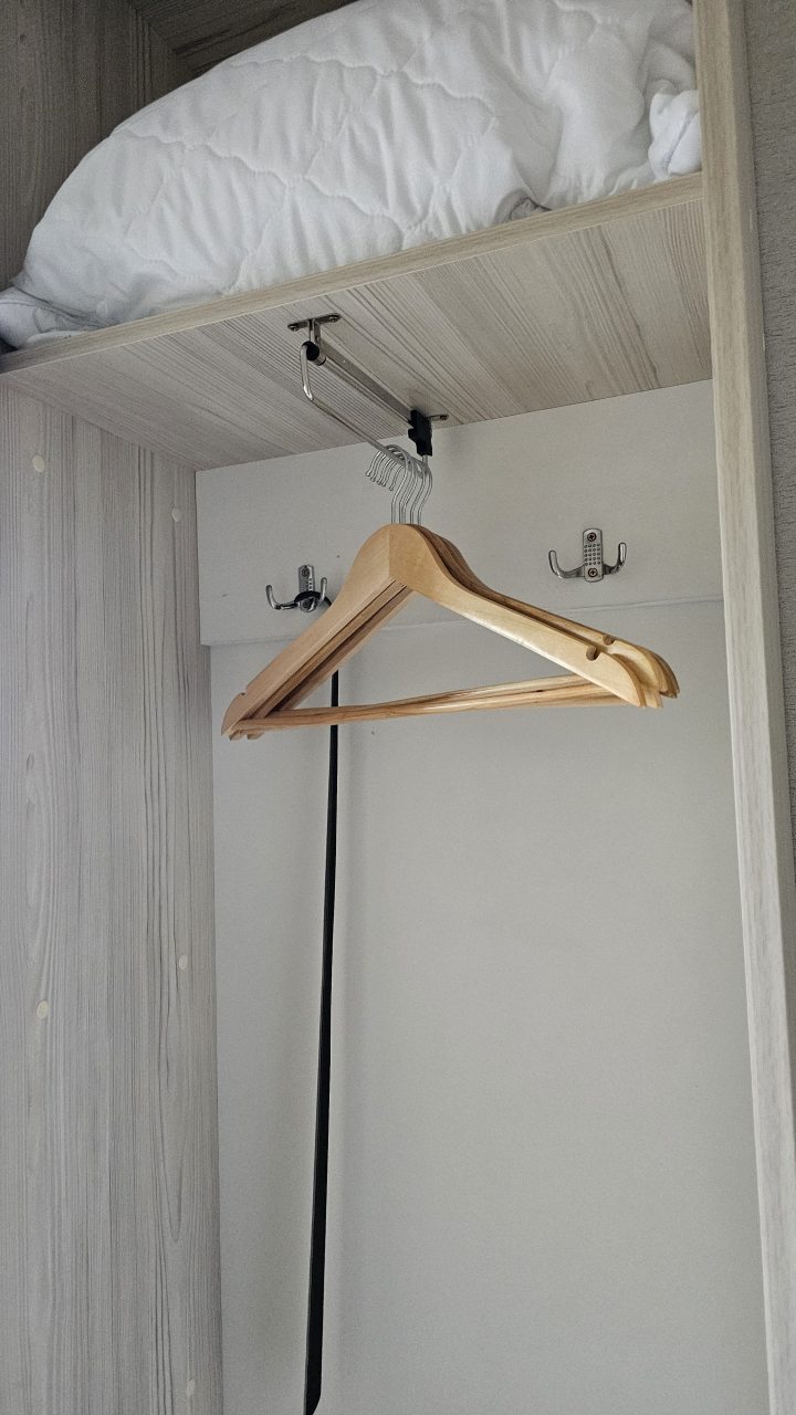 Есть вешалки , доп. стеллаж , стул , полотенца.