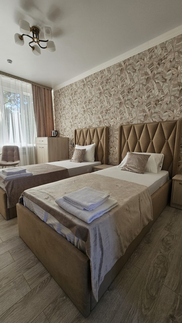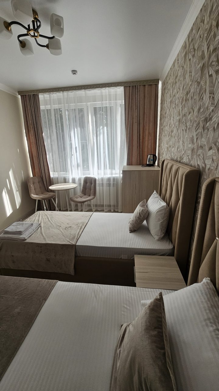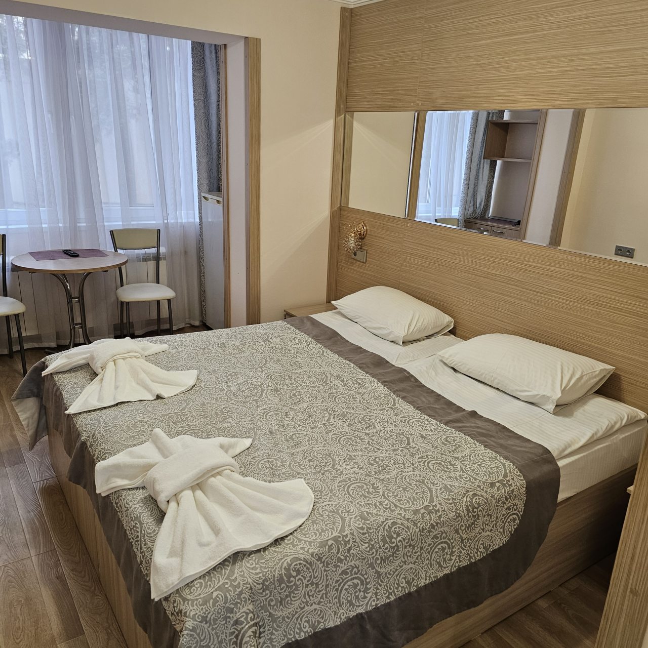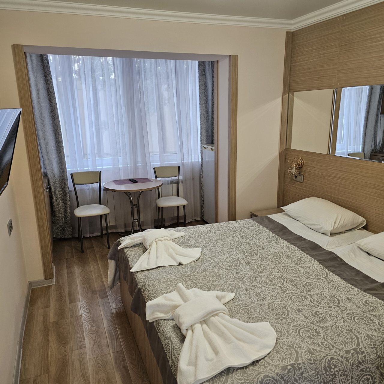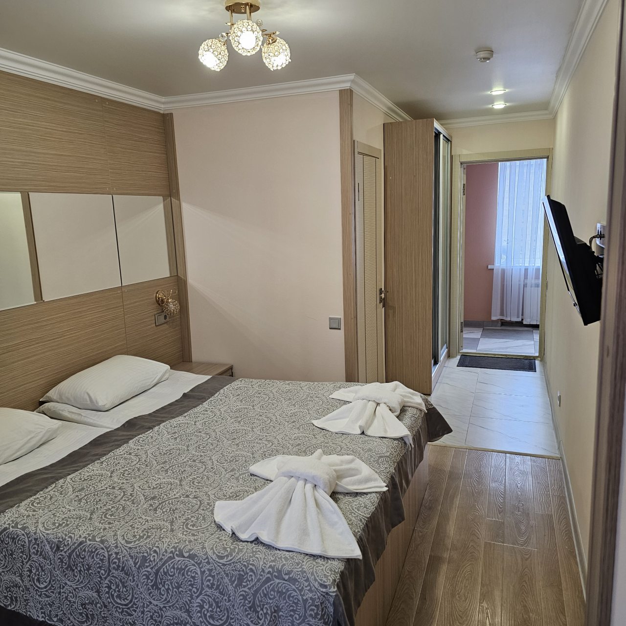 15 февраля заехали с дочерью в отель. Я бронировала 2-хместный номер с удобствами на этаже. По приезду оказалось, что в нашем номере идёт ремонт. Нам предложили другой номер с удобствами в нём. Цена за проживание осталась прежней. В отеле чисто и уютно. В номере удобная кровать с прикроватными тумбочками, шкаф-купе для верхней одежды и обуви, телевизор, столик и стулья, чайник, посуда, холодильник. Функциональные источники освещения. Удобный и чистый санузел. Вобщем, есть всё необходимое для комфортного отдыха. Отдельное спасибо администраторам. Нам предложили разные экскурсии, чем мы и воспользовались. Очень удобно, что экскурсионный автобус нас забирал от отеля.