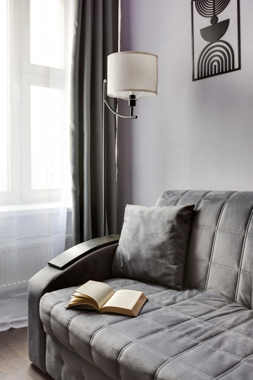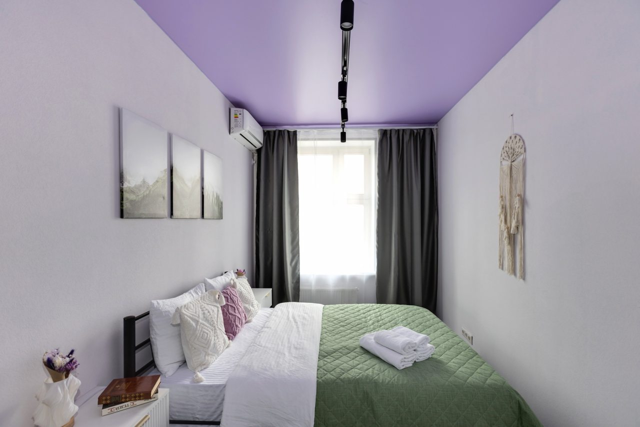 Внутри есть большая и удобная двуспальная кровать, кондиционер, шкаф, прикроватные тумбы, плотные шторы, мягкий диван, ЖК-телевизор, а также санузел с душевой и стиральной машиной.