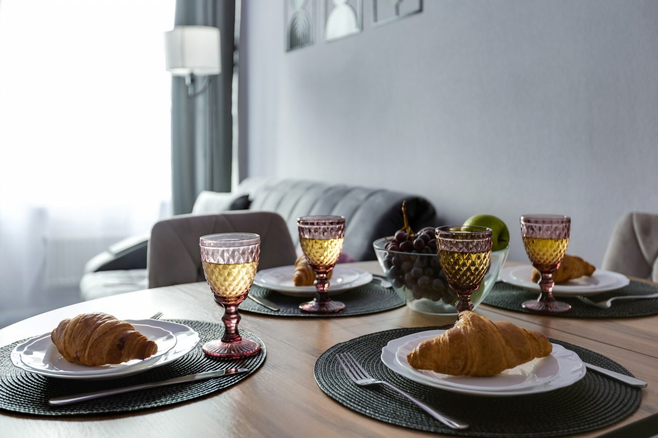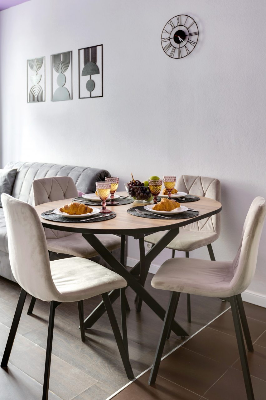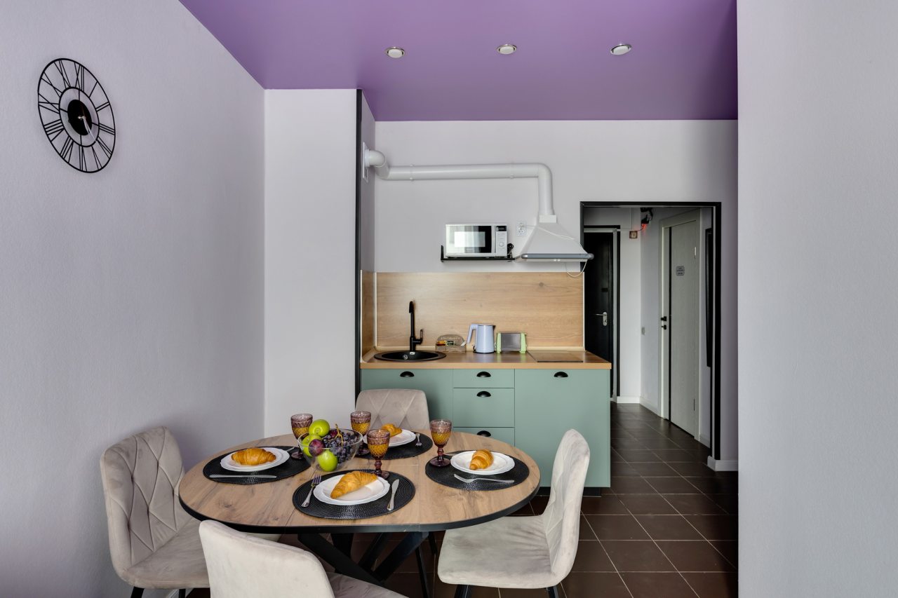 Компактная зона кухни включает в себя индукционную плиту с вытяжкой, СВЧ, тостер, чайник, холодильник, посуду, обеденный стол и стулья.