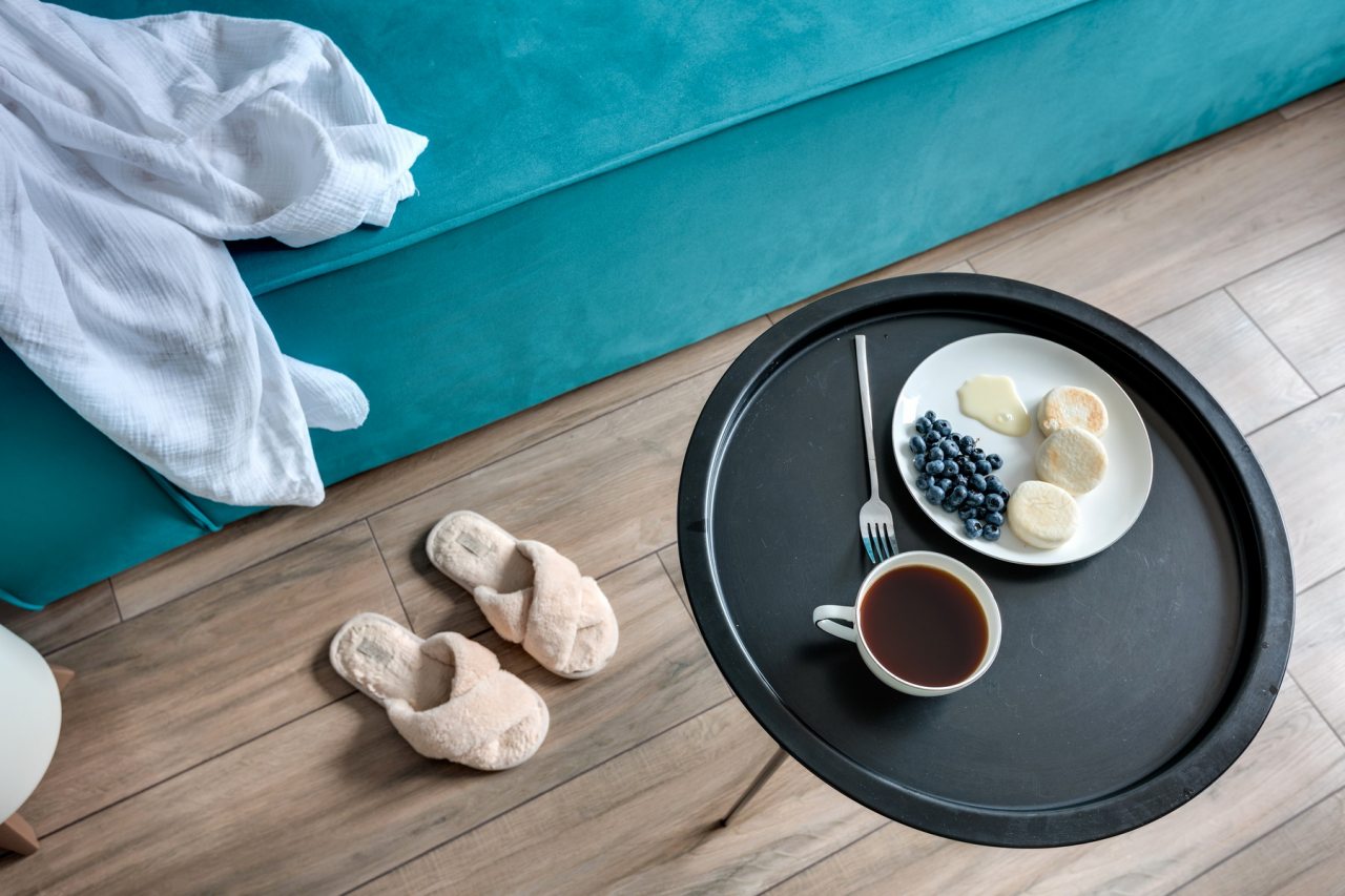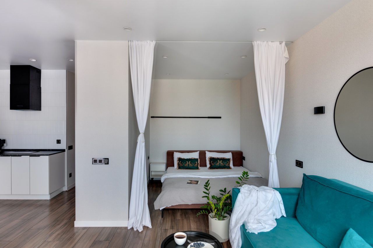 Кухня включает в себя СВЧ-печь, индукционную плиту с вытяжкой, чайник, холодильник, уютную обеденную зону. Таким образом, вы всегда сможете приготовить любимые блюда и напитки.