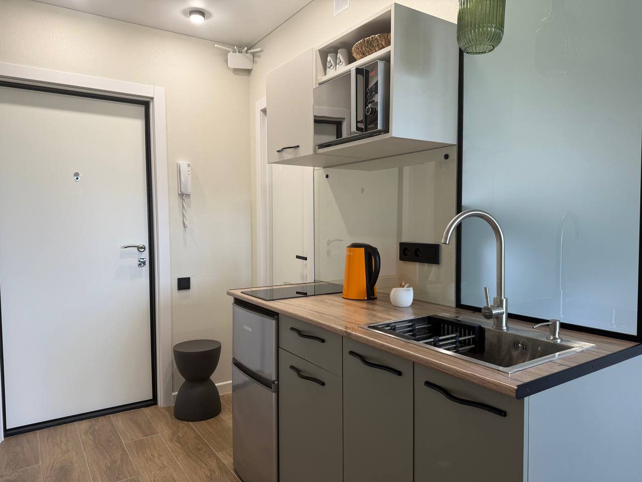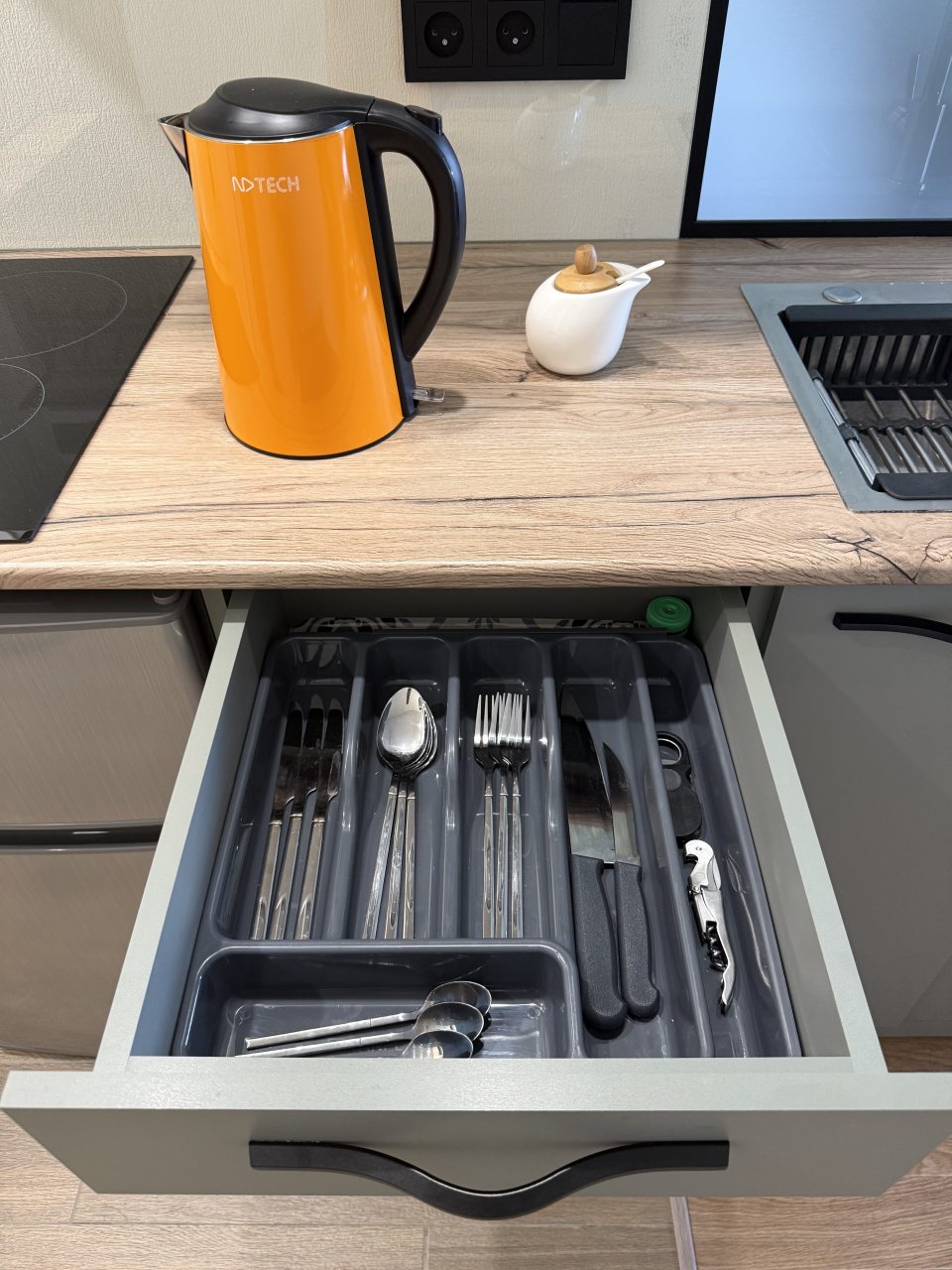 На мини-кухне есть холодильник, варочная панель, чайник, микроволновая печь, посуда. Перекусить можно в семейном кафе и столовой русской кухни поблизости.