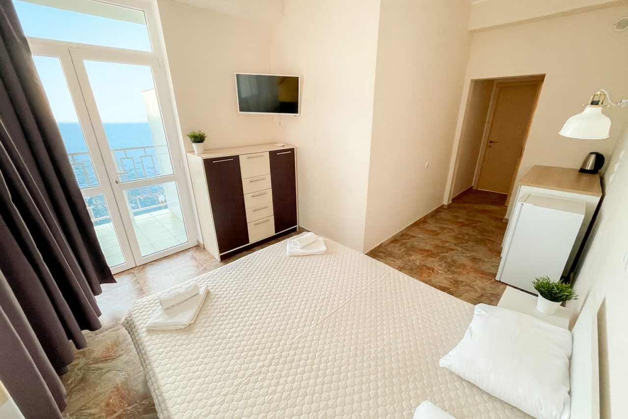 Приятный отель, без проблем с заселением и парковкой. ДОПУСТИМО размещение с животными (за доплату). Номер небольшой двухспальная и односпальная кровати, шкаф - вот и всё. Однако имеется просторная лоджия размером с комнату, где установлены холодильник, чайник, стол со стульями и гамак. В отеле имеется общая кухня с плитами, стиральной машиной и утюгом с доской для глажки, где можно готовить самостоятельно. Вид на море потрясающий. Галечные пляжи, прозрачная вода. Планируем вернуться сюда ещё не раз.