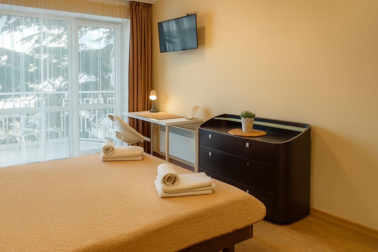 Отель включает в себя следующие категории номеров: стандарт, базовый, евростандарт, люкс. В каждом из перечисленных номеров имеются спальные места, прикроватные тумбочки, кондиционер, ванная комната, телевизор, беспроводной интернет.