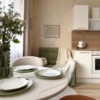 Для размещения в Королеве мы выбрали гостевую студию Garden. У нее небольшая площадь, несмотря на это есть и душ с туалетом, и небольшая кухонная зона. Можно было готовить какие-то простые блюда или разогревать. По стоимости вышло очень удачно. Посуда в номере есть. Единственное, чего не хватило, так это шкафа. Вместо него только вешалка в нише.