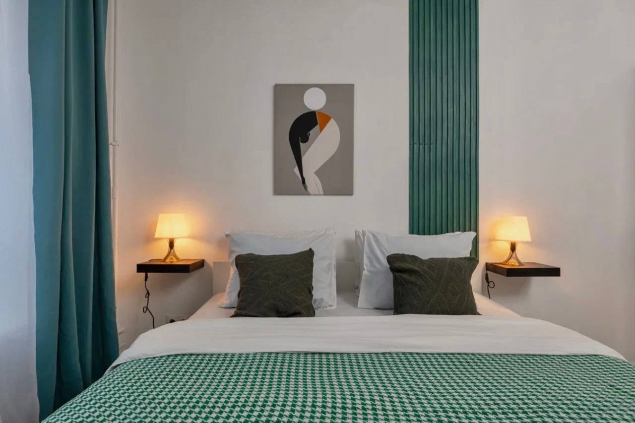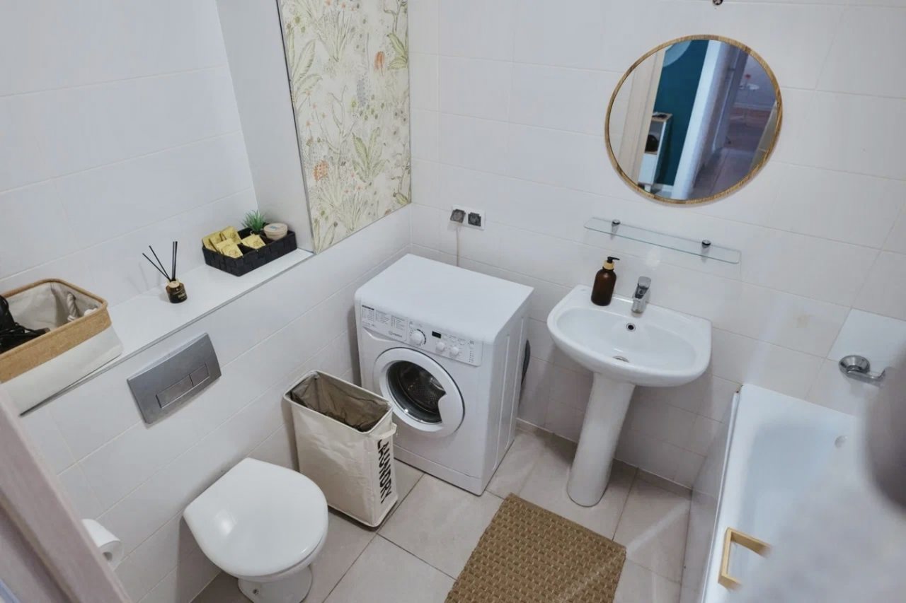 На площади в 50 квадратных метров вас ожидает удобная двуспальная кровать, прикроватные лампы, вместительный шкаф, диван с телевизором, а также ванная комната с гигиеническими средствами, стиральной машиной и феном.