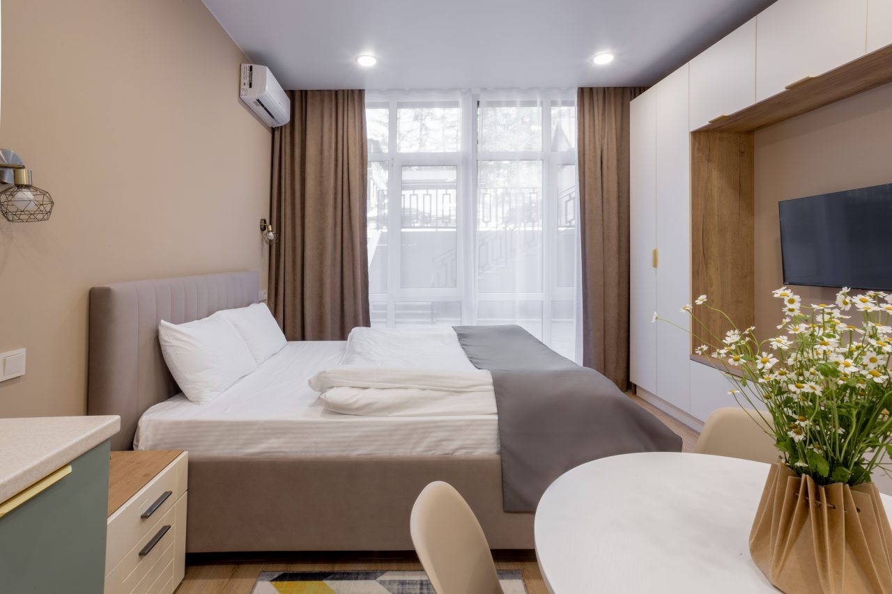 Просторные и уютный апарт-отель. Ремонт свежий, все красивое и стильное. Выполнено в стиле минимализм, но все нужное под рукой. Скучать нам не пришлось, все свободное время проводили за прогулками. Сон здесь чудесный. После прогулок ложишься на эту мягкую кровать, как на облачко и разом засыпаешь). Как девушка могу выделить плюсом наличие фена в санузел. Очень удобно высушить волосы.