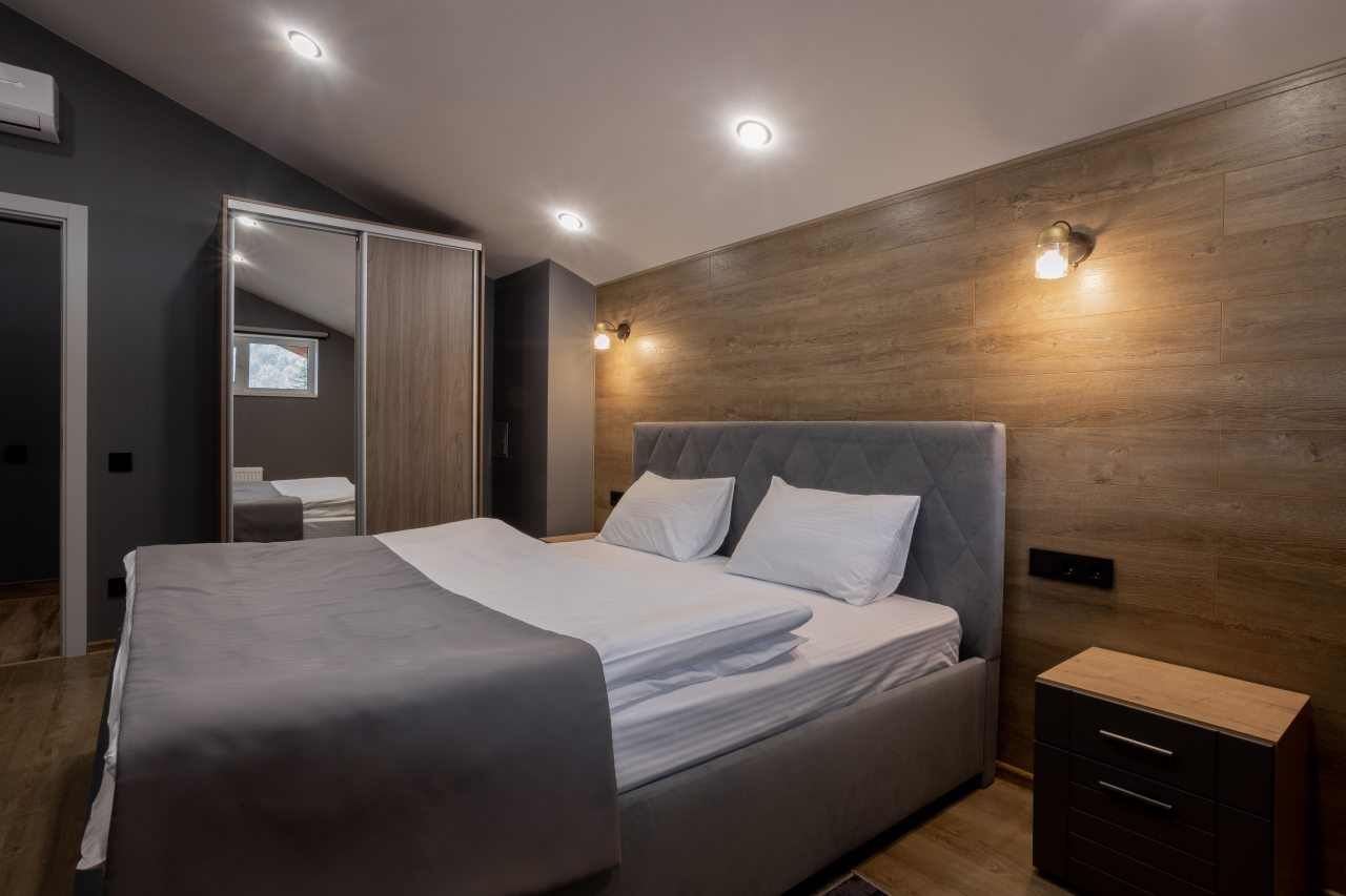 Номера выполнены в спокойных теплых тонах. Горные пейзажи за окнами отеля и прекрасные виды с балконов. Во всех номерах есть оборудованная кухонная зона, стиральные машины, кондиционер, бесплатный Wi-Fi, собственная ванная комната. Имеются места для хранения и сушки горнолыжного и туристического оборудования.