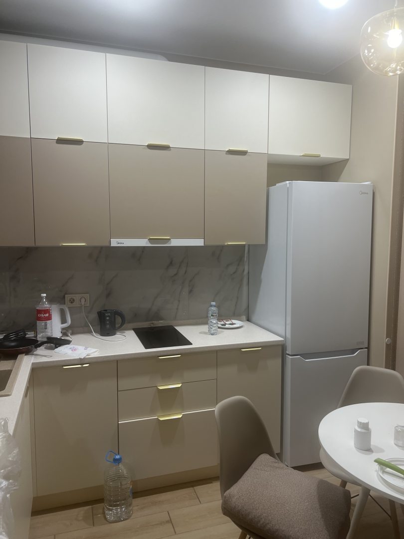 Кухня полностью подходит для приготовления пищи. Имеется микроволновка, холодильник, плита, электрочайник и посуда.
