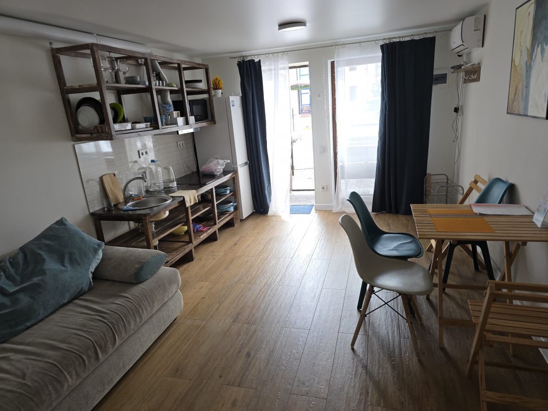 Апартаменты классные! Находятся в домике, на первом этаже. Отдельный вход, впереди как бы мини-терраса, на которой можно посидеть в садовом кресле. Вид интересный, но рядом дорога, правда, не загруженная. Внутри много древа. Кухонный уголок интересный и стеллаж для вещей. Всё нам понравилось очень.