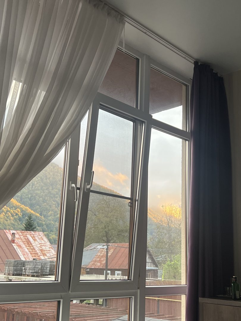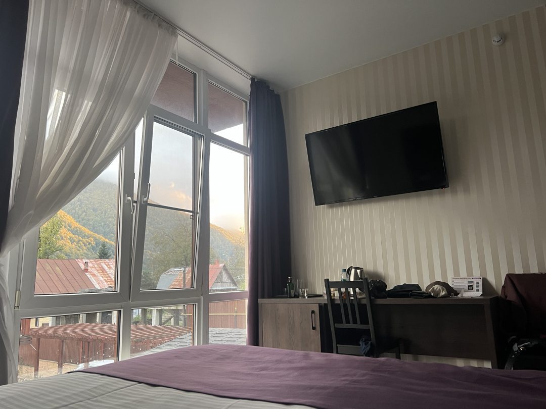 Приезжали с друзьями на выходные . Отличное месторасположение . В номере тепло , чисто , есть все необходимое ( телевизор, холодильник , чайник , чай , кружки, туалетные принадлежности, тапочки ) .Прекрасный вид из окна на горы . Постель чистая и приятная , матрас и подушка очень комфортные .