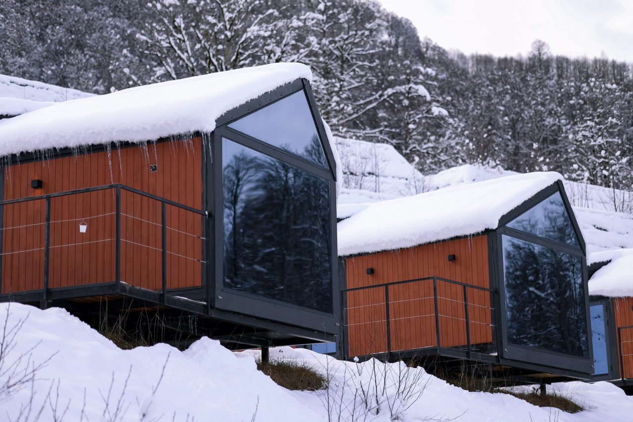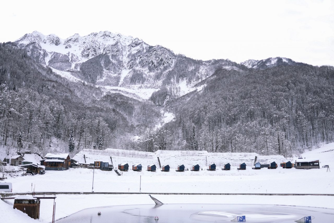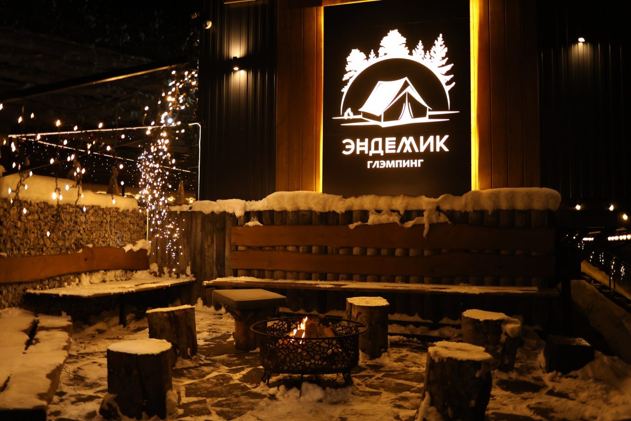 Глэмпинг «Эндемик» расположился на горнолыжном курорте Роза Хутор посёлка городского типа Красная Поляна.