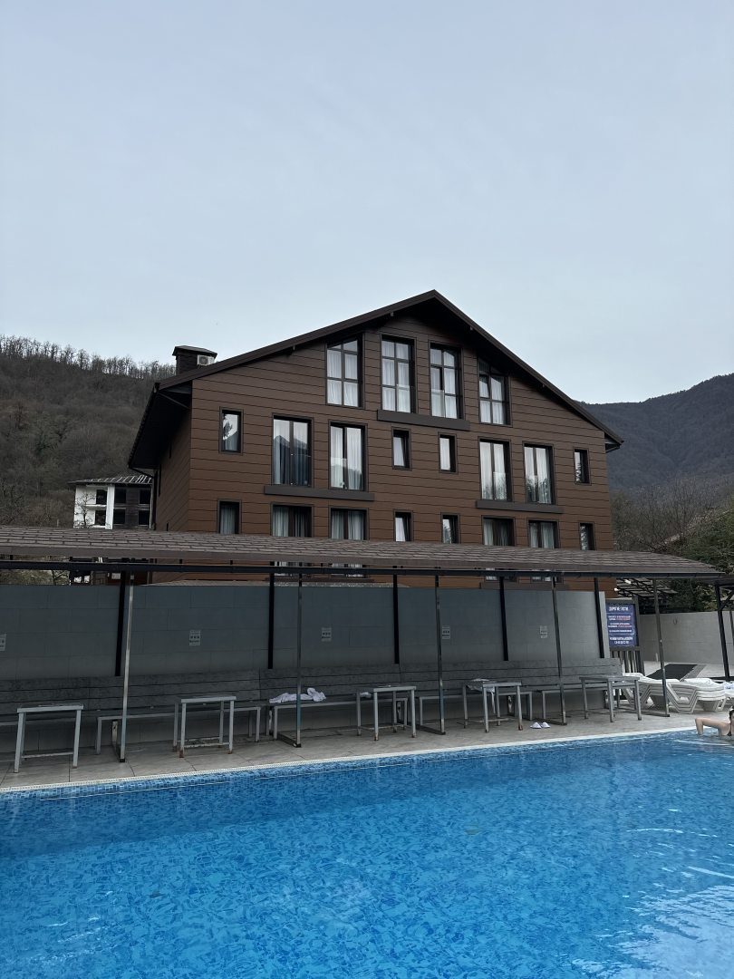 Как в лучшем санатории! Рекомендую! Ездили отдыхать семьей. бассейн теплый, несмотря на то, что отдыхали зимой, в бассейне не холодно.Есть сауна, но в стоимость проживания она не входит. Вежливый персонал. Получилась накладка и вместо улучшенных апартаментов нас заселили в коттедж, мы остались довольны. На территории есть кафе, в котором готовят вкусные завтраки. Просыпаться в горах это кайф, особенно в таком шикарном отеле.