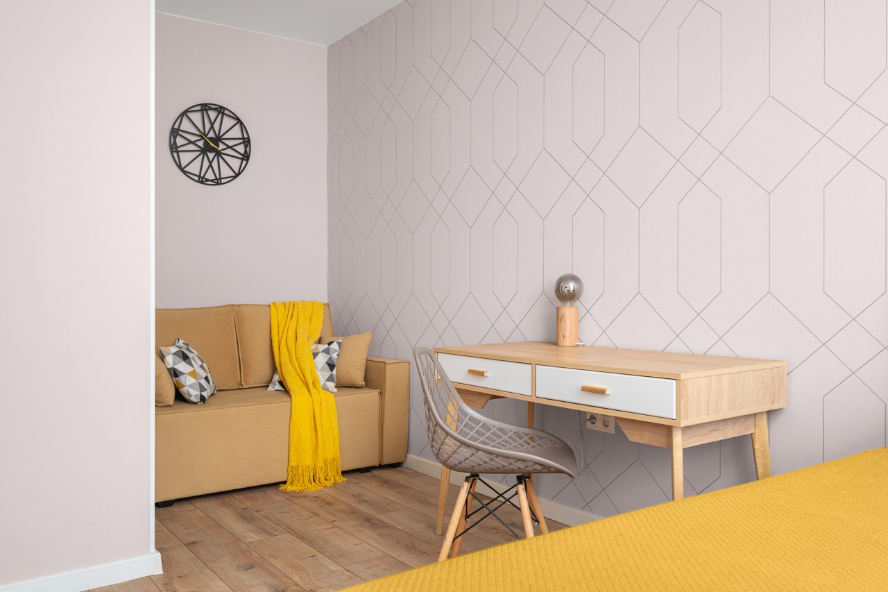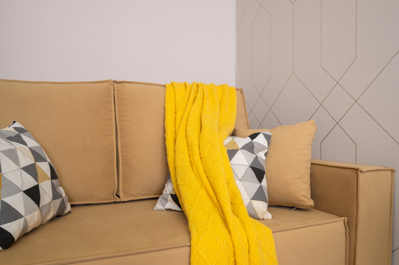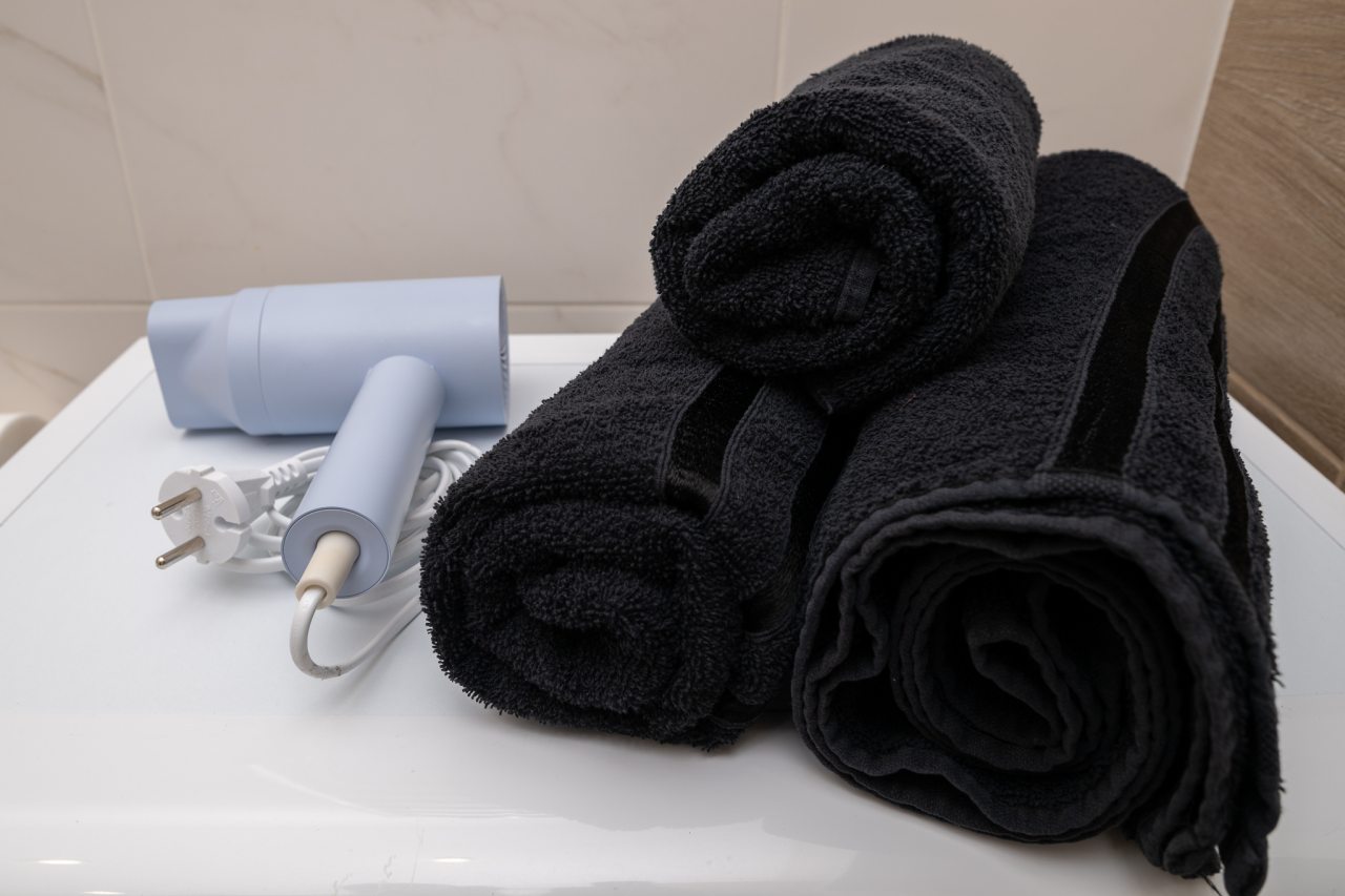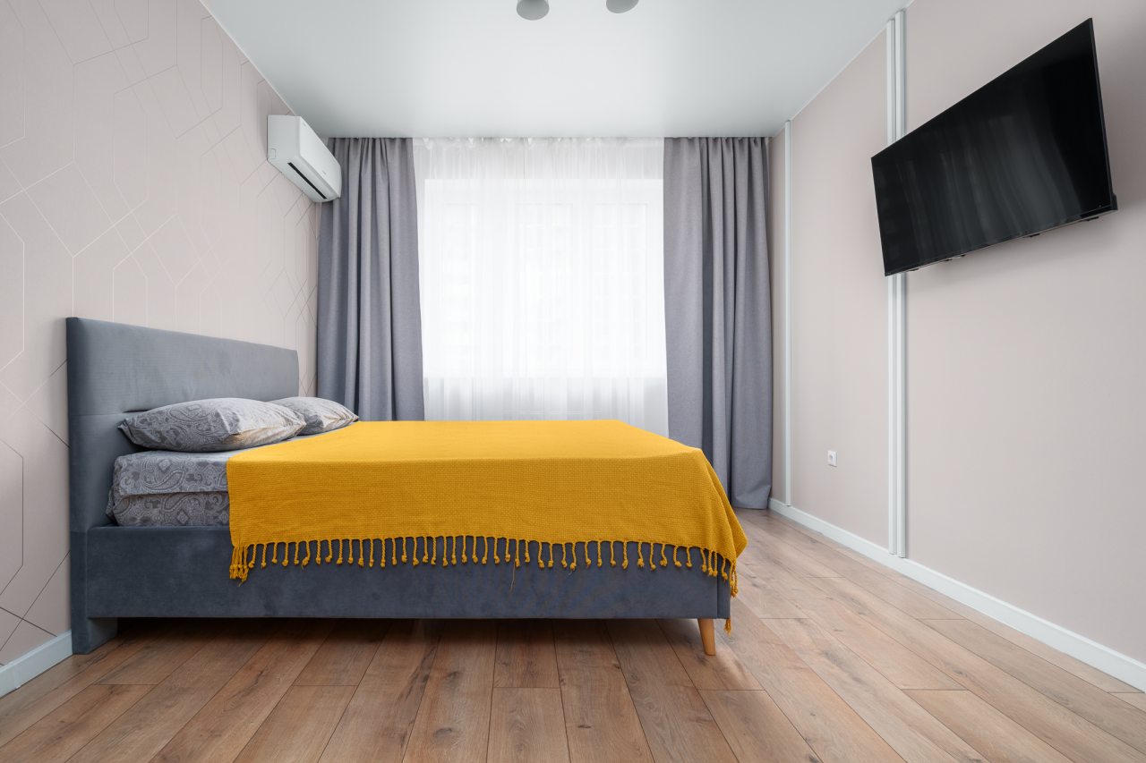 Внутри всё продумано для комфортного отдыха и проживания, включая удобную двуспальную кровать, мягкий мини-диван, кондиционер, плотные шторы, телевизор, письменный стол, а также ванную комнату со стиральной машиной, полотенцами и феном.