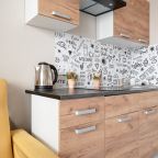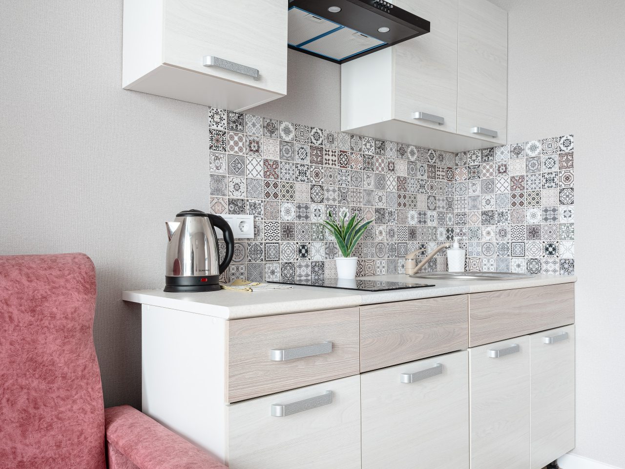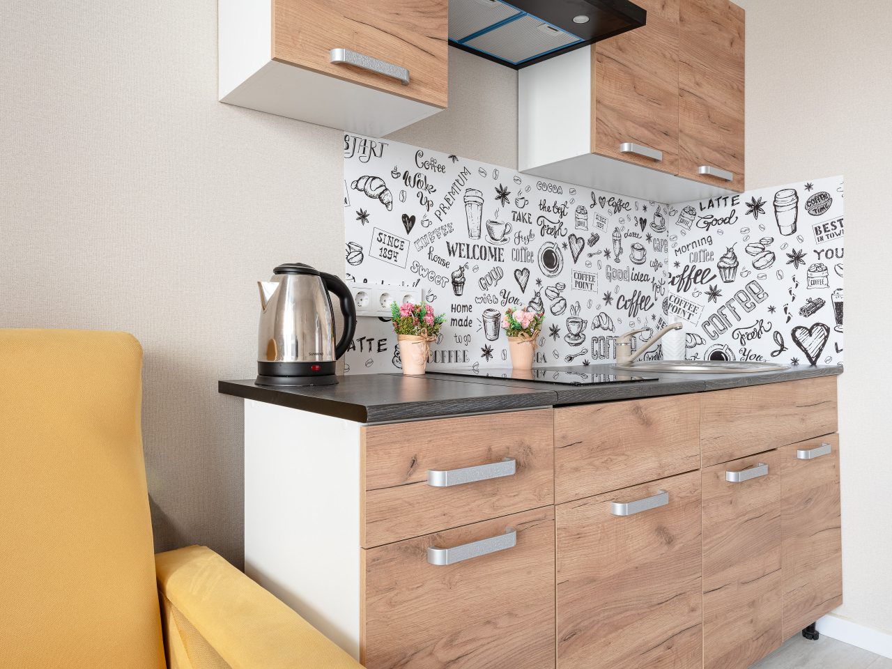 Небольшая кухня оснащена всей необходимой мебелью и техникой для комфортного приготовления еды. В шаговой доступности продовольственные магазины и заведения.