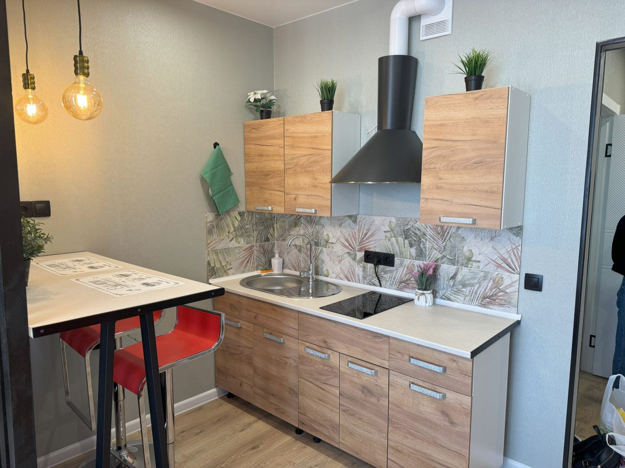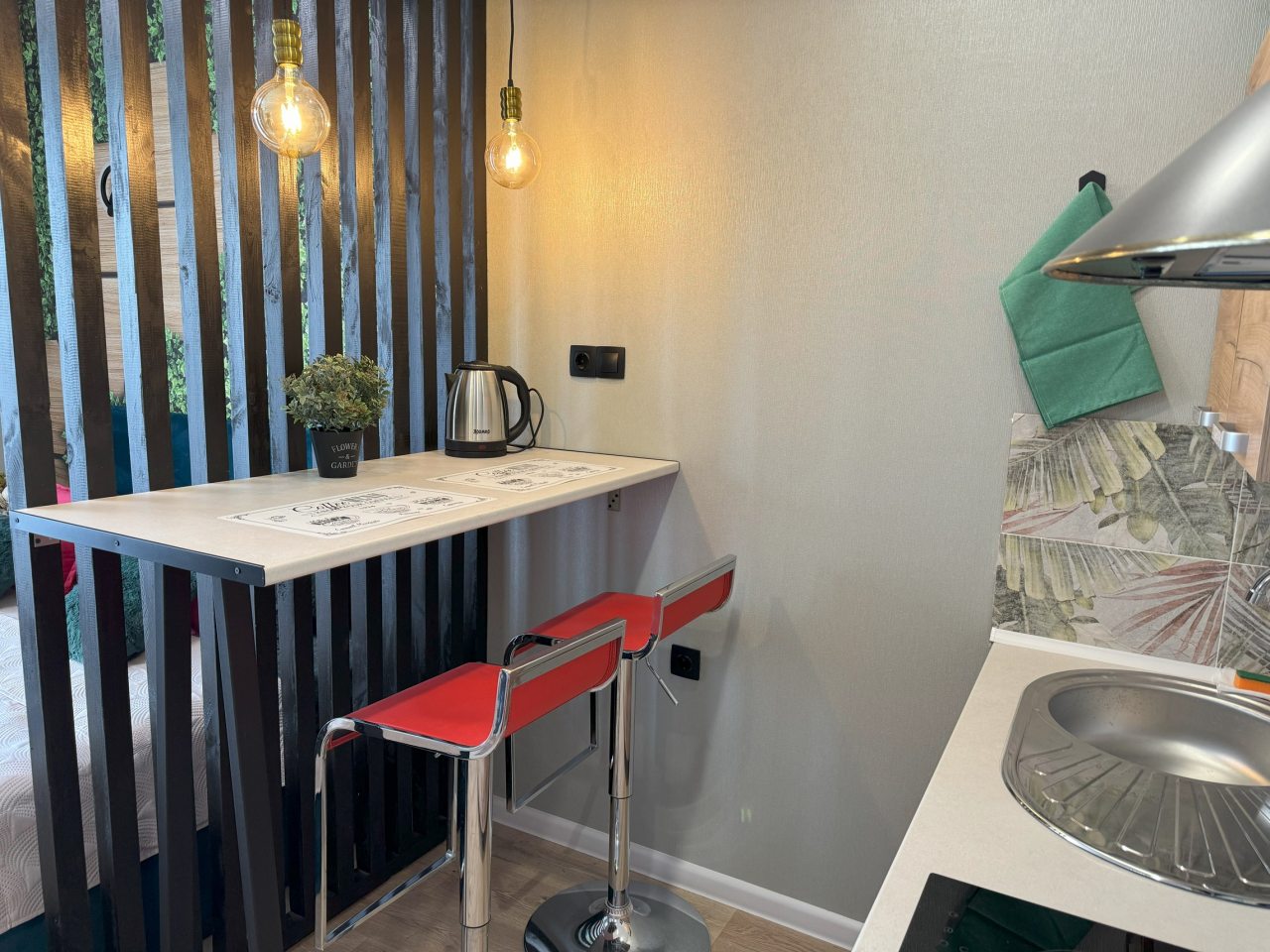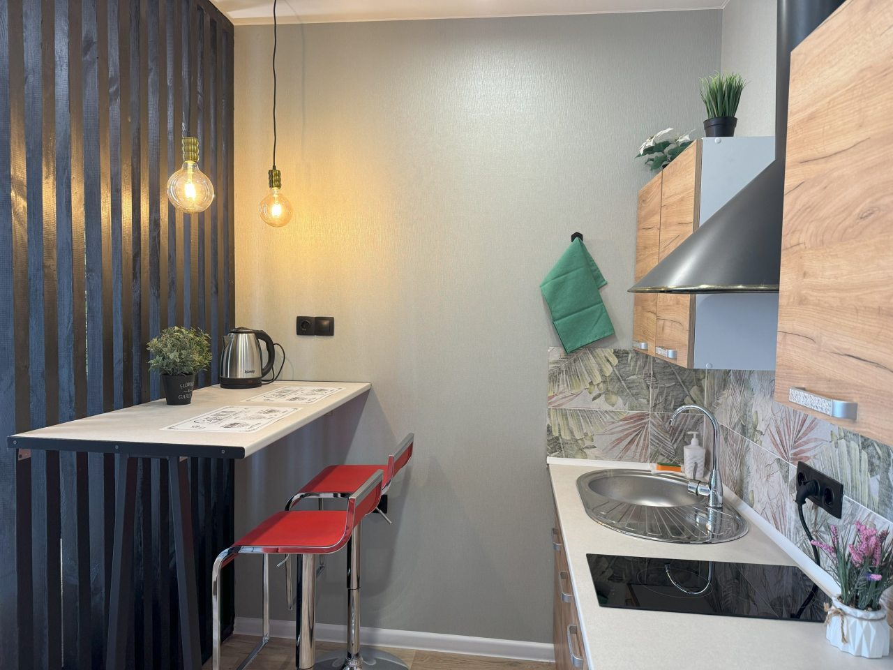 На кухне установлен гарнитур и барная стойка, которые оснащены техникой для приготовления еды. Холодильник, варочная панель, микроволновая печь и чайник. Постояльцам предоставляются посуда, чай и кофе. Поблизости располагается магазин «Пятёрочка» и несколько кофеен.