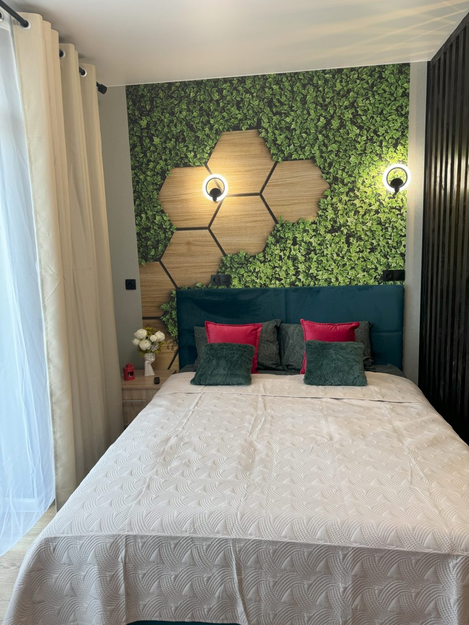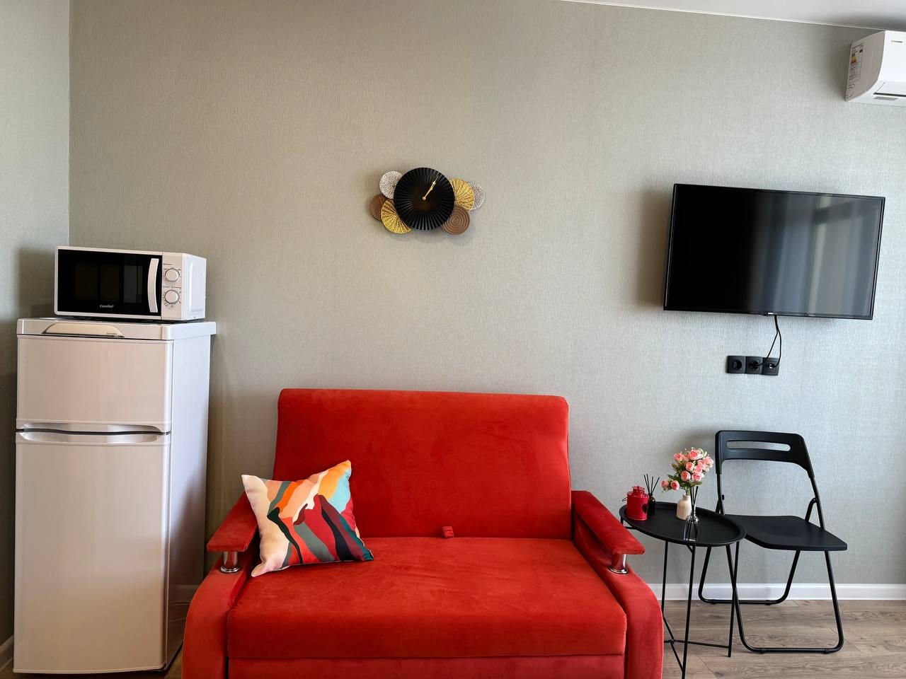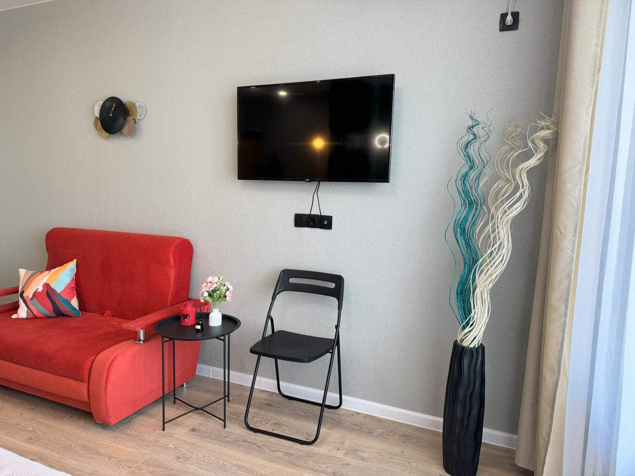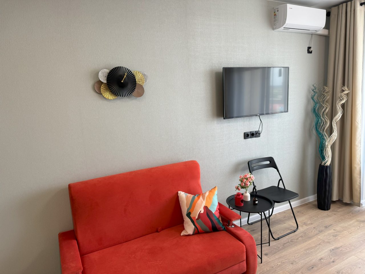 Апартаменты представляют собой небольшую и уютную студию, в которой есть все необходимое для комфортного пребывания: двуспальная кровать, раскладной диван, гардероб и шкаф для хранения вещей. Имеется выход на лоджию. В квартире индивидуальная система кондиционирования, есть телевизор для просмотра передач и проведен интернет. В ванной необходимая сантехника, фен и средства гигиены.