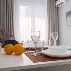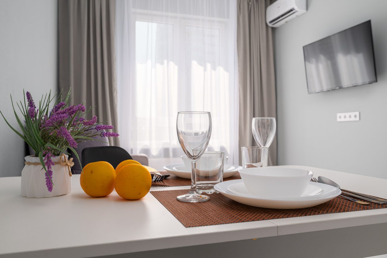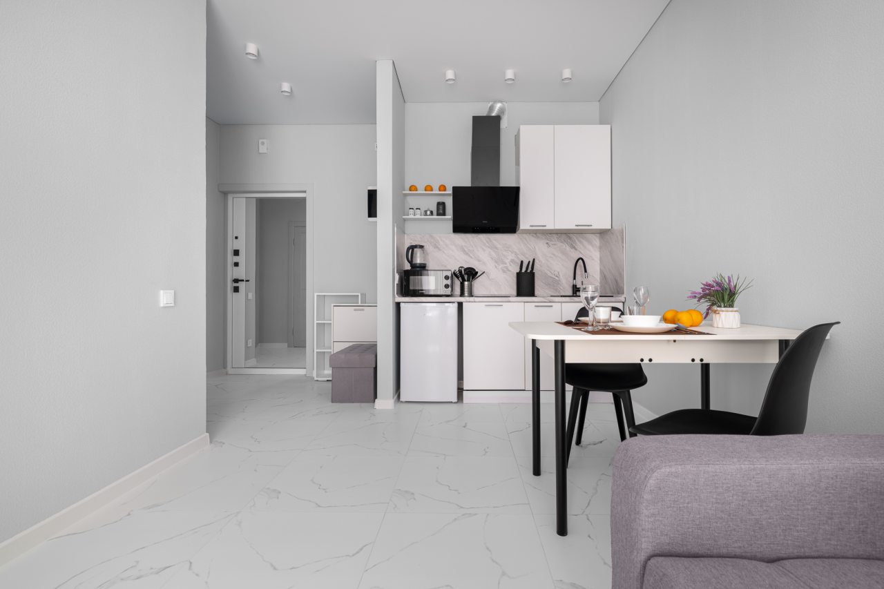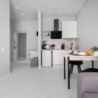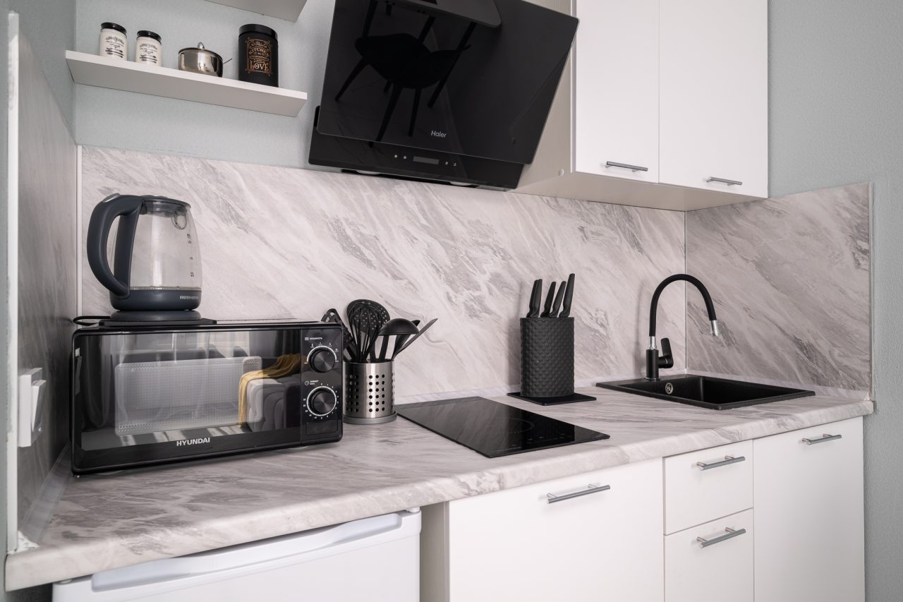 Кухонная зона оснащена варочной панелью, холодильником, чайником, СВЧ-печью, вытяжкой, уютным обеденным столом и стульями.