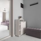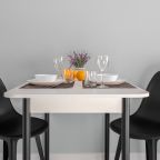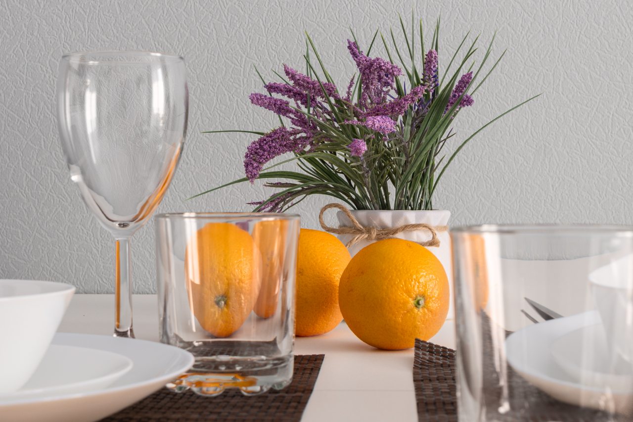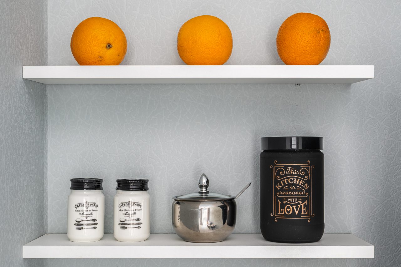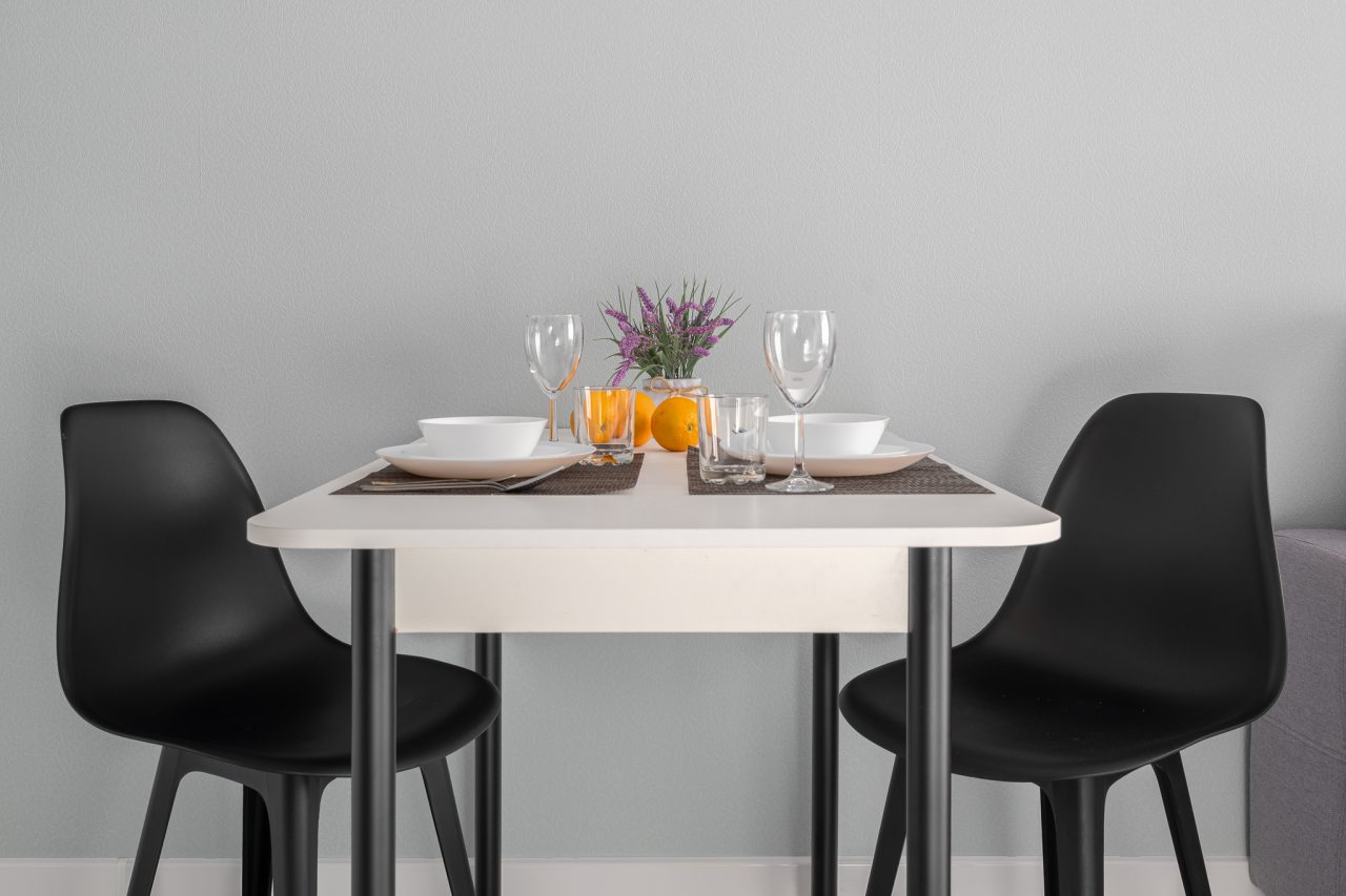 Кухонная зона оснащена варочной панелью, холодильником, чайником, СВЧ-печью, вытяжкой, уютным обеденным столом и стульями.