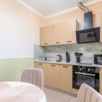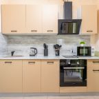 Кухня в бежевых оттенках оснащена бытовыми приборами и посудой для самостоятельного приготовления блюд: духовой шкаф, варочная панель, микроволновая печь, холодильник, чайник. В пешей доступности располагаются различные кафе и продуктовые магазины.
