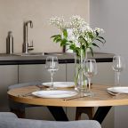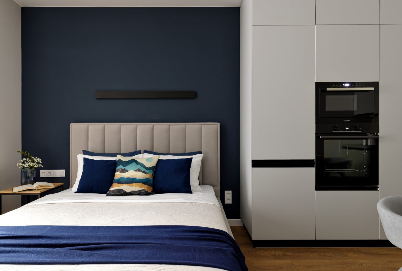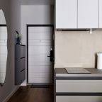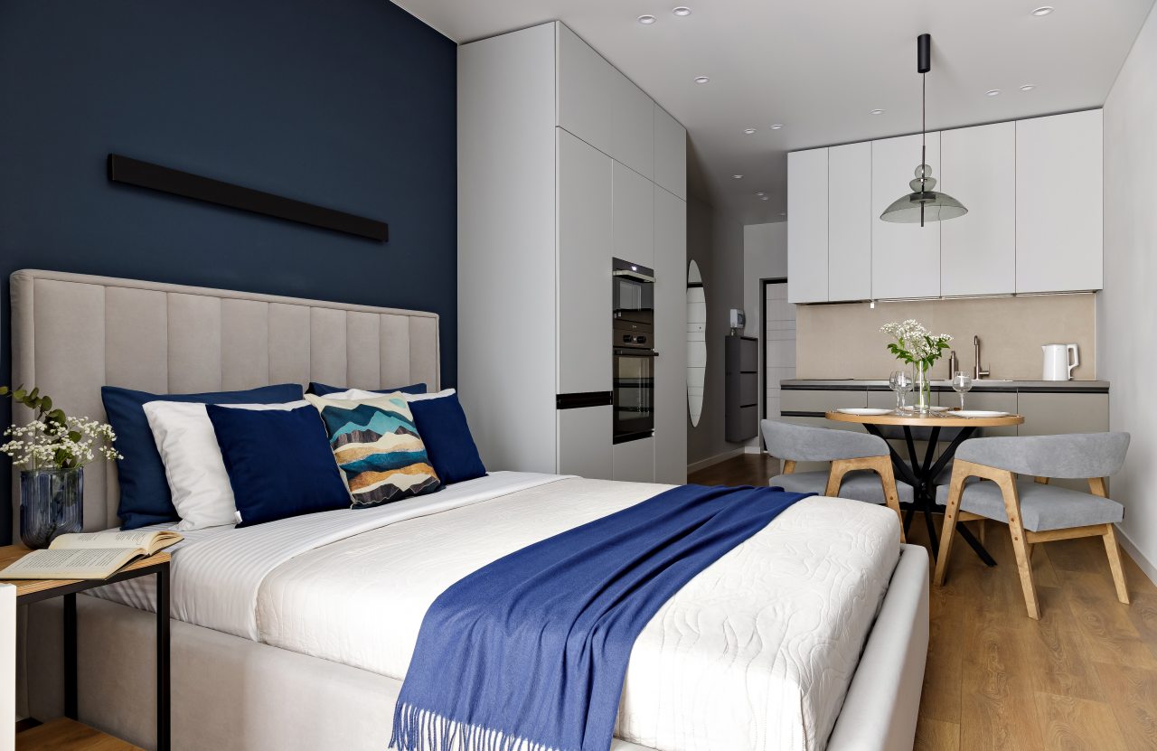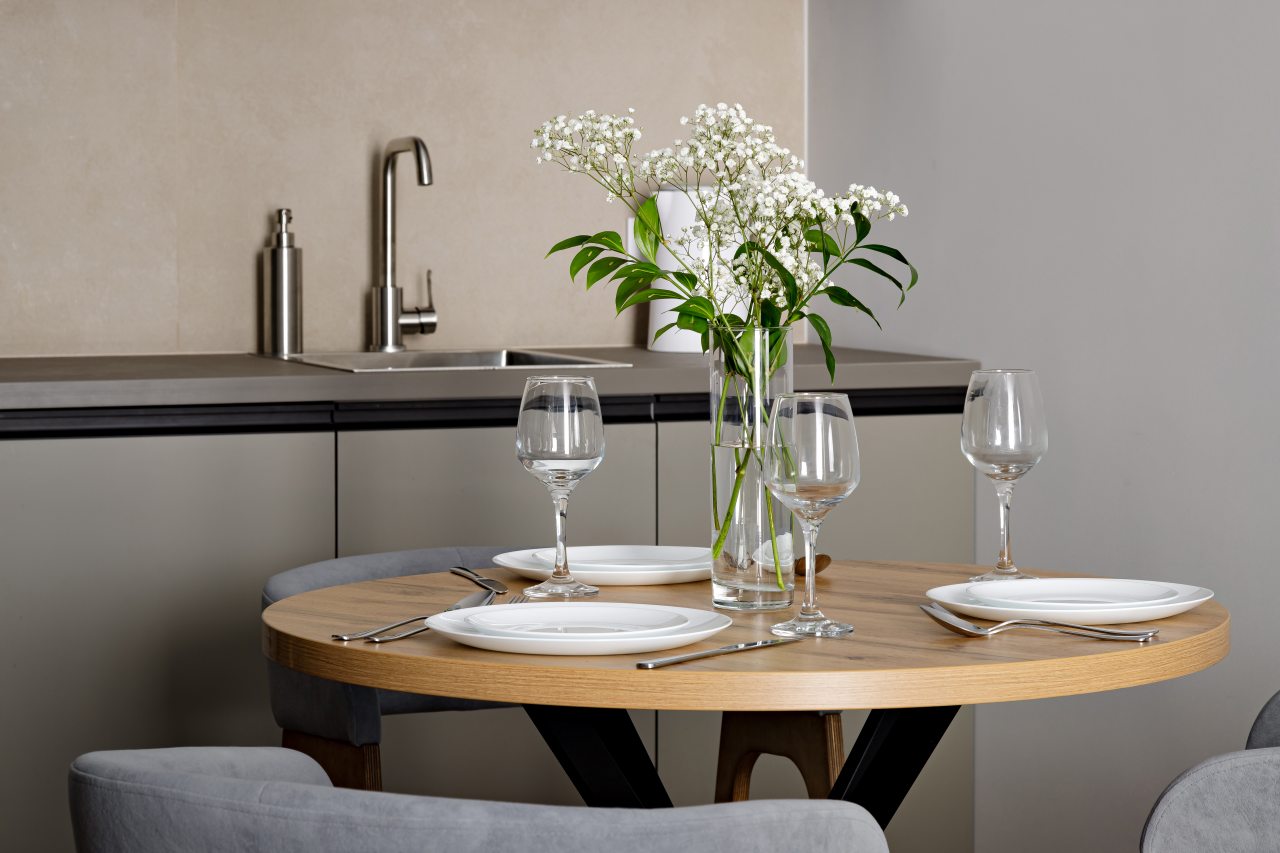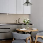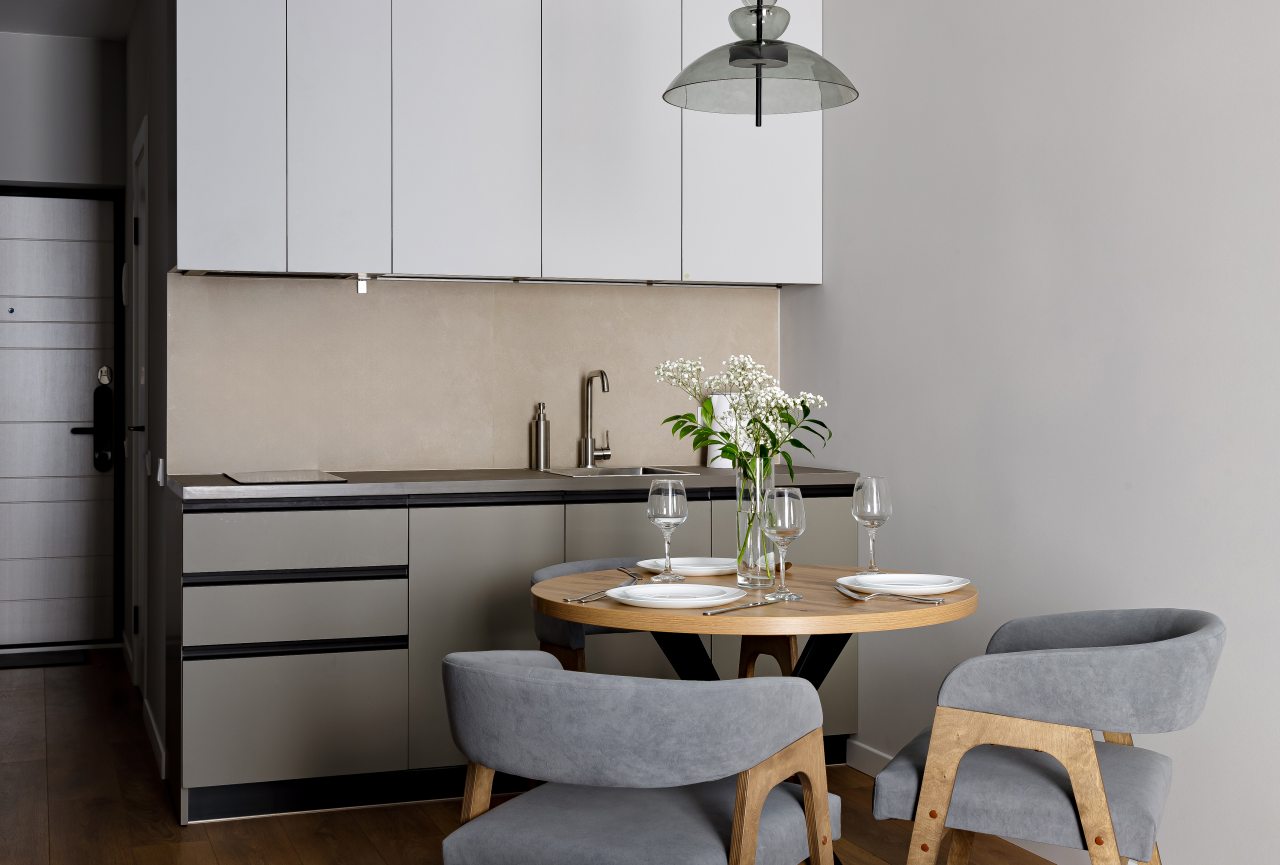 Кухонная зона оборудована комплектом стильного гарнитура, варочной панелью, вытяжкой, электрочайником, холодильником, микроволновой печью, духовым шкафом и обеденным столом.