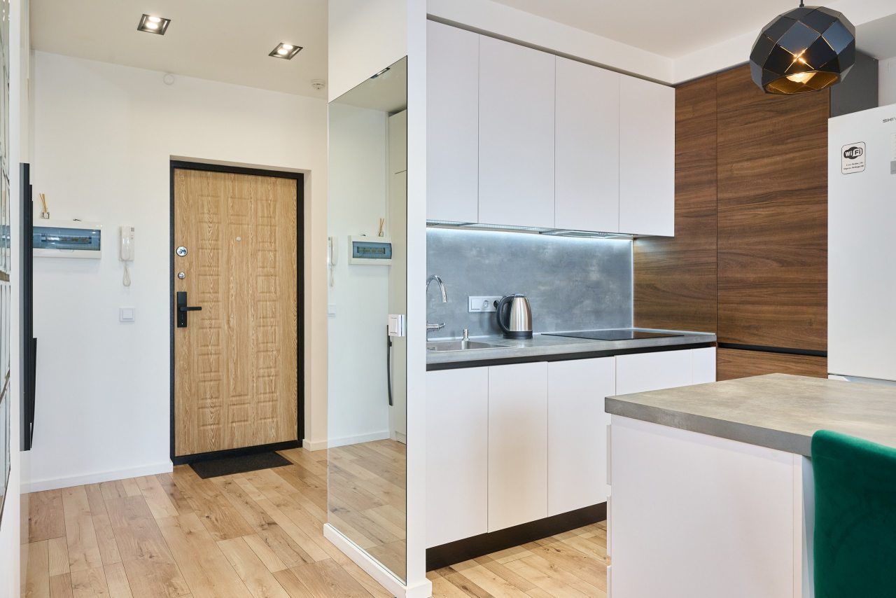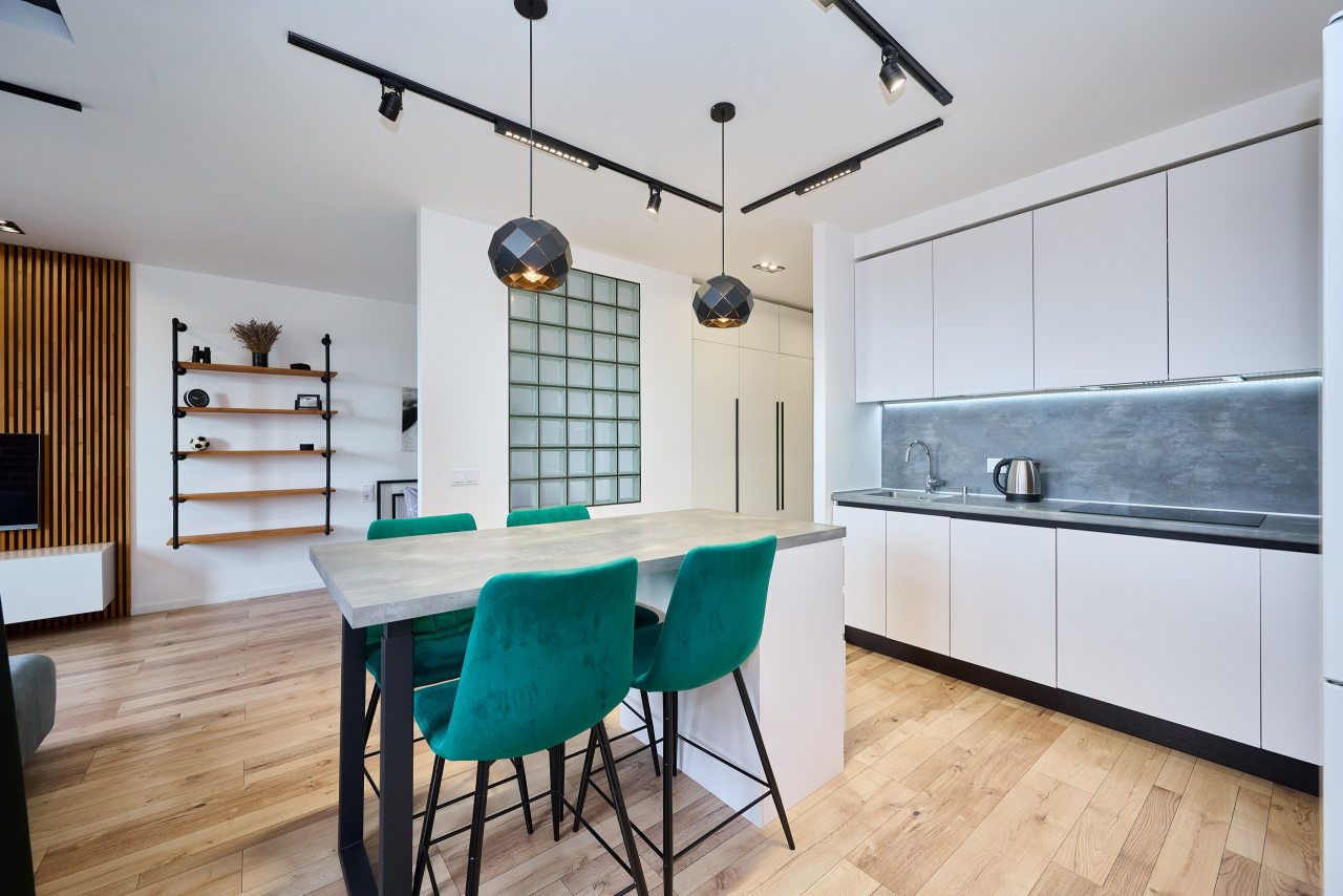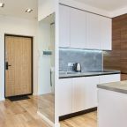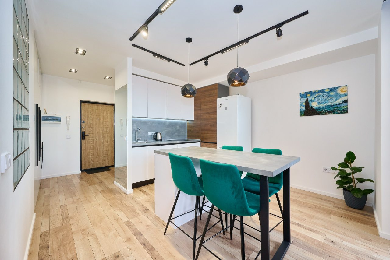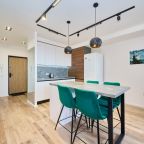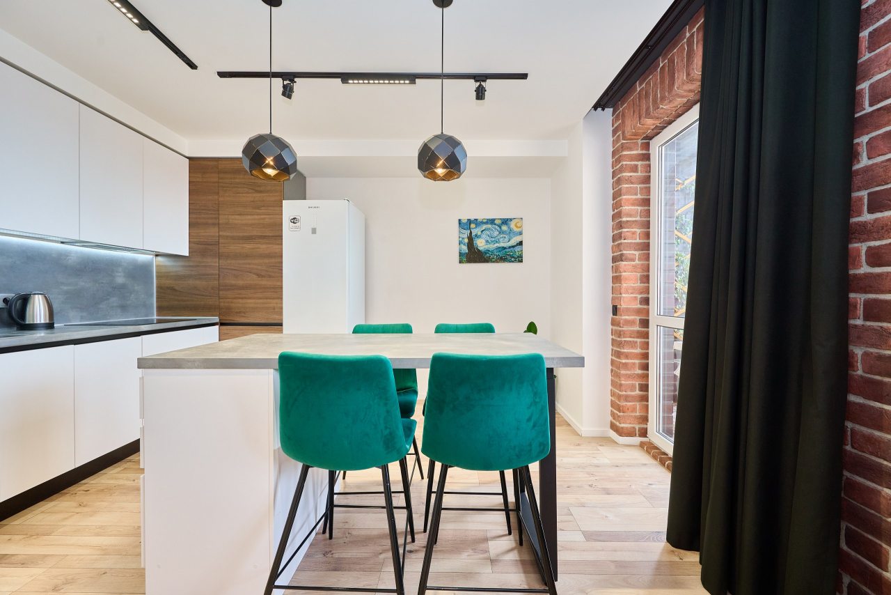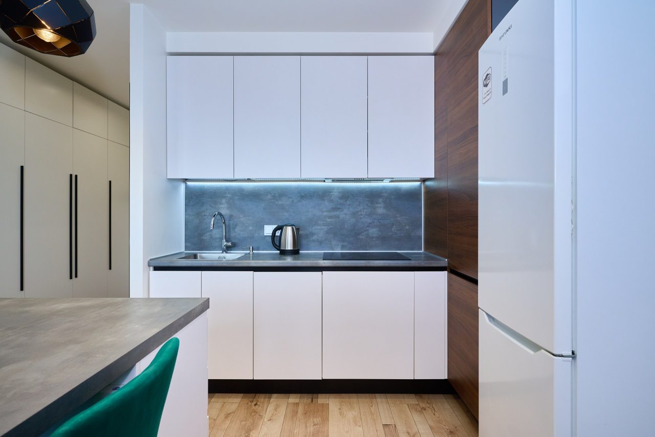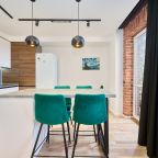 Кухня укомплектована стильным гарнитуром и необходимой бытовой техникой. Пообедать можно в одном из ближайших кафе.