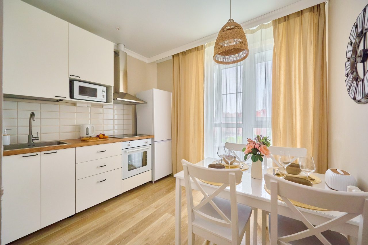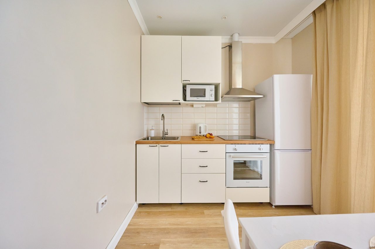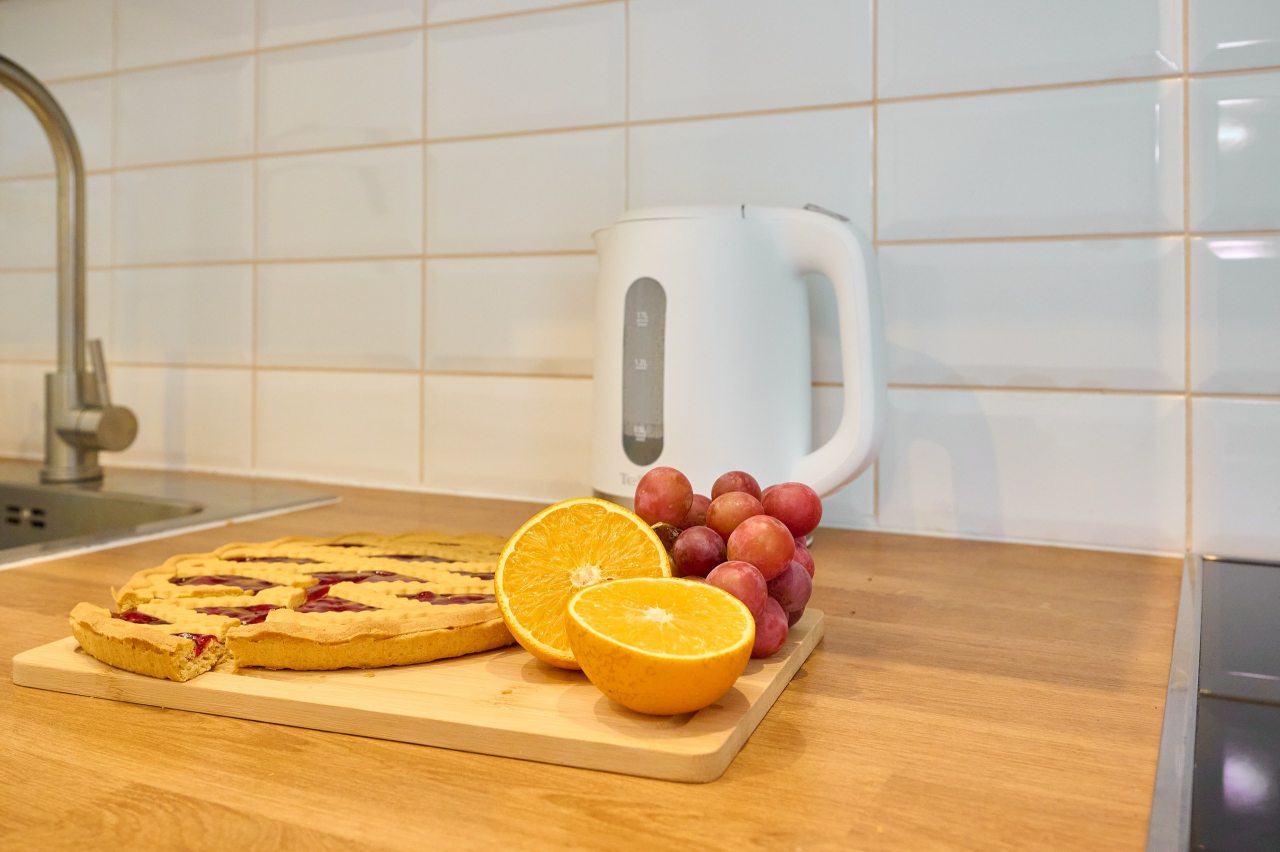 Для приготовления любимых домашних блюд и напитков имеются варочная панель, СВЧ, духовой шкаф, чайник, фильтр для воды, холодильник и обеденная зона.