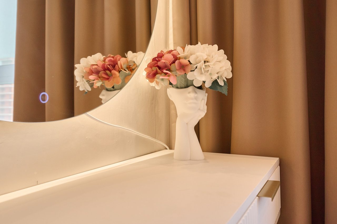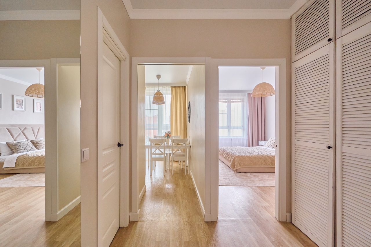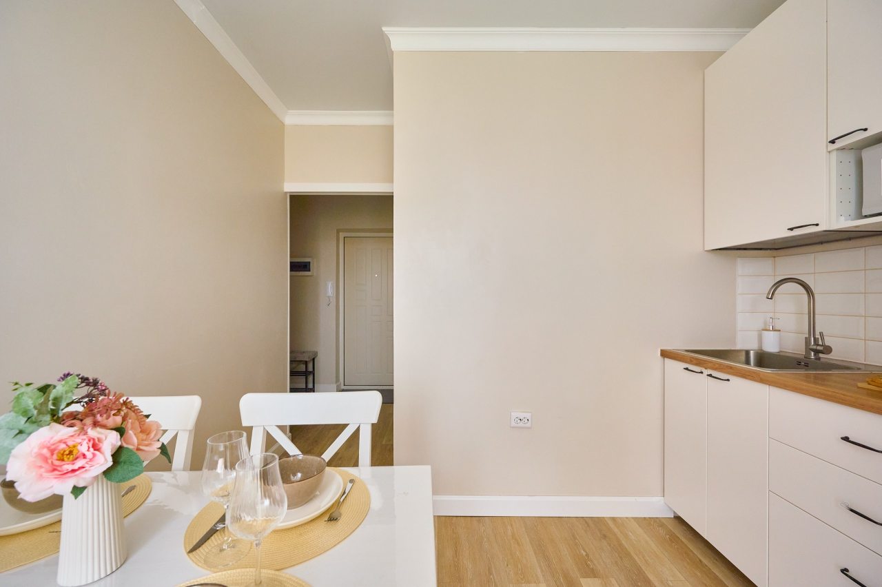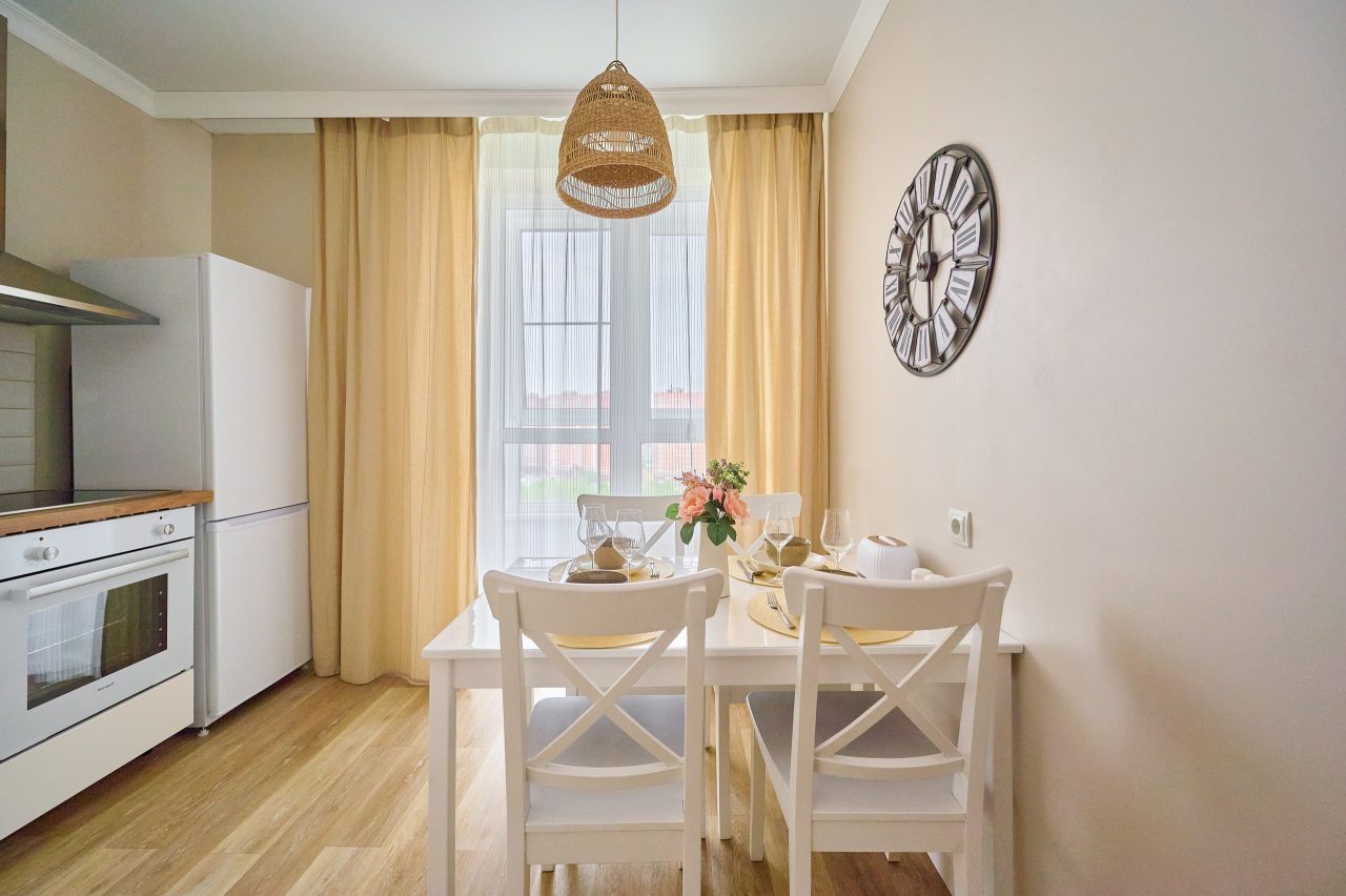 Для приготовления любимых домашних блюд и напитков имеются варочная панель, СВЧ, духовой шкаф, чайник, фильтр для воды, холодильник и обеденная зона.