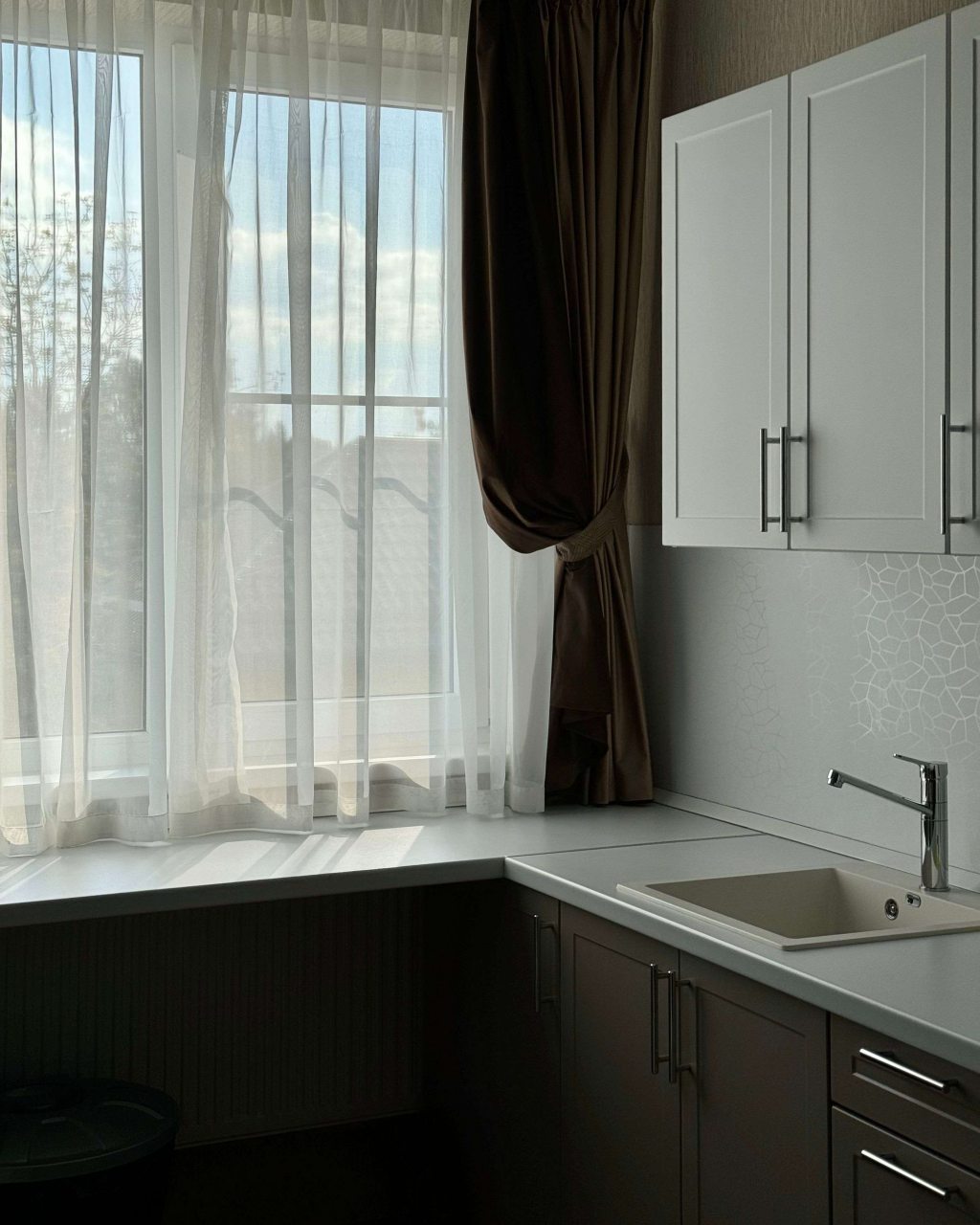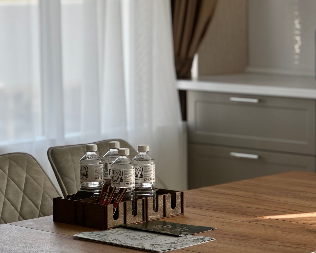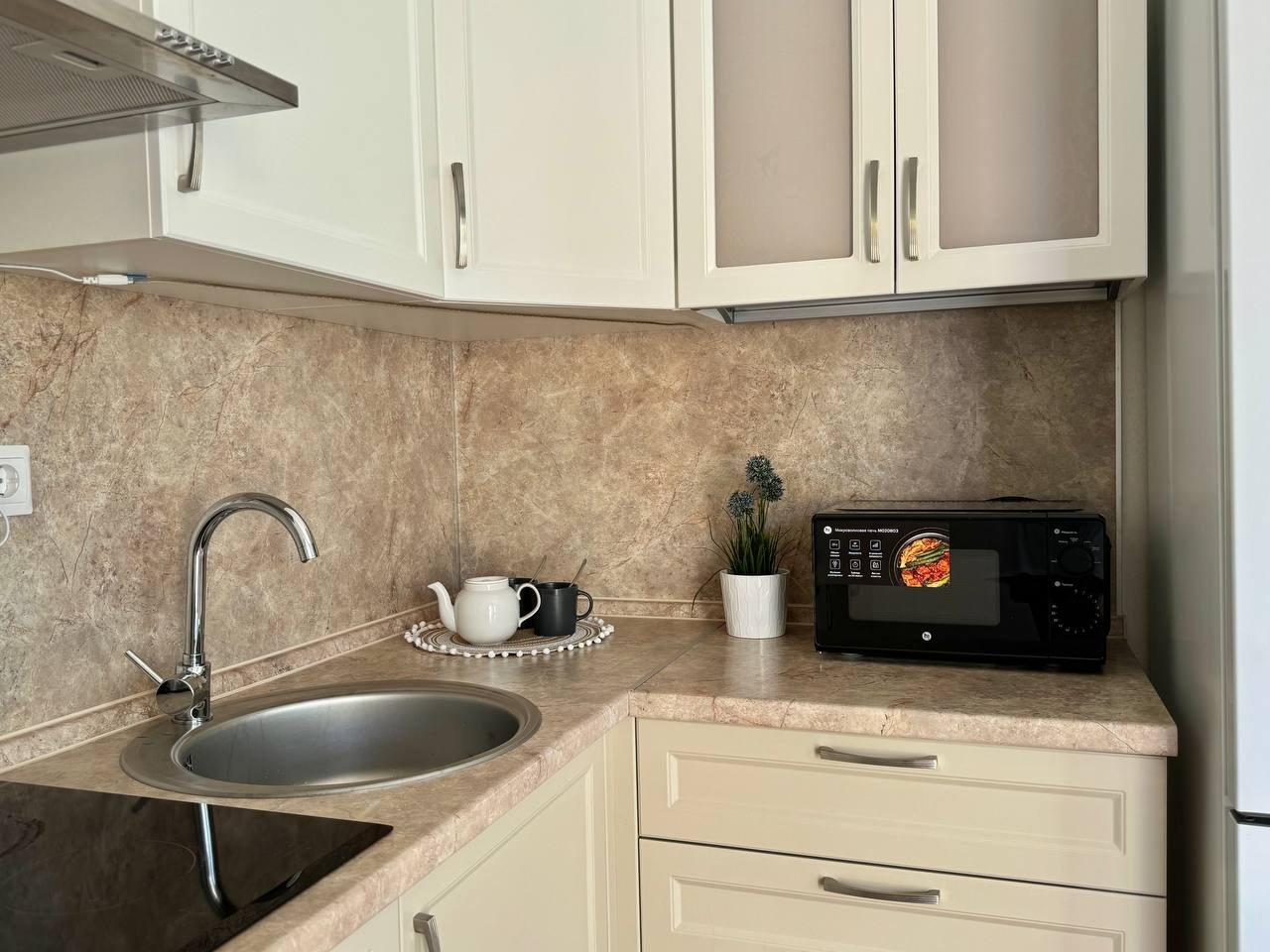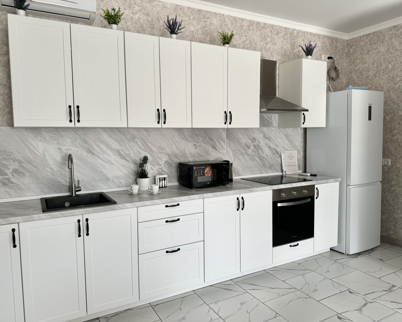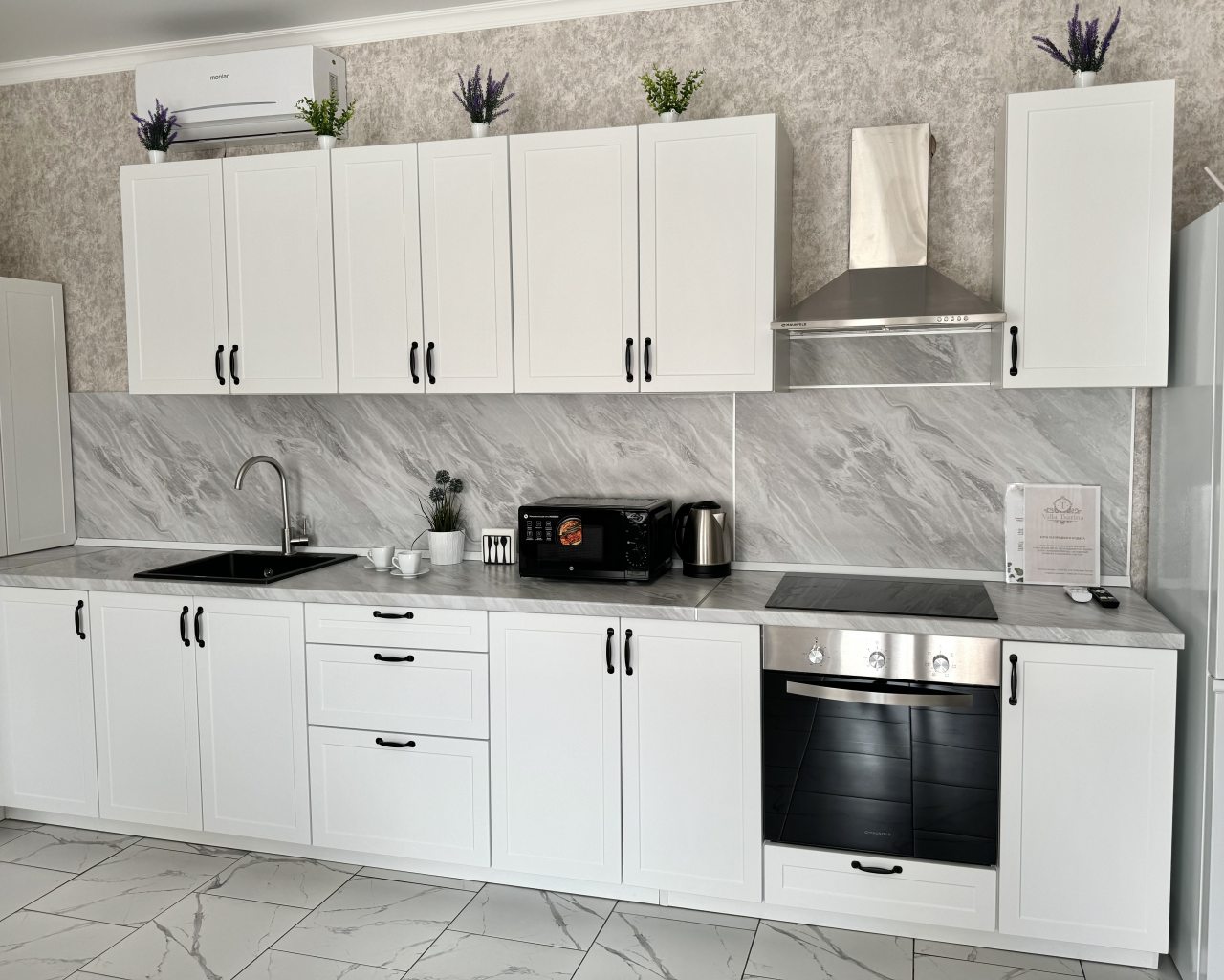Гости могут самостоятельно готовит на кухонной зоне, которая оснащена вытяжкой, варочной панелью, микроволновой печью, духовым шкафом и электрочайником.